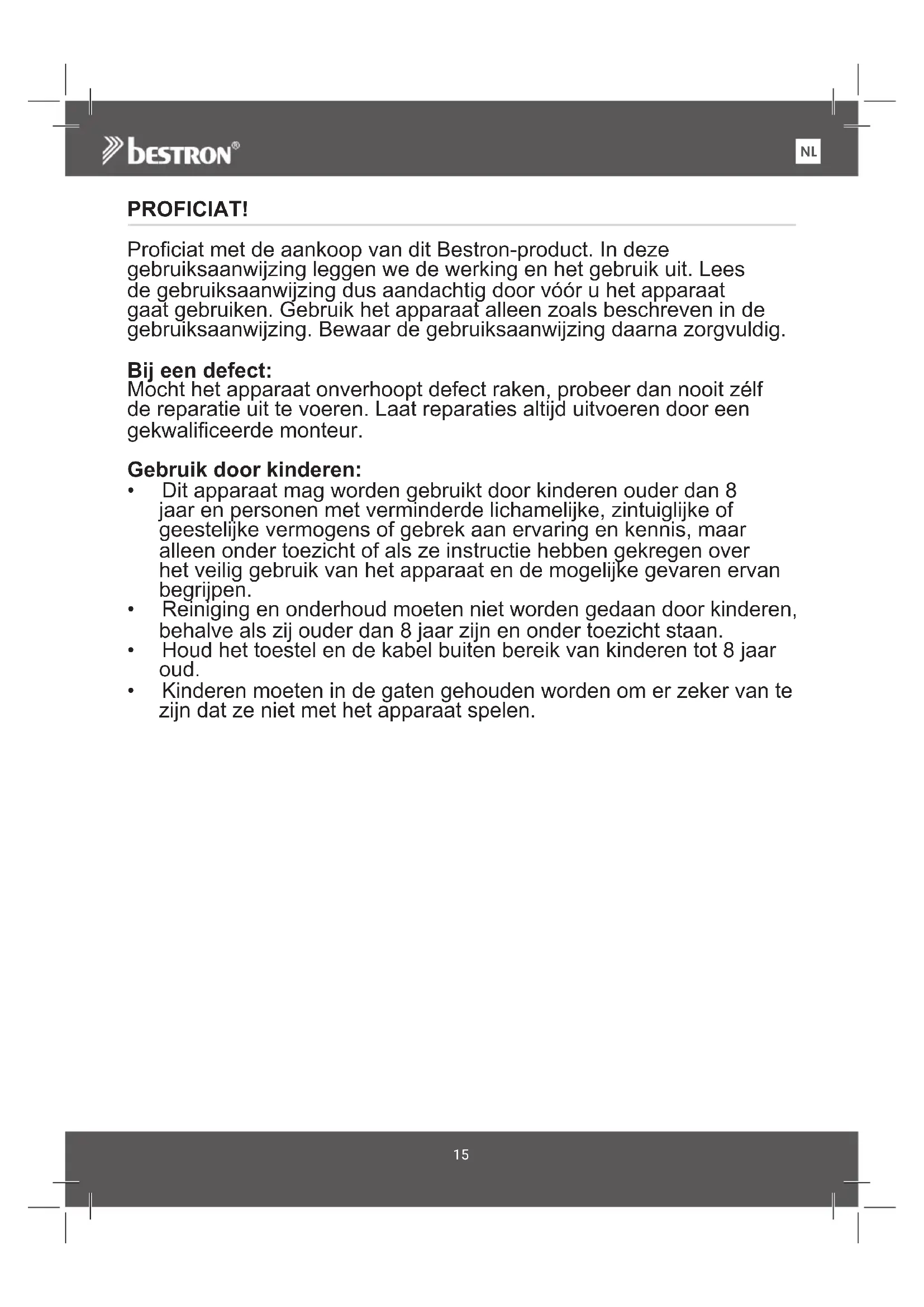 PROFICIAT! Proficiat met de aankoop van dit Bestron-product. In deze gebruiksaanwijzing leggen we de werking en het gebruik uit. Lees de gebruiksaanwijzing dus aandachtig door vóór u het apparaat gaat gebruiken. Gebruik het apparaat alleen zoals beschreven in de gebruiksaanwijzing. Bewaar de gebruiksaanwijzing daarna zorgvuldig. Bij een defect: Mocht het apparaat onverhoopt defect raken, probeer dan nooit zélf de reparatie uit te voeren. Laat reparaties altijd uitvoeren door een gekwalificeerde monteur. Gebruik door kinderen: