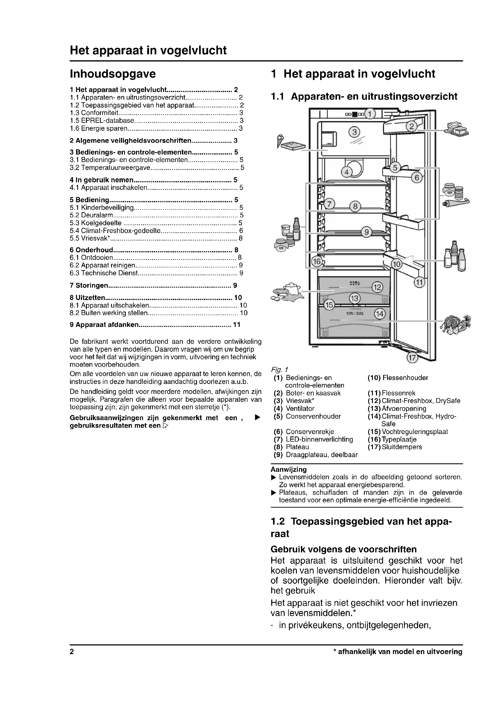 Fig. 1 (1) Bedienings- encontrole-elementen(10) Flessenhouder (2) Boter- en kaasvak (11) Flessenrek (3) Vriesvak* (12) Climat-Freshbox, DrySafe (4) Ventilator (13) Afvoeropening (5) Conservenhouder (14) Climat-Freshbox, Hydro- Safe (6) Conservenrekje (15) Vochtreguleringsplaat (7) LED-binnenverlichting (16) Typeplaatje (8) Plateau (17) Sluitdempers (9) Draagplateau, deelbaarAanwijzing