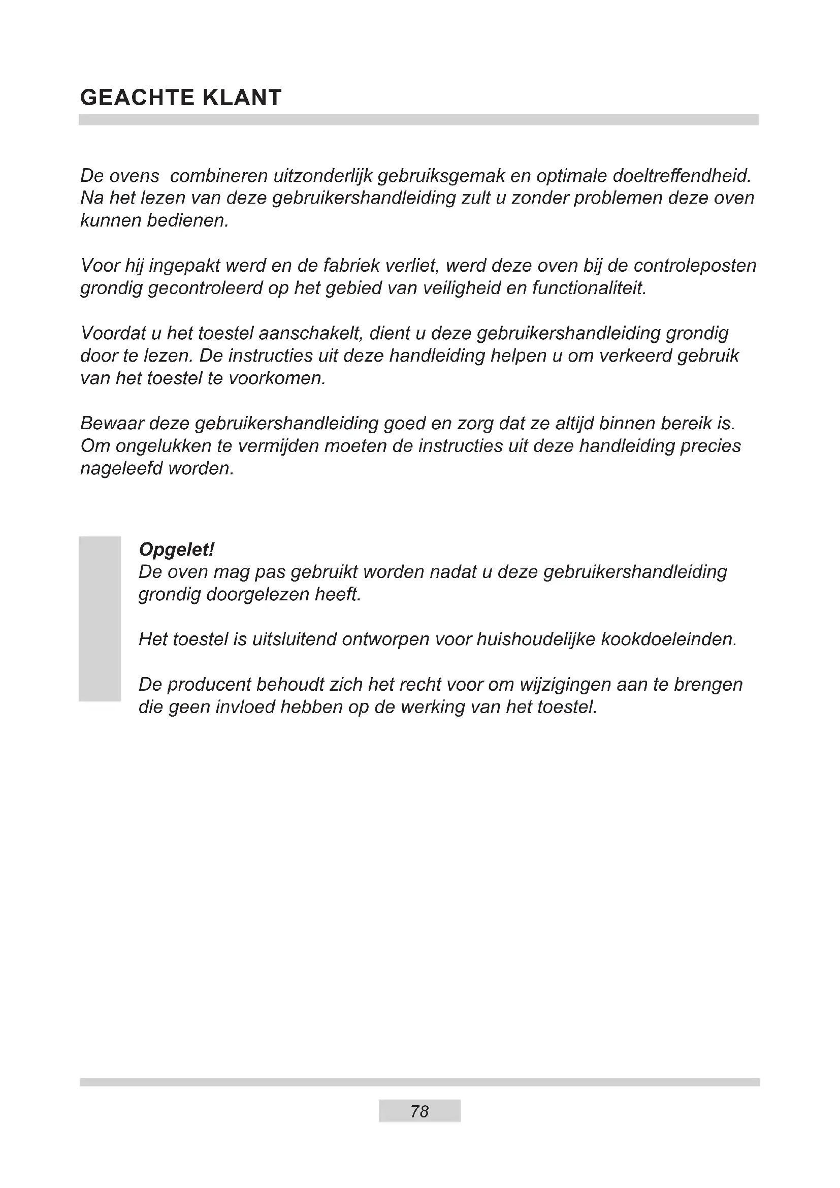 work. The bulb is loose or damaged. Tighten up or replace the blown bulb (see ‘Cleaning and Maintenance’).77 Voltage rating 230V~50 Hz Power rating max. 2,0 kW Cooker dimensions H/W/D 59,5 / 59,5 / 57,5 cm TECHNICAL DATA Certicate of compliance CE The Manufacturer hereby declares that this product complies with the general requirements pursuant to the following European Directives: The Low Voltage Directive 2014/35/EC, l Electromagnetic Compatibility Directive 2014/30/EC, ErP Directive 2009/125/EC, and therefore the product has been marked with the symbol and the Declaration of Conformity has been issued to the manufacturer and is available to the competent authorities regulating the market. Basic Information: The product meets the requirements of European standards EN 60335- 1; EN60335-2-6. The data on the energy labels of electric ovens is given according to standard EN 60350-1 / IEC 60350-1. These values are dened with a standard workload a with the functions active: bottom and top heaters (conventional heating) and fan assisted heating (forced air heating), if these functions are available. The energy eciency class was assigned depending on the function available in the product in accordance with the priority below: During energy consumption test, remove the telescopic runners (if the product is tted with any). Forced air circulation ECO (ring heater + fan) Forced air circulation ECO (bottom heater + top + roaster + fan) Forced air circulation ECO (bottom heater + top + fan) Conventional mode ECO (bottom heater + top)78 GEACHTE KLANT De ovens combineren uitzonderlijk gebruiksgemak en optimale doeltreendheid. Na het lezen van deze gebruikershandleiding zult u zonder problemen deze oven kunnen bedienen. Voor hij ingepakt werd en de fabriek verliet, werd deze oven bij de controleposten grondig gecontroleerd op het gebied van veiligheid en functionaliteit. Voordat u het toestel aanschakelt, dient u deze gebruikershandleiding grondig door te lezen. De instructies uit deze handleiding helpen u om verkeerd gebruik van het toestel te voorkomen. Bewaar deze gebruikershandleiding goed en zorg dat ze altijd binnen bereik is. Om ongelukken te vermijden moeten de instructies uit deze handleiding precies nageleefd worden. Opgelet! De oven mag pas gebruikt worden nadat u deze gebruikershandleiding grondig doorgelezen heeft. Het toestel is uitsluitend ontworpen voor huishoudelijke kookdoeleinden. De producent behoudt zich het recht voor om wijzigingen aan te brengen die geen invloed hebben op de werking van het toestel. NL79 VEILIGHEIDSINSTRUCTIES Attentie. Dit apparaat en de bereikbare onderdelen ervan worden tijdens het gebruik heet. Wees bijzonder voorzich- tig bij het aanraken van de verwarmingselementen. Zorg dat kinderen die jonger zijn dan 8 jaar niet bij het apparaat kunnen komen, tenzij ze onder permanent toezicht staan. Dit apparaat mag gebruikt worden door kinderen van 8 jaar en ouder en personen met lichamelijke of geestelijke beperkingen of personen zonder ervaring met of kennis van het apparaat, als dit gebruik plaatsvindt onder toezicht of in overeenstemming met de gebruiksaanwijzing van het apparaat, door personen die verantwoordelijk zijn voor hun veiligheid. Zorg ervoor dat kinderen niet met het apparaat kunnen spelen. Kinderen mogen de kookplaat niet zonder toezicht schoonmaken of onderhoudswerkzaamheden ver- richten. Tijdens het gebruik wordt het toestel heet. Wees voorzichtig en raak de hete onderdelen in de oven niet aan. Als dit apparaat gebruikt wordt, kunnen de bereikbare onderdelen heet worden. Laat geen kinderen bij de oven komen. Attentie. Gebruik geen schurende schoonmaakmiddelen of scherpe metalen voorwerpen voor het schoonmaken van het glas van de deur, omdat deze krassen kunnen veroorzaken op het oppervlak. Dit kan leiden tot barsten van het glas.80 VEILIGHEIDSINSTRUCTIES ● Zorg ervoor dat er geen kleine keukentoestellen of hun kabels in direct contact komen met de hete oven, want de isolatie van deze toestellen is niet bestand tegen hoge temperaturen. ● Laat de oven niet achter zonder toezicht terwijl u kookt. Oliën en vetten kunnen ontvlammen als gevolg van oververhitting. ● Plaats geen schotels met een gewicht van meer dan 15 kg op de open deur van de oven. ● Gebruik geen schurende reinigingsmiddelen of scherpe metalen voorwerpen om de glazen deur te reinigen. Hierdoor kan het oppervlak gekrast raken, wat kan leiden tot barsten in het glas. ● Het is verboden om een oven met technische defecten te gebruiken. Defecten mogen enkel hersteld worden door een erkend technicus met gepaste kwalica- ties. ● Bij problemen veroorzaakt door technische defecten, moet de oven van het stroomnet ontkoppeld worden. ● U moet steeds de regels en richtlijnen uit deze handleiding naleven. Het toestel mag niet bediend worden door personen die deze handleiding niet kennen. ● Het toestel is uitsluitend ontworpen voor kookdoeleinden. Elke andere toepassing (bv. voor het verwarmen van ruimtes) stemt niet overeen met de bestemming van het toestel en kan gevaar veroorzaken. Attentie. Om elektrocutie te vermijden dient u het toestel uit te schakelen vooraleer u het lampje vervangt. Gebruik geen stoomreinigers voor het schoonmaken van het fornuis. Gevaar voor verbranding! Bij het openen van de ovendeur kan hete stoom ontsnappen. Wees voorzichtig met het ope- nen van de deur tijdens of na aoop van het koken. Buig u bij het openen niet over de deur. Vergeet niet dat stoom bij bepaalde temperaturen onzichtbaar kan zijn.81 ● Sluit de deur van de oven zorgvuldig. Er ontsnapt warmte via het vuil dat zich op de afdichtingen de deur van de oven be- vindt. Verwijder dit vuil best onmiddellijk. ● Bouw de oven niet in in de onmiddel- lijke nabijheid van koelkasten of diep- vriezers. Het energiegebruik van deze toestellen stijgt hierdoor onnodig. ENERGIEBESPARING Door op verantwoorde wijze energie te gebruiken be- spaart u niet alleen op de kosten van het huishouden, maar werkt u oo