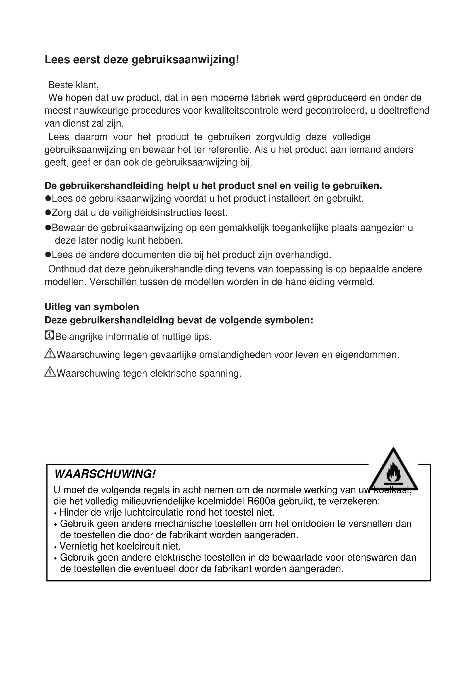 - Lebensmittel berühren eventuell den oberen Teil der Schublade. >>> Ordnen Sie die Lebensmittel in der Schublade anders an.Lees eerst deze gebruiksaanwijzing! Beste klant, We hopen dat uw product, dat in een moderne fabriek werd geproduceerd en onder de meest nauwkeurige procedures voor kwaliteitscontrole werd gecontroleerd, u doeltreffend van dienst zal zijn. Lees daarom voor het product te gebruiken zorgvuldig deze volledige gebruiksaanwijzing en bewaar het ter referentie. Als u het product aan iemand anders geeft, geef er dan ook de gebruiksaanwijzing bij. De gebruikershandleiding helpt u het product snel en veilig te gebruiken. Lees de gebruiksaanwijzing voordat u het product installeert en gebruikt. Zorg dat u de veiligheidsinstructies leest. Bewaar de gebruiksaanwijzing op een gemakkelijk toegankelijke plaats aangezien u deze later nodig kunt hebben. Lees de andere documenten die bij het product zijn overhandigd. Onthoud dat deze gebruikershandleiding tevens van toepassing is op bepaalde andere modellen. Verschillen tussen de modellen worden in de handleiding vermeld. Uitleg van symbolen Deze gebruikershandleiding bevat de volgende symbolen: Belangrijke informatie of nuttige tips. Waarschuwing tegen gevaarlijke omstandigheden voor leven en eigendommen. Waarschuwing tegen elektrische spanning. WAARSCHUWING! U moet de volgende regels in acht nemen om de normale werking van uw koelkast, die het volledig milieuvriendelijke koelmiddel R600a gebruikt, te verzekeren: Hinder de vrije luchtcirculatie rond het toestel niet. Gebruik geen andere mechanische toestellen om het ontdooien te versnellen dan de toestellen die door de fabrikant worden aangeraden. Vernietig het koelcircuit niet. Gebruik geen andere elektrische toestellen in de bewaarlade voor etenswaren dan de toestellen die eventueel door de fabrikant worden aangeraden.INHOUD 2 NL 1 Uw koelkast 34 2 Belangrijke veiligheidswaarschuwingen 4 Bedoeld gebruik 4 Algemene veiligheid 4 Voor producten met een waterdispenser 6 Kinderbeveiliging 6 Voldoet aan de WEEE-richtlijn en de richtlijnen voor afvoeren van het restproduct 6 Verpakkingsinformatie 7 HCA-waarschuwing 7 Aanwijzingen ter besparing van energie 7 3 Installatie 8 Punten waarop gelet moet worden bij de verplaatsing van een koelkast 8 Voordat u de koelkast inschakelt 8 Elektrische aansluiting 8 Afvoeren van de verpakking 8 Afvoeren van uw oude koelkast 9 Plaatsing en installatie 9 Het vervangen van de lamp 9 De openingsrichting van de deur Wijzigen 9 Stelvoetjes aanpassen 9 4 Voorbereiding 10 5 Gebruik van uw koelkast 11 Indicatorpaneel 11 Tweeledig koelsysteem 13 Verse levensmiddelen invriezen 14 Vak voor beperkt houdbaar voedsel 14 Aanbeveling voor het bewaren van diepvriesvoedsel 15 Ontdooien 15 Het plaatsen van de levensmiddelen 15 Diepvriesinformatie 16 Aanbevelingen voor het gedeelte 16 6 Onderhoud en reiniging 17 Bescherming van de plastic oppervlakken 17 7 Probleemoplossing 18Uw koelkast