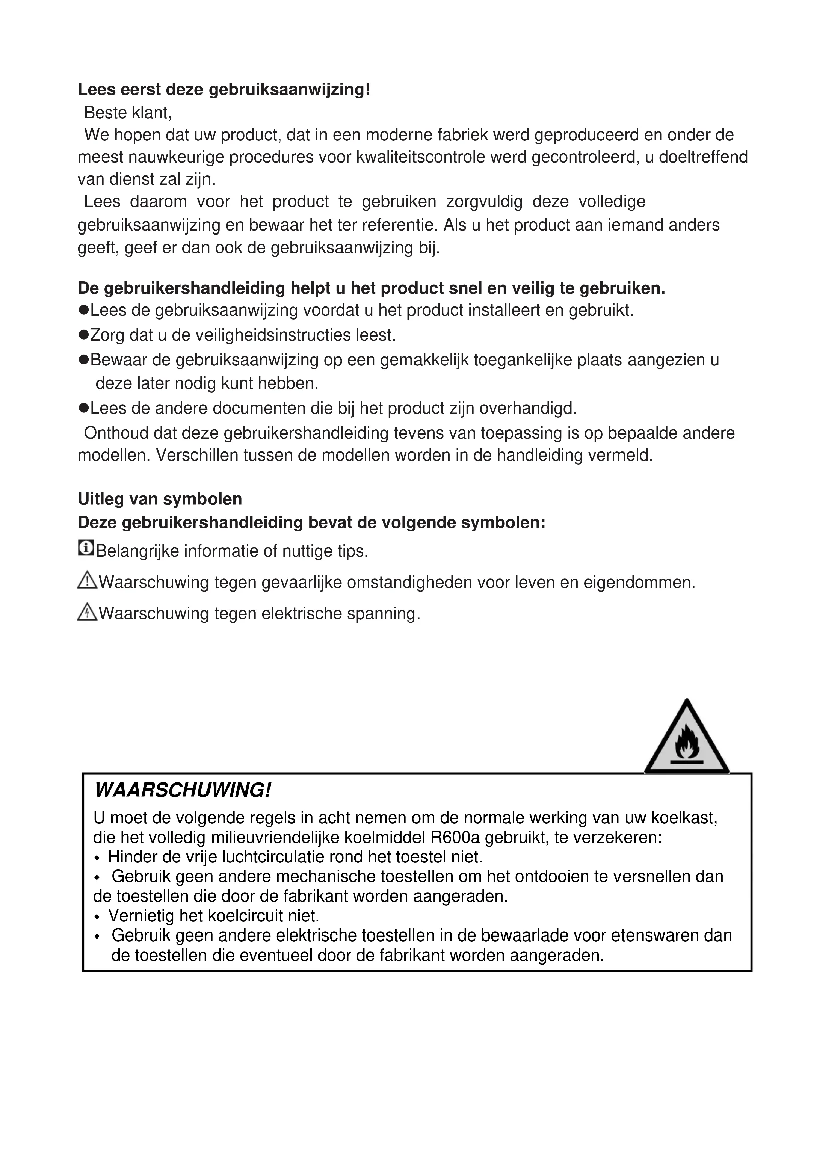 - Il se peut que les denrées touchent le plafond du tiroir. >>>Disposez à nouveau les denrées dans le tiroir.Lees eerst deze gebruiksaanwijzing! Beste klant, We hopen dat uw product, dat in een moderne fabriek werd geproduceerd en onder de meest nauwkeurige procedures voor kwaliteitscontrole werd gecontroleerd, u doeltreffend van dienst zal zijn. Lees daarom voor het product te gebruiken zorgvuldig deze volledige gebruiksaanwijzing en bewaar het ter referentie. Als u het product aan iemand anders geeft, geef er dan ook de gebruiksaanwijzing bij. De gebruikershandleiding helpt u het product snel en veilig te gebruiken. Lees de gebruiksaanwijzing voordat u het product installeert en gebruikt. Zorg dat u de veiligheidsinstructies leest. Bewaar de gebruiksaanwijzing op een gemakkelijk toegankelijke plaats aangezien u deze later nodig kunt hebben. Lees de andere documenten die bij het product zijn overhandigd. Onthoud dat deze gebruikershandleiding tevens van toepassing is op bepaalde andere modellen. Verschillen tussen de modellen worden in de handleiding vermeld. Uitleg van symbolen Deze gebruikershandleiding bevat de volgende symbolen: Belangrijke informatie of nuttige tips. Waarschuwing tegen gevaarlijke omstandigheden voor leven en eigendommen. Waarschuwing tegen elektrische spanning. WAARSCHUWING! U moet de volgende regels in acht nemen om de normale werking van uw koelkast, die het volledig milieuvriendelijke koelmiddel R600a gebruikt, te verzekeren: Hinder de vrije luchtcirculatie rond het toestel niet. Gebruik geen andere mechanische toestellen om het ontdooien te versnellen dan de toestellen die door de fabrikant worden aangeraden. Vernietig het koelcircuit niet. Gebruik geen andere elektrische toestellen in de bewaarlade voor etenswaren dan de toestellen die eventueel door de fabrikant worden aangeraden.INHOUD 2 NL 1 Uw koelkast 34 2 Belangrijke veiligheidswaarschuwingen 4 Bedoeld gebruik 4 Algemene veiligheid 4 Voor producten met een waterdispenser 6 Kinderbeveiliging 6 Voldoet aan de WEEE-richtlijn en de richtlijnen voor afvoeren van het restproduct 6 Verpakkingsinformatie 7 HCA-waarschuwing 7 Aanwijzingen ter besparing van energie 7 3 Installatie 8 Punten waarop gelet moet worden bij de verplaatsing van een koelkast 8 Voordat u de koelkast inschakelt 8 Elektrische aansluiting 8 Afvoeren van de verpakking 8 Afvoeren van uw oude koelkast 9 Plaatsing en installatie 9 Het vervangen van de lamp 9 De openingsrichting van de deur Wijzigen 9 Stelvoetjes aanpassen 9 4 Voorbereiding 10 5 Gebruik van uw koelkast 11 Indicatorpaneel 11 Tweeledig koelsysteem 13 Verse levensmiddelen invriezen 14 Vak voor beperkt houdbaar voedsel 14 Aanbeveling voor het bewaren van diepvriesvoedsel 15 Ontdooien 15 Het plaatsen van de levensmiddelen 15 Diepvriesinformatie 16 Aanbevelingen voor het gedeelte 16 6 Onderhoud en reiniging 17 Bescherming van de plastic oppervlakken 17 7 Probleemoplossing 18Uw koelkast