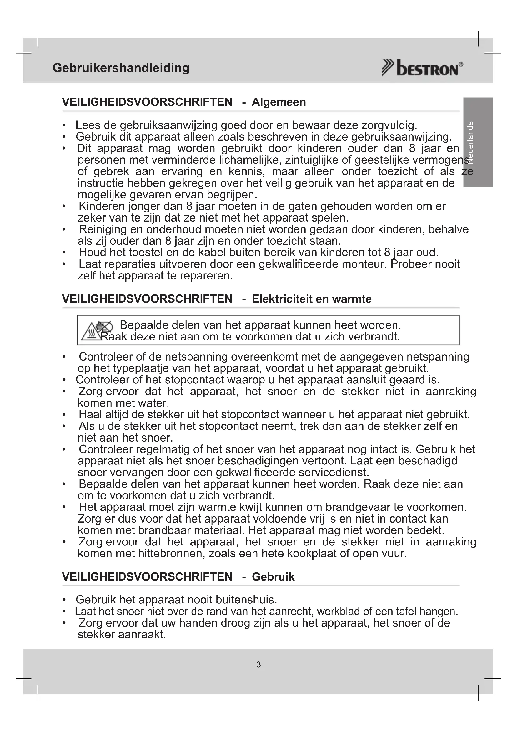 - Zorg ervoor dat het apparaat, het snoer en de stekker niet in aanraking komen met hittebronnen, zoals een hete kookplaat of open vuur. VEILIGHEIDSVOORSCHRIFTEN - Gebruik