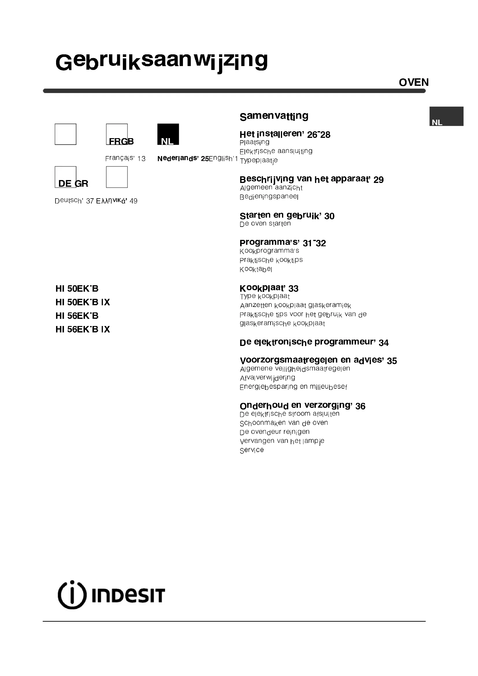 Nettoyage et entretienOVEN Samenvatting Het installeren, 26-28 Plaatsing Elektrische aansluiting Typeplaatje Beschrijving van het apparaat, 29 Algemeen aanzicht Bedieningspaneel Starten en gebruik, 30 De oven starten Programmas, 31-32 Kookprogrammas Praktische kooktips Kooktabel Kookplaat, 33 Type kookplaat Aanzetten kookplaat glaskeramiek Praktische tips voor het gebruik van de glaskeramische kookplaat De elektronische programmeur, 34 Voorzorgsmaatregelen en advies, 35 Algemene veiligheidsmaatregelen Afvalverwijdering Energiebesparing en milieubesef Onderhoud en verzorging, 36 De elektrische stroom afsluiten Schoonmaken van de oven De ovendeur reinigen Vervangen van het lampje Service Gebruiksaanwijzing