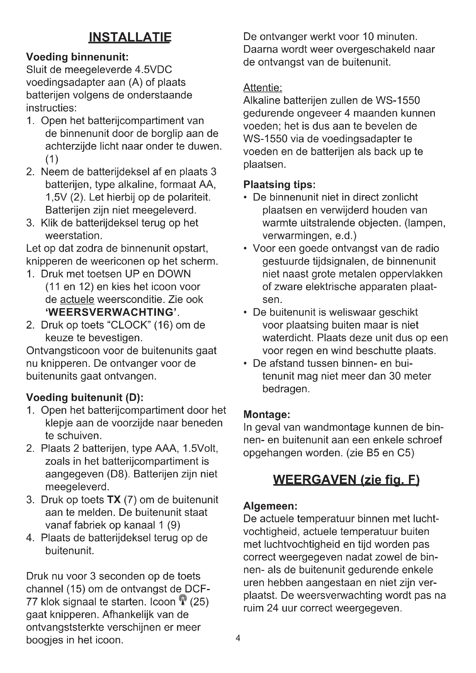 - De afstand tussen binnen- en bui- tenunit mag niet meer dan 30 meter bedragen. Montage: In geval van wandmontage kunnen de bin- nen- en buitenunit aan een enkele schroef opgehangen worden. (zie B5 en C5) WEERGAVEN (zie g. F) Algemeen: De actuele temperatuur binnen met lucht- vochtigheid, actuele temperatuur buiten met luchtvochtigheid en tijd worden pas correct weergegeven nadat zowel de bin- nen- als de buitenunit gedurende enkele uren hebben aangestaan en niet zijn ver- plaatst. De weersverwachting wordt pas na ruim 24 uur correct weergegeven.5 Display weergave: Het display geeft de weersverwachting in icoon vorm aan. Tevens zijn er een 4-tal hoofdfuncties die het display kan weergeven. Namelijk: Binnen- en buitentemperatuur, binnen- en buitenluchtvochtigheid, datum en de tijd. Met de toets “light on/off” (17) van de WS- 1550 kunt u de achtergrond verlichting bedienen. Met de toets “MODE” (10) kunt u achtereenvolgens de functies “datum” en “jaartal” laten zien. Bij ontvangst van het DCF signaal verschijnt de datum. (DCF) tijd: Als in het midden van de tijd het symbool oplicht (25), dan is de klok gesynchroni- seerd met de atoomtijd die door de zender ‘DCF77’ radiograsch wordt verstuurd. Als dit symbool niet oplicht dan wordt de tijd via de interne klok van de WS-1550 weerge- geven. De DCF77 zender staat in Frankfurt, Duits- land. De ontvangst van de DCF77 tijd is in principe mogelijk in geheel West Europa. Temperatuur met luchtvochtigheid: Bij (19) wordt de binnentemperatuur weer- gegeven. Bij (20) wordt de luchtvochtigheid binnen weergegeven in %. Bij (33) wordt de buitentemperatuur weer- gegeven. Bij (32) wordt de luchtvochtigheid buiten weergegeven in % Druk op toets C/F (14) om te wisselen tus- sen weergaven in ºCelsius of ºFahrenheit. Weersverwachting: Bij (22) wordt de weersverwachting weer- gegeven in vorm van icoontjes: Aan de hand van de temperatuur en luchtvochtigheid berekend de WS-1550 het weer voor de komende 12-24 uur. Met de tendens pijltjes wordt het verloop weerge- geven (30). Bij het aansluiten van de voedingsadapter of het plaatsen van de batterij dient de actuele weersconditie te worden ingesteld door middel van het juiste icoon te kiezen. Kies bij bewolkt weer het wolkje. Kies bij zonnig weer het zonnetje etc. WEER ICONEN AANPASEN: Druk op toets NEXT (13) en houdt deze 3 seconden totdat het display gaat knipperen. Druk toets UP (11) of DOWN (12) om de weericonen aan te passen aan het actuele weer. Druk op toets CLOCK (16) om de aanpassing vast te leggen. De weerverwachting is nu ingesteld. De verwachting is van toepassing op een gebied van omstreeks 30-50km rond de WS-1550. De verwachtingsnauwkeurigheid bedraagt 70-75%. Let op dat geen garantie gegeven kan worden op het correct weer- geven van de verwachting. De WS-1550 kent de volgende verwachtingen: zonnig storm Sneeuw6 Regen Bewolkt Weergave buitenunit: Toets op CHANNEL (15) om te wis- selen tussen weergave van de kanalen (CH1/2/3). Kies het kanaal waar de buiten- unit op is ingesteld (9). Bij de keuze (28) wisselen de gegevens die worden weer- geven per kanaal. Dit heeft alleen zin bij gebruik van meerder buitenunits. Overig: Displayverlichting: Als de binnenunit via de voedingsadapter gevoed wordt, is de displayverlichting con- tinu ingeschakeld. Met toets On/Off (17) kan de verlichting worden aan of uitgezet. Wordt de binnenunit alleen met batterijen gevoed, dan licht de displayverlichting alleen op bij het indrukken van toets On/ Off (17). Om batterijen te sparen, dooft de displayverlichting na ongeveer 5 seconden. Batterij waarschuwing: Als de batterij indicatie ‘IN’ (21) oplicht zijn de batterijen in de binnenunit aan vervan- ging toe. Als de batterij indicatie ‘OUT’ (31) oplicht zijn de batterijen in de buitenunit met betreffende nummer aan vervanging toe. De LED op de buitenunit gaat ook knipperen als de batterijcapaciteit te laag is. Ontvangst radio tijdsignalen: Het antennesymbool (25) geeft aan dat de DC-77 ontvanger aanstaat om te ontvangen. Bij het opstarten zal de ontvan- ger 10 minuten aanstaan. Daarna zal de ontvanger aan gaan om te synchroniseren om 2.00 uur, 3.00 uur, 8.00 uur, 12.00 uur,