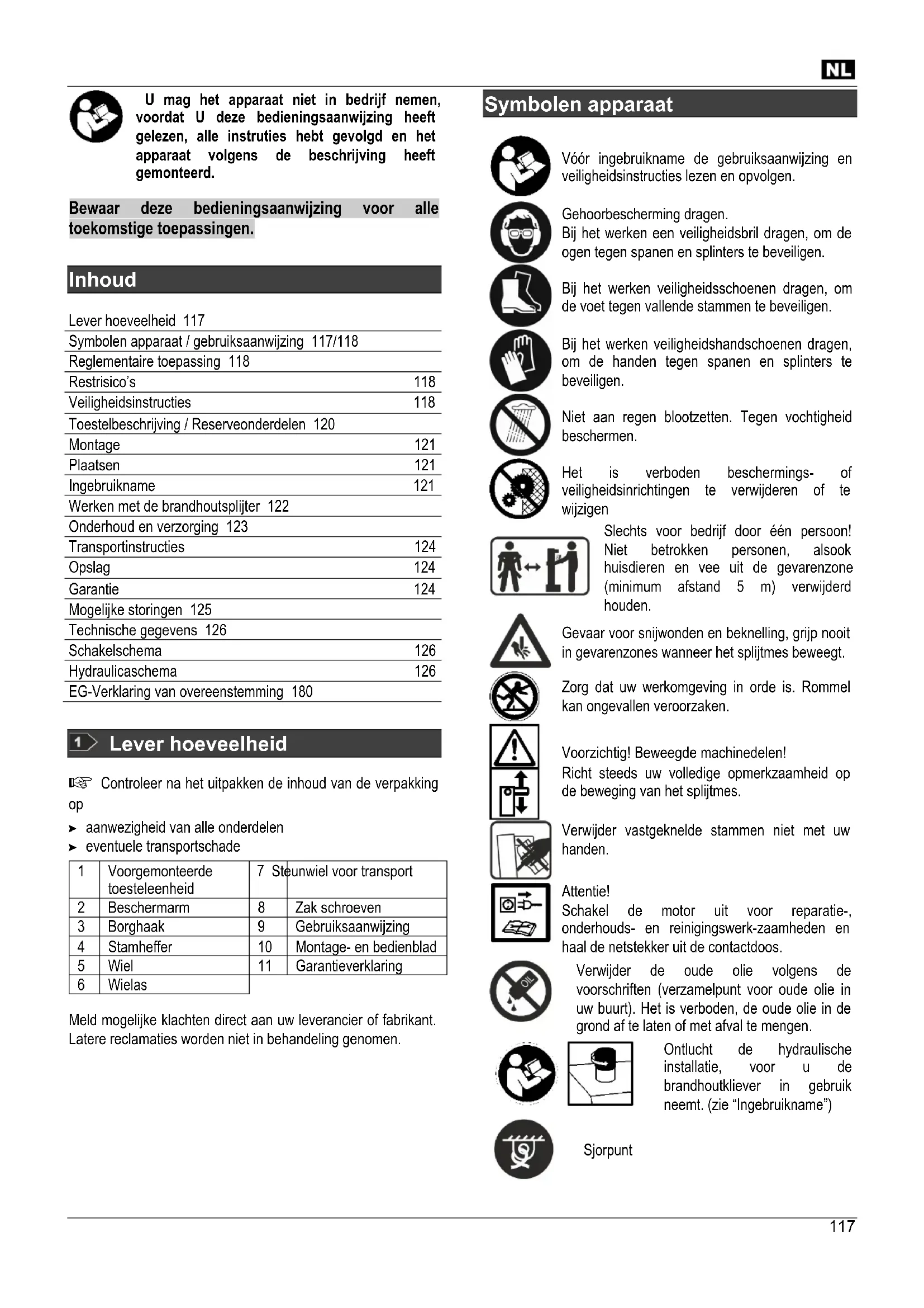 Inhoud Lever hoeveelheid 117 Symbolen apparaat / gebruiksaanwijzing 117/118 Reglementaire toepassing 118 Restrisico’s 118 Veiligheidsinstructies 118 Toestelbeschrijving / Reserveonderdelen 120 Montage 121 Plaatsen 121 Ingebruikname 121 Werken met de brandhoutsplijter 122 Onderhoud en verzorging 123 Transportinstructies 124 Opslag 124 Garantie 124 Mogelijke storingen 125 Technische gegevens 126 Schakelschema 126 Hydraulicaschema 126 EG-Verklaring van overeenstemming 180