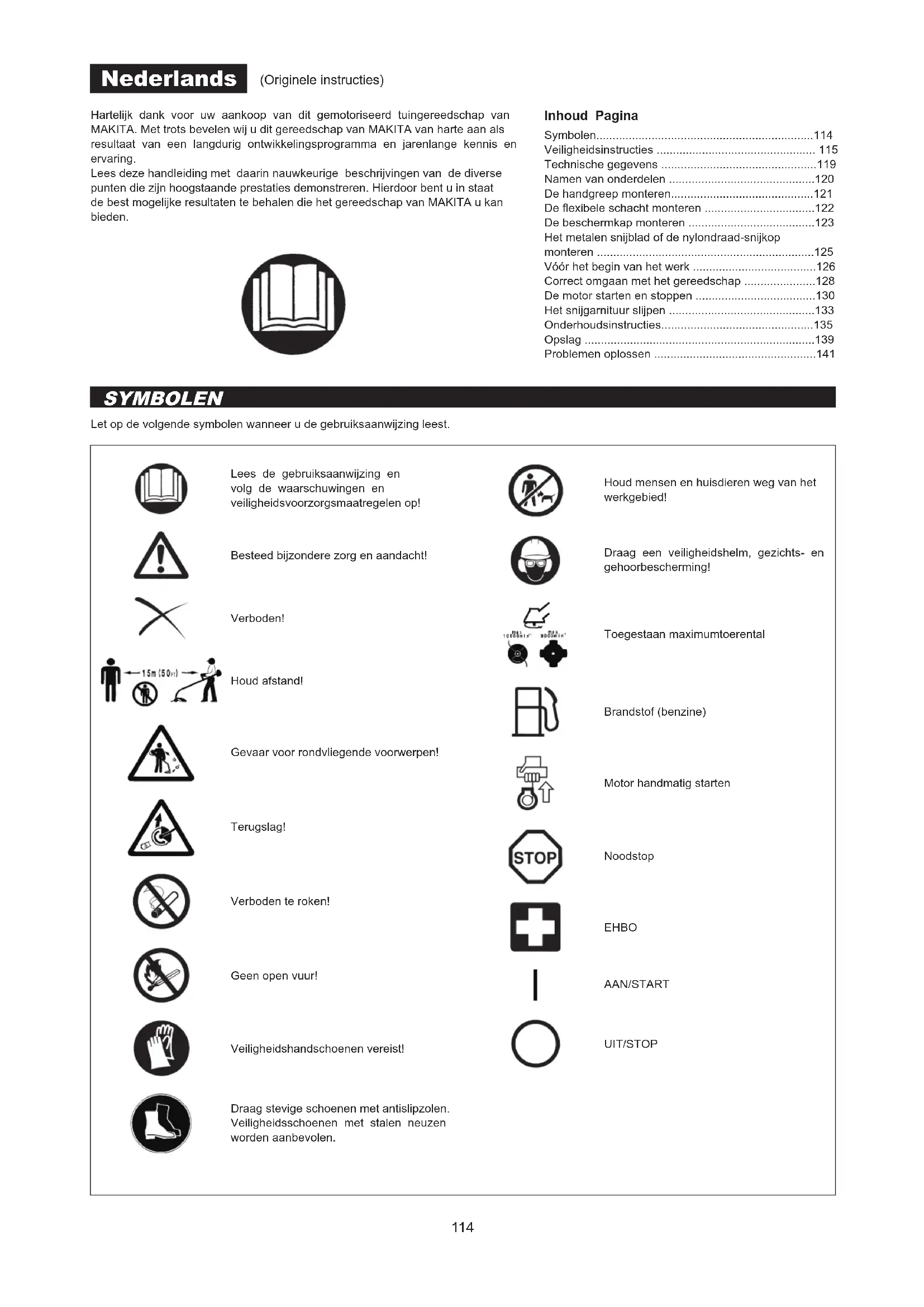 - *1 Eerste keer verversen na 20 bedrijfsuren. *2 Vraag een erkend servicecentrum of een machinewerkplaats om de inspectie na 200 bedrijfsuren uit te voeren. *3 Na het aftappen van de brandstoftank, laat u de motor draaien om de brandstof in de carburateur op te gebruiken.141 PROBLEMEN OPLOSSEN Alvorens een verzoek voor reparatie in te dienen, controleert u de storing zelf aan de hand van de onderstaande tabel. Als een probleem is gevonden, repareert u het gereedschap aan de hand van de beschrijvingen in deze gebruiksaanwijzing. Probeer nooit enig onderdeel te demonteren of repareren in strijd met de beschrijvingen. Voor reparatie neemt u contact op met een erkend servicecentrum of uw plaatselijke dealer. Probleemomschrijving Mogelijke oorzaak (storing) Oplossing Motor start niet. De I-O-schakelaar staat in de stand STOP. Zet de I-O-schakelaar (1) in de stand BEDIENING. De brandstofhandpomp werd niet ingedrukt. Druk deze 7 tot 10 keer in. Te zwak trekken aan de trekstarthandgreep. Trek krachtig. Gebrek aan brandstof. Vul brandstof bij. Verstopt brandstoflter. Maak hem schoon. Verbogen brandstoeiding. Maak de brandstoeiding recht. Verslechterde brandstof. De verslechterde brandstof bemoeilijkt het starten. Vervang de brandstof door nieuwe. (Aanbevolen vervangingsinterval: 1 maand) Buitensporige toevoer van brandstof. Verander de stand van de gashendel van middelhoog toerental naar hoog toerental en trek aan de trekstarthandgreep tot de motor start. Nadat de motor is gestart, begint het snijgarnituur te draaien. Let goed op het snijgarnituur. Als de motor nog steeds niet start, draait u de bougie eruit, maakt u de elektroden droog, en monteert u de bougie weer. Start vervolgens zoals beschreven. Bougiekap ligt eraf. Bevestig hem stevig. Vervuilde bougie. Maak hem schoon. Verkeerde elektrodenafstand van bougie. Stel de elektrodenafstand af. Ander probleem met de bougie. Vervang hem. Probleem met de carburateur. Dien een verzoek in voor inspectie en onderhoud. Trekstarthandgreep kan niet worden uitgetrokken. Dien een verzoek in voor inspectie en onderhoud. Probleem met de aandrijving. Dien een verzoek in voor inspectie en onderhoud. Motor slaat snel af. Motortoerental neemt niet toe. Onvoldoende opgewarmd. Warm de motor op. Chokehendel staat in de stand DICHT ondanks dat de motor opgewarmd is Zet in de stand OPEN. Verstopt brandstoflter. Maak hem schoon. Vervuild of verstopt luchtlter. Maak hem schoon. Probleem met de carburateur. Dien een verzoek in voor inspectie en onderhoud. Probleem met de aandrijving. Dien een verzoek in voor inspectie en onderhoud. Metalen snijblad draait niet. Zet de motor onmiddellijk uit. Bevestigingsmoer van metalen snijblad zit los. Maak goed vast. Takjes zijn rond het metalen blad gewikkeld of verstoppen de beschermkap. Verwijder vreemde voorwerpen. Probleem met de aandrijving. Dien een verzoek in voor inspectie en onderhoud. Motorblok trilt abnormaal sterk. Zet de motor onmiddellijk uit. Metalen snijblad is gebroken, verbogen of versleten. Vervang het metalen snijblad. Bevestigingsmoer van metalen snijblad zit los. Maak goed vast. Bolle deel van het metalen blad is verschoven ten opzichte van het steunvlak. Bevestig hem stevig. Probleem met de aandrijving. Dien een verzoek in voor inspectie en onderhoud. Metalen snijblad stopt niet onmiddellijk. Zet de motor onmiddellijk uit. Hoog stationair toerental. Stel af. Gaskabel is losgeraakt. Bevestig hem stevig. Probleem met de aandrijving. Dien een verzoek in voor inspectie en onderhoud. Motor slaat niet af. Laat de motor stationair draaien en zet de chokehendel in de stand DICHT. Stekker losgeraakt. Bevestig hem stevig. Probleem met het elektrisch systeem. Dien een verzoek in voor inspectie en onderhoud.142 Muchas gracias por comprar el equipo motorizado para exteriores de MAKITA. Nos complace recomendarle el producto MAKITA, que es el resultado de un largo programa de desarrollo y muchos años de investigación y experiencia.Lea este folleto que explica en detalle los diferentes aspectos que demostrarán su excelente rendimiento. Le ayudará a obtener los mejores resultados posibles del producto de MAKITA. Tabla de contenido Página Cuando lea el manual de instrucciones se encontrará con los siguientes símbolos. SÍMBOLOS Español (Instrucciones originales) Símbolos p. 142