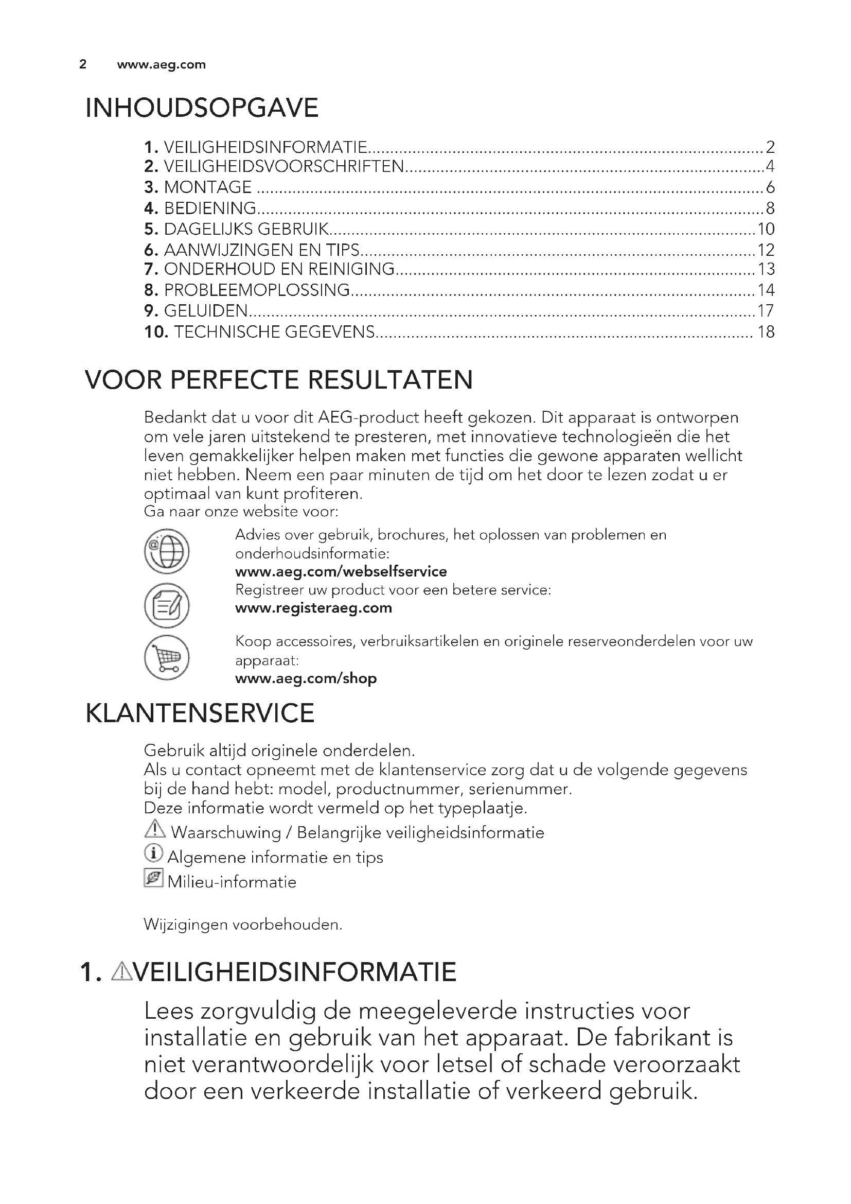 Bedankt dat u voor dit AEG-product heeft gekozen. Dit apparaat is ontworpen om vele jaren uitstekend te presteren, met innovatieve technologieën die het leven gemakkelijker helpen maken met functies die gewone apparaten wellicht niet hebben. Neem een paar minuten de tijd om het door te lezen zodat u er optimaal van kunt profiteren. Ga naar onze website voor: Advies over gebruik, brochures, het oplossen van problemen en onderhoudsinformatie: www.aeg.com/webselfservice Registreer uw product voor een betere service: www.registeraeg.com Koop accessoires, verbruiksartikelen en originele reserveonderdelen voor uw apparaat: www.aeg.com/shop KLANTENSERVICE Gebruik altijd originele onderdelen. Als u contact opneemt met de klantenservice zorg dat u de volgende gegevens bij de hand hebt: model, productnummer, serienummer. Deze informatie wordt vermeld op het typeplaatje. Waarschuwing / Belangrijke veiligheidsinformatie Algemene informatie en tips Milieu-informatie Wijzigingen voorbehouden.