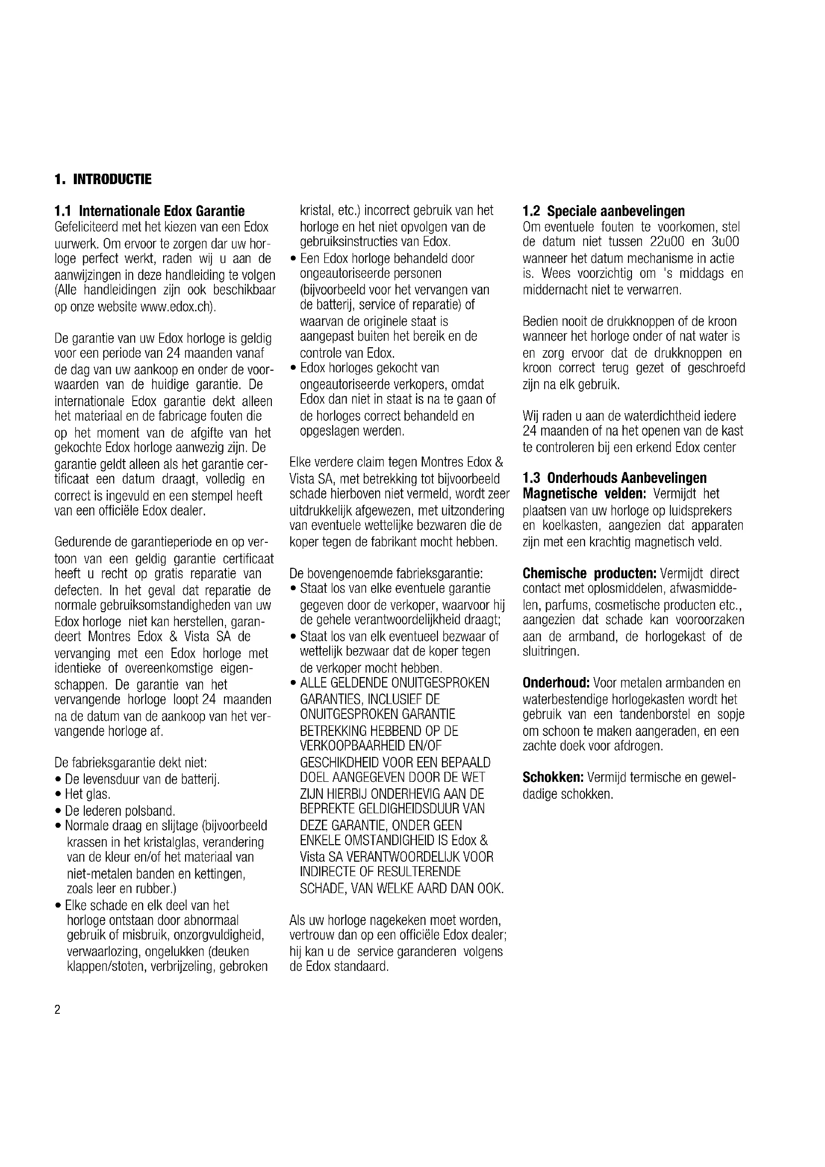 Gefeliciteerd met het kiezen van een Edox uurwerk. Om ervoor te zorgen dar uw hor- loge perfect werkt, raden wij u aan de aanwijzingen in deze handleiding te volgen (Alle handleidingen zijn ook beschikbaar op onze website www.edox.ch). De garantie van uw Edox horloge is geldig voor een periode van 24 maanden vanaf de dag van uw aankoop en onder de voor- waarden van de huidige garantie. De internationale Edox garantie dekt alleen het materiaal en de fabricage fouten die op het moment van de afgifte van het gekochte Edox horloge aanwezig zijn. De garantie geldt alleen als het garantie cer- tificaat een datum draagt, volledig en correct is ingevuld en een stempel heeft van een officiële Edox dealer. Gedurende de garantieperiode en op ver- toon van een geldig garantie certificaat heeft u recht op gratis reparatie van defecten. In het geval dat reparatie de normale gebruiksomstandigheden van uw Edox horloge niet kan herstellen, garan- deert Montres Edox & Vista SA de vervanging met een Edox horloge met identieke of overeenkomstige eigen- schappen. De garantie van het vervangende horloge loopt 24 maanden na de datum van de aankoop van het ver- vangende horloge af. De fabrieksgarantie dekt niet: