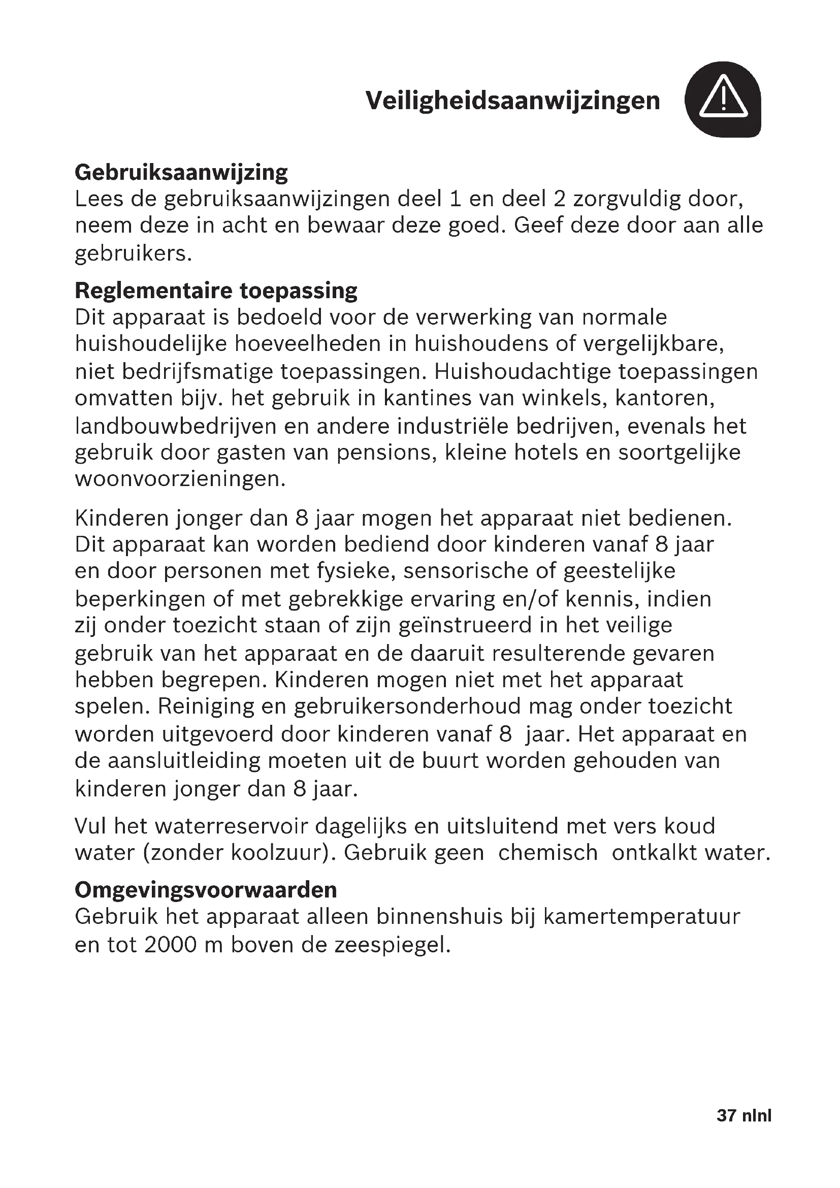 Gebruiksaanwijzing Lees de gebruiksaanwijzingen deel 1 en deel 2 zorgvuldig door, neem deze in acht en bewaar deze goed. Geef deze door aan alle gebruikers. Reglementaire toepassing Dit apparaat is bedoeld voor de verwerking van normale huishoudelijke hoeveelheden in huishoudens of vergelijkbare, niet bedrijfsmatige toepassingen. Huishoudachtige toepassingen omvatten bijv. het gebruik in kantines van winkels, kantoren, landbouwbedrijven en andere industriële bedrijven, evenals het gebruik door gasten van pensions, kleine hotels en soortgelijke woonvoorzieningen. Kinderen jonger dan 8 jaar mogen het apparaat niet bedienen. Dit apparaat kan worden bediend door kinderen vanaf 8 jaar en door personen met fysieke, sensorische of geestelijke beperkingen of met gebrekkige ervaring en/of kennis, indien zij onder toezicht staan of zijn geïnstrueerd in het veilige gebruik van het apparaat en de daaruit resulterende gevaren hebben begrepen. Kinderen mogen niet met het apparaat spelen. Reiniging en gebruikersonderhoud mag onder toezicht worden uitgevoerd door kinderen vanaf 8 jaar. Het apparaat en de aansluitleiding moeten uit de buurt worden gehouden van kinderen jonger dan 8 jaar. Vul het waterreservoir dagelijks en uitsluitend met vers koud water (zonder koolzuur). Gebruik geen chemisch ontkalkt water. Omgevingsvoorwaarden Gebruik het apparaat alleen binnenshuis bij kamertemperatuur en tot 2000 m boven de zeespiegel.38nlnl Veiligheidsaanwijzingen