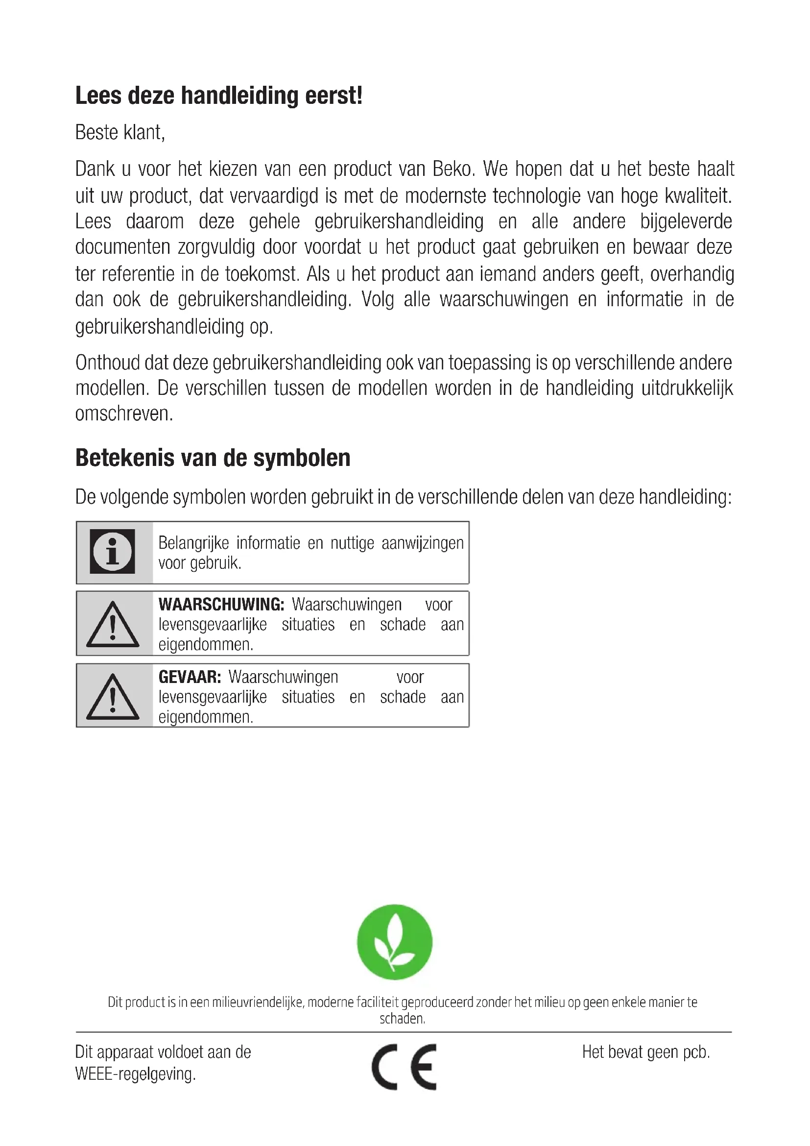 Service agrééDit product is in een milieuvriendelijke, moderne faciliteit geproduceerd zonder het milieu op geen enkele manier te schaden. Dit apparaat voldoet aan de WEEE-regelgeving. Het bevat geen pcb. Lees deze handleiding eerst! Beste klant, Dank u voor het kiezen van een product van Beko. We hopen dat u het beste haalt uit uw product, dat vervaardigd is met de modernste technologie van hoge kwaliteit. Lees daarom deze gehele gebruikershandleiding en alle andere bijgeleverde documenten zorgvuldig door voordat u het product gaat gebruiken en bewaar deze ter referentie in de toekomst. Als u het product aan iemand anders geeft, overhandig dan ook de gebruikershandleiding. Volg alle waarschuwingen en informatie in de gebruikershandleiding op. Onthoud dat deze gebruikershandleiding ook van toepassing is op verschillende andere modellen. De verschillen tussen de modellen worden in de handleiding uitdrukkelijk omschreven. Betekenis van de symbolen De volgende symbolen worden gebruikt in de verschillende delen van deze handleiding: