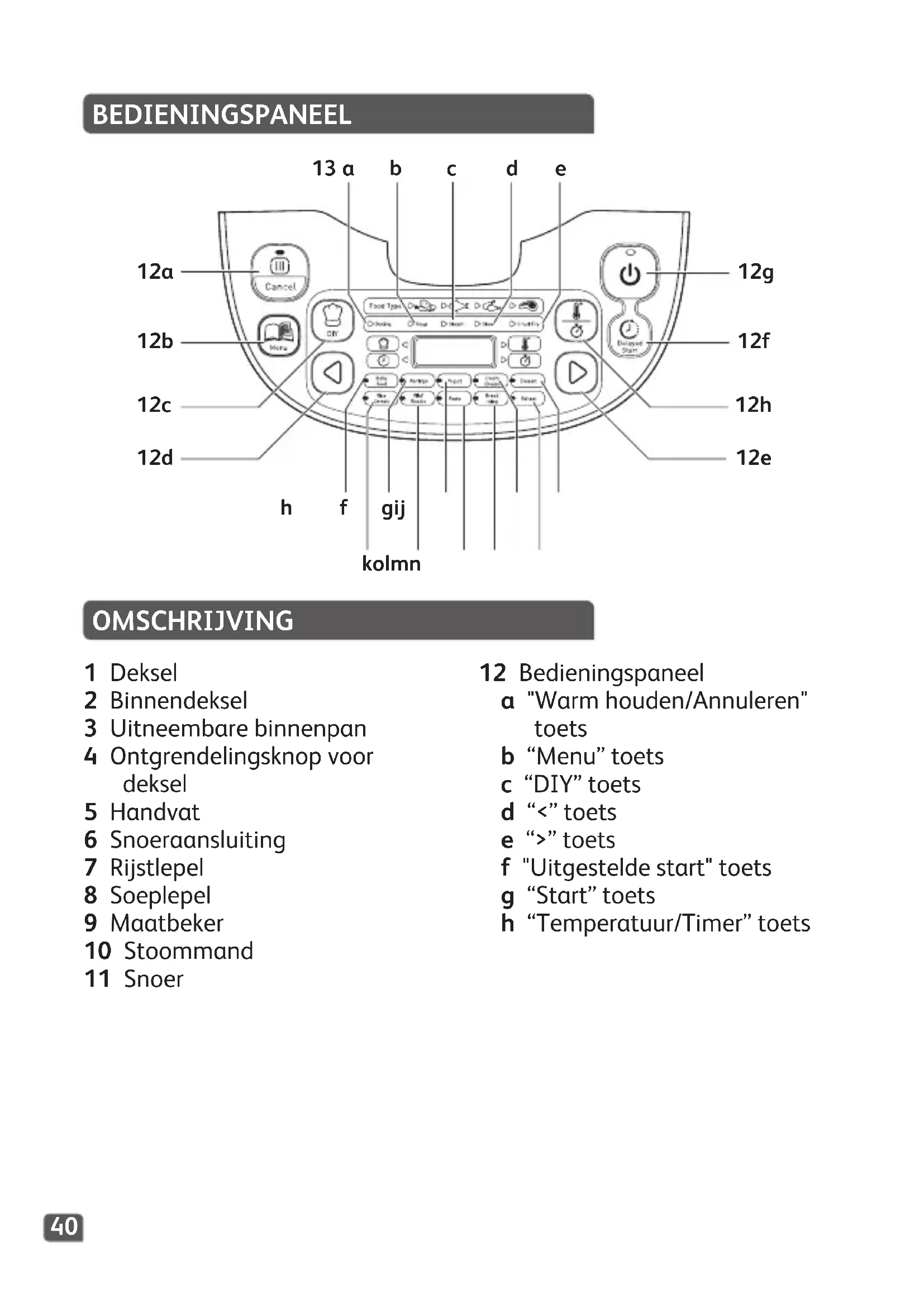 De sensor onderaan is open circuit of kortgesloten. Stop het apparaat en start nogmaals het programma. Als het probleem zich opnieuw voordoet, neem contact op met bevoegd servicecentrum voor reparatie. Opmerking: Als de binnenpan is vervormd, gebruik het niet langer en verkrijg een nieuwe binnenpan bij uw bevoegd servicecentrum.60 BEDIENFELD BESCHREIBUNG 1 Deckel 2 Innendeckel 3 Entnehmbare innere Schüssel 4 Deckelentriegelungstaste 5 Griff 6 Netzkabeleingang 7 Reislöffel 8 Suppenlöffel 9 Messbecher 10 Dampfgareinsatz 11 Netzkabel 12 Bedienfeld a „Keep warm/Cancel“-Taste (Warmhalten/Abbrechen) b „Menu“-Taste c „DIY“-Taste (Benutzerdefiniert) d „<“ Taste e „>“ Taste f „Delayed start“-Taste (Verzögerter Start) g „Start“-Taste h „Temperature/Timer“-Taste a13