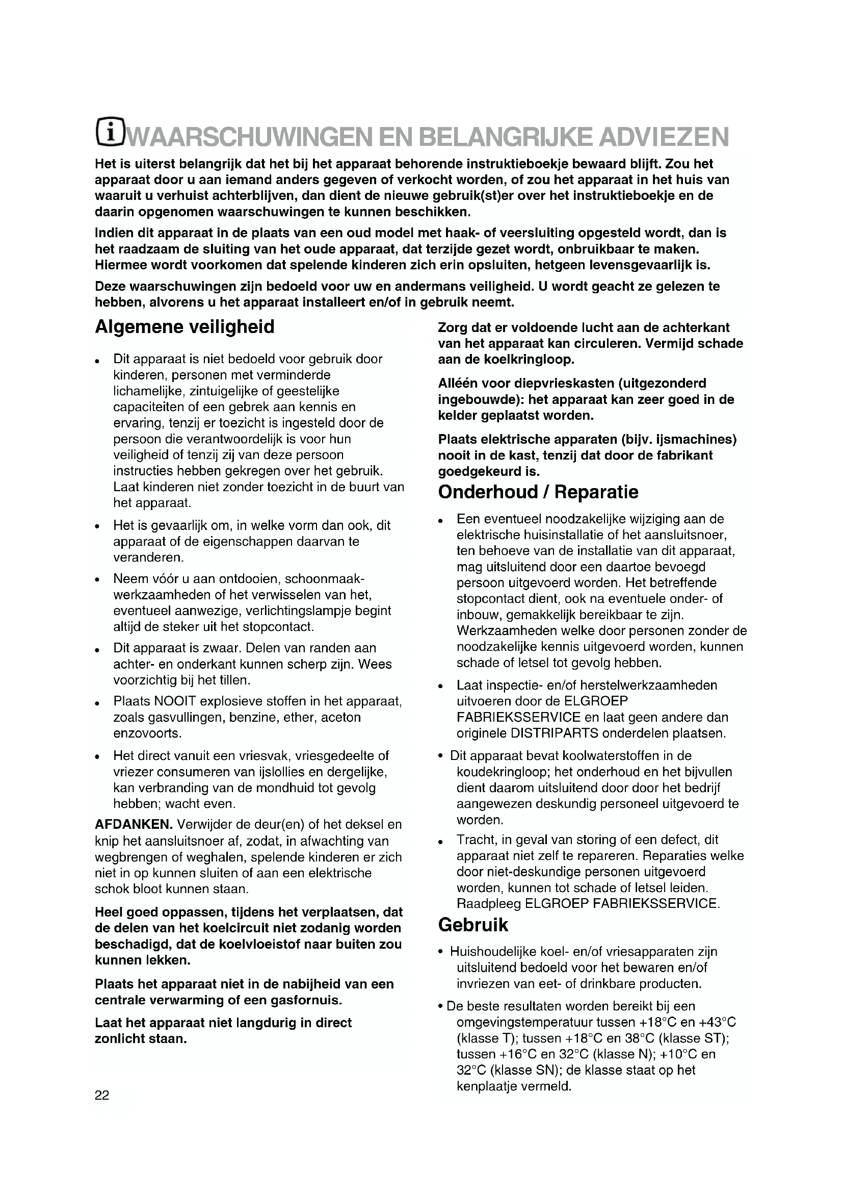 Het direct vanuit een vriesvak, vriesgedeelte of vriezer consumeren van ijslollies en dergelijke, kan verbranding van de mondhuid tot gevolg hebben; wacht even. AFDANKEN. Verwijder de deur(en) of het deksel en knip het aansluitsnoer af, zodat, in afwachting van wegbrengen of weghalen, spelende kinderen er zich niet in op kunnen sluiten of aan een elektrische schok bloot kunnen staan. Heel goed oppassen, tijdens het verplaatsen, dat de delen van het koelcircuit niet zodanig worden beschadigd, dat de koelvloeistof naar buiten zou kunnen lekken. Plaats het apparaat niet in de nabijheid van een centrale verwarming of een gasfornuis. Laat het apparaat niet langdurig in direct zonlicht staan. Zorg dat er voldoende lucht aan de achterkant van het apparaat kan circuleren. Vermijd schade aan de koelkringloop. Alléén voor diepvrieskasten (uitgezonderd ingebouwde): het apparaat kan zeer goed in de kelder geplaatst worden. Plaats elektrische apparaten (bijv. ijsmachines) nooit in de kast, tenzij dat door de fabrikant goedgekeurd is. Onderhoud / Reparatie
