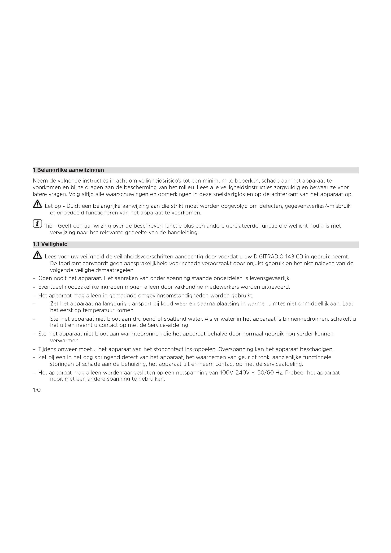 Lees voor uw veiligheid de veiligheidsvoorschrien aandachtig door voordat u uw DIGITRADIO 143 CD in gebruik neemt. De fabrikant aanvaardt geen aansprakelijkheid voor schade veroorzaakt door onjuist gebruik en het niet naleven van de volgende veiligheidsmaatregelen: - Open nooit het apparaat. Het aanraken van onder spanning staande onderdelen is levensgevaarlijk. - Eventueel noodzakelijke ingrepen mogen alleen door vakkundige medewerkers worden uitgevoerd. - Het apparaat mag alleen in gematigde omgevingsomstandigheden worden gebruikt. - Zet het apparaat na langdurig transport bij koud weer en daarna plaatsing in warme ruimtes niet onmiddellijk aan. Laat het eerst op temperatuur komen. - Stel het apparaat niet bloot aan druipend of spaend water. Als er water in het apparaat is binnengedrongen, schakelt u het uit en neemt u contact op met de Service-afdeling - Stel het apparaat niet bloot aan warmtebronnen die het apparaat behalve door normaal gebruik nog verder kunnen verwarmen. - Tijdens onweer moet u het apparaat van het stopcontact loskoppelen. Overspanning kan het apparaat beschadigen. - Zet bij een in het oog springend defect van het apparaat, het waarnemen van geur of rook, aanzienlijke functionele storingen of schade aan de behuizing, het apparaat uit en neem contact op met de serviceafdeling. - Het apparaat mag alleen worden aangesloten op een netspanning van 100V-240V ~, 50/60 Hz. Probeer het apparaat nooit met een andere spanning te gebruiken.171
