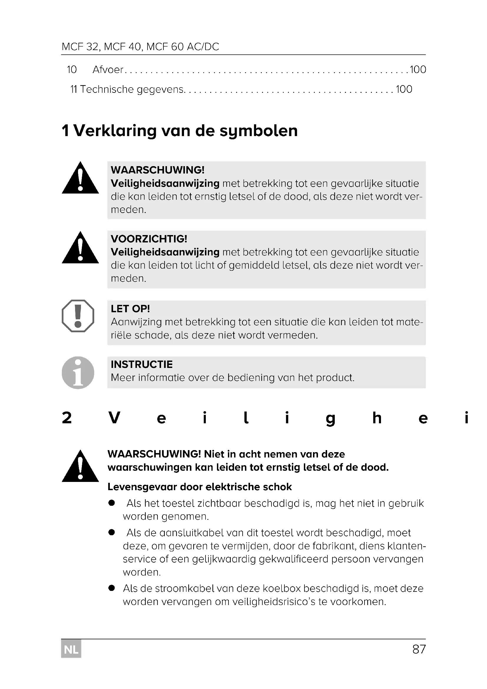 WAARSCHUWING! Niet in acht nemen van deze waarschuwingen kan leiden tot ernstig letsel of de dood. Levensgevaar door elektrische schok Als het toestel zichtbaar beschadigd is, mag het niet in gebruik worden genomen. Als de aansluitkabel van dit toestel wordt beschadigd, moet deze, om gevaren te vermijden, door de fabrikant, diens klanten- service of een gelijkwaardig gekwalificeerd persoon vervangen worden. Als de stroomkabel van deze koelbox beschadigd is, moet deze worden vervangen om veiligheidsrisico’s te voorkomen. WAARSCHUWING! Veiligheidsaanwijzing met betrekking tot een gevaarlijke situatie die kan leiden tot ernstig letsel of de dood, als deze niet wordt ver- meden. VOORZICHTIG! Veiligheidsaanwijzing met betrekking tot een gevaarlijke situatie die kan leiden tot licht of gemiddeld letsel, als deze niet wordt ver- meden. LET OP! Aanwijzing met betrekking tot een situatie die kan leiden tot mate- riële schade, als deze niet wordt vermeden. INSTRUCTIE Meer informatie over de bediening van het product. FR34-FR40-FR60_MCF32-MCF40-MCF60_OPM_EMEA16.book Seite 87 Donnerstag, 13. Februar 2020 3:51 15NL Veiligheidsinstructies MCF 32, MCF 40, MCF 60 AC/DC
