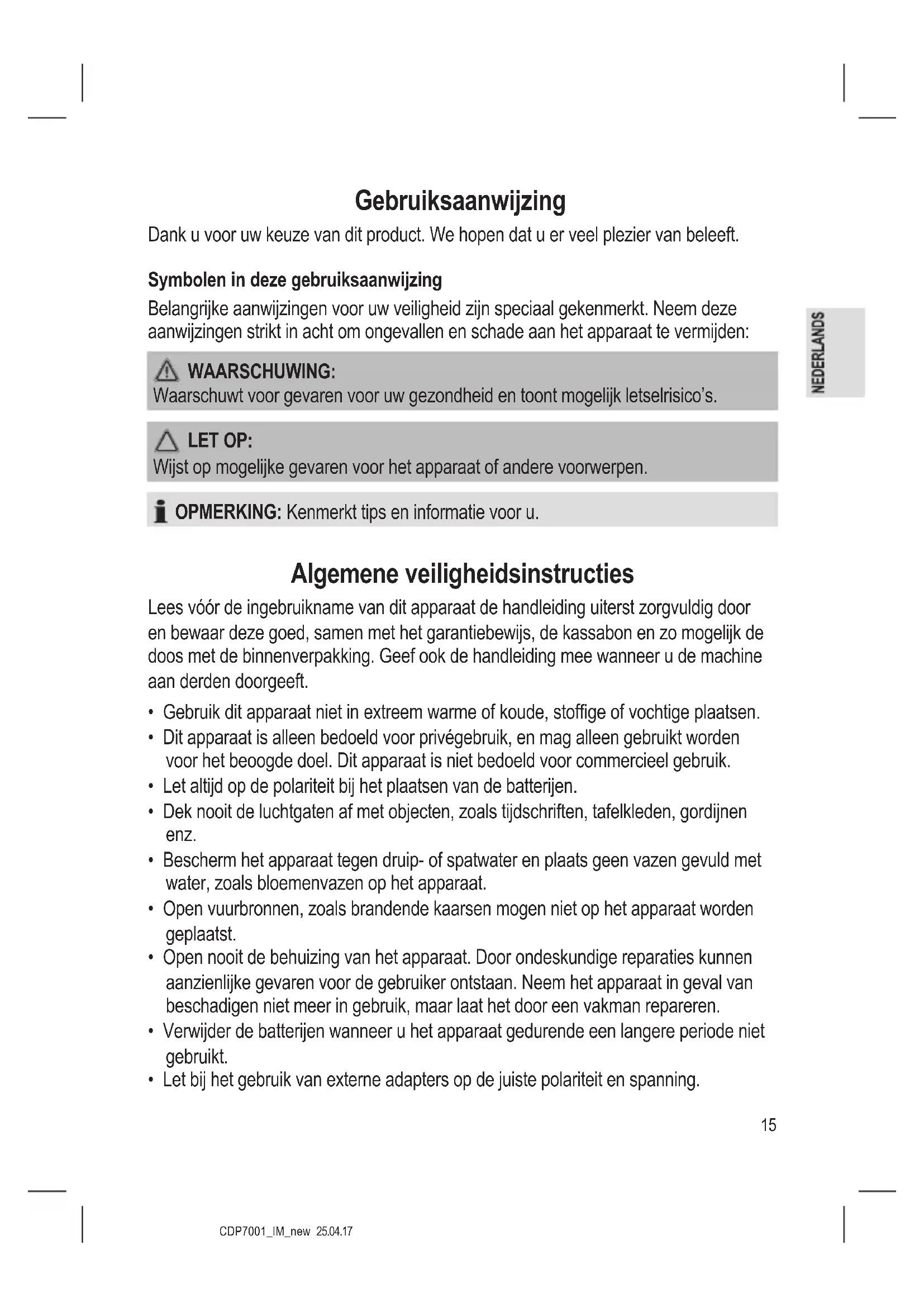 - Batterijen kunnen de accuzuur lekken. Als het apparaat langere tijd niet in gebruik is, verwijder dan de batterijen.CDP7001_IM_new 25.04.17