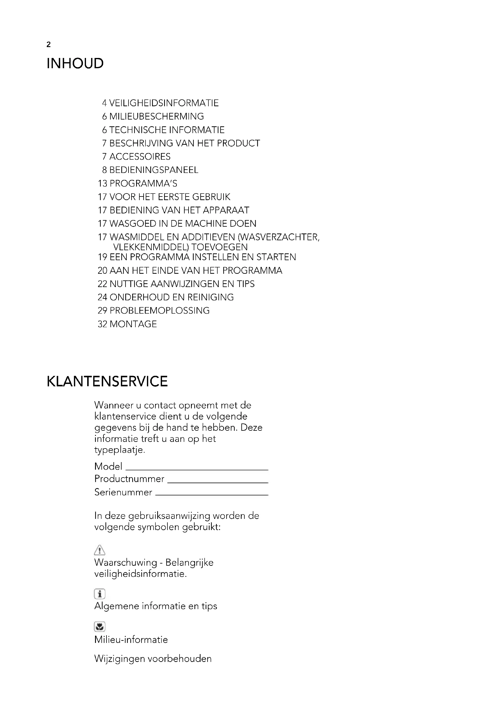 Wanneer u contact opneemt met de klantenservice dient u de volgende gegevens bij de hand te hebben. Deze informatie treft u aan op het typeplaatje. Model Productnummer Serienummer In deze gebruiksaanwijzing worden de volgende symbolen gebruikt: Waarschuwing - Belangrijke veiligheidsinformatie. Algemene informatie en tips Milieu-informatie Wijzigingen voorbehouden INHOUD 4 VEILIGHEIDSINFORMATIE 6 MILIEUBESCHERMING 6 TECHNISCHE INFORMATIE