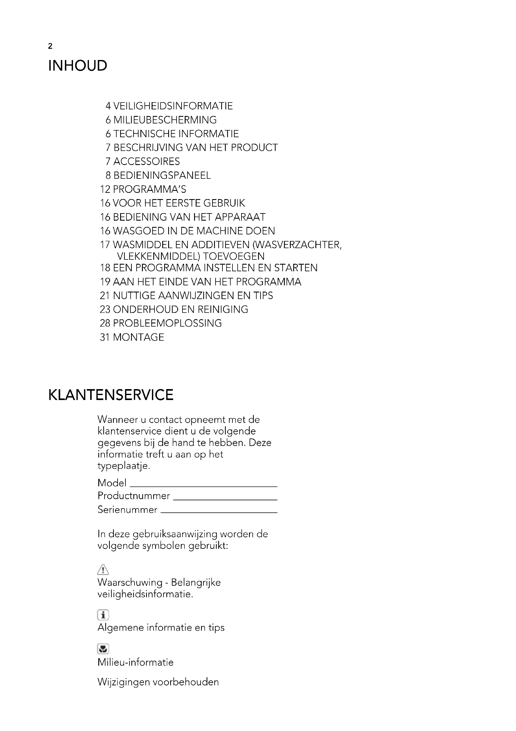 Wanneer u contact opneemt met de klantenservice dient u de volgende gegevens bij de hand te hebben. Deze informatie treft u aan op het typeplaatje. Model Productnummer Serienummer In deze gebruiksaanwijzing worden de volgende symbolen gebruikt: Waarschuwing - Belangrijke veiligheidsinformatie. Algemene informatie en tips Milieu-informatie Wijzigingen voorbehouden INHOUD 4 VEILIGHEIDSINFORMATIE 6 MILIEUBESCHERMING 6 TECHNISCHE INFORMATIE