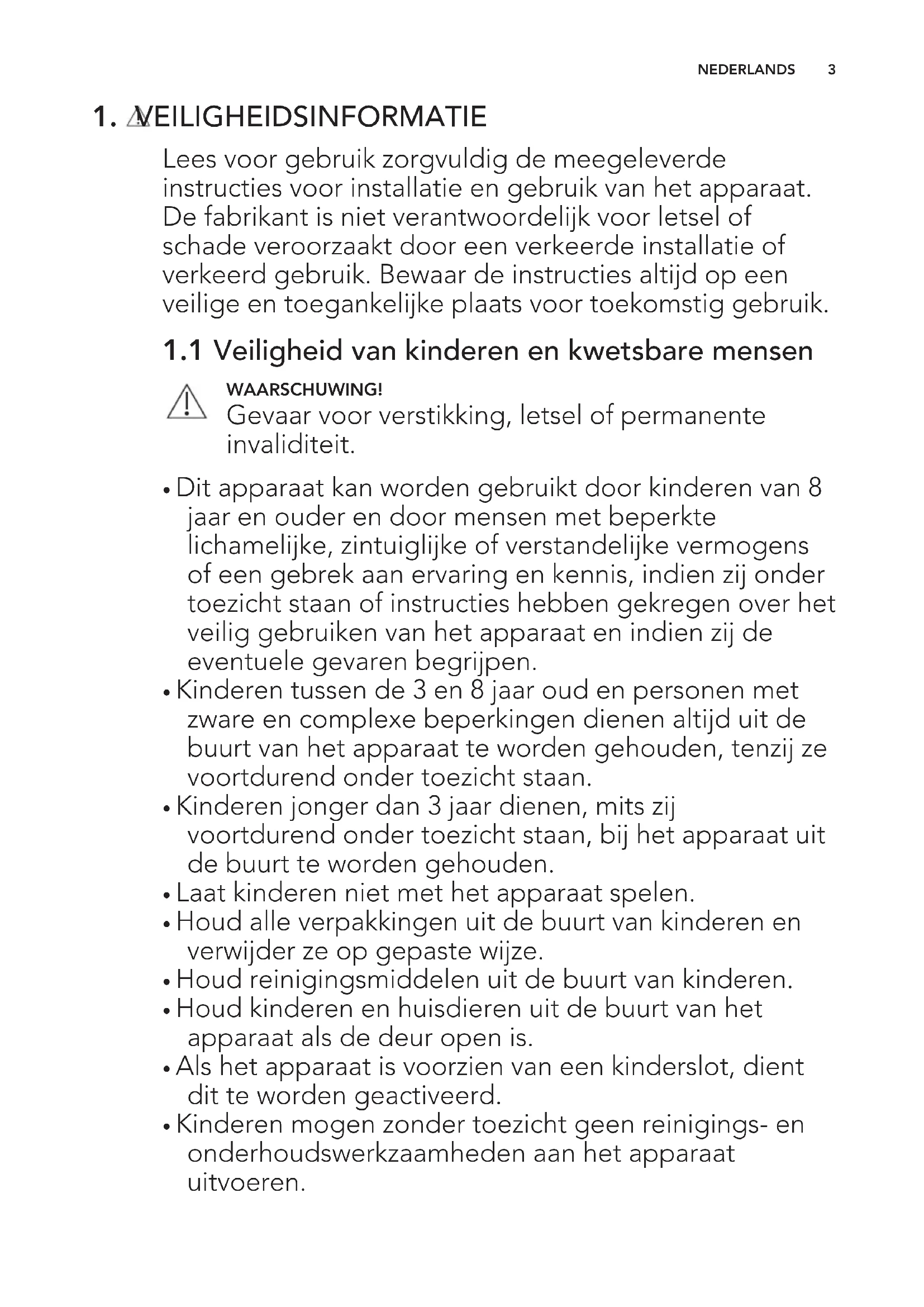 Bedankt dat u voor dit AEG-product heeft gekozen. Dit apparaat is ontworpen om vele jaren uitstekend te presteren, met innovatieve technologieën die het leven gemakkelijker helpen maken met functies die gewone apparaten wellicht niet hebben. Neem een paar minuten de tijd om het door te lezen zodat u er optimaal van kunt profiteren. Ga naar onze website voor: Advies over gebruik, brochures, het oplossen van problemen en onderhoudsinformatie: www.aeg.com/webselfservice Registreer uw product voor een betere service: www.registeraeg.com Koop accessoires, verbruiksartikelen en originele reserveonderdelen voor uw apparaat: www.aeg.com/shop KLANTENSERVICE Gebruik altijd originele onderdelen. Als u contact opneemt met de klantenservice zorg dat u de volgende gegevens bij de hand hebt: model, productnummer, serienummer. Deze informatie wordt vermeld op het typeplaatje. Waarschuwing / Belangrijke veiligheidsinformatie Algemene informatie en tips Milieu-informatie Wijzigingen voorbehouden. www.aeg.com