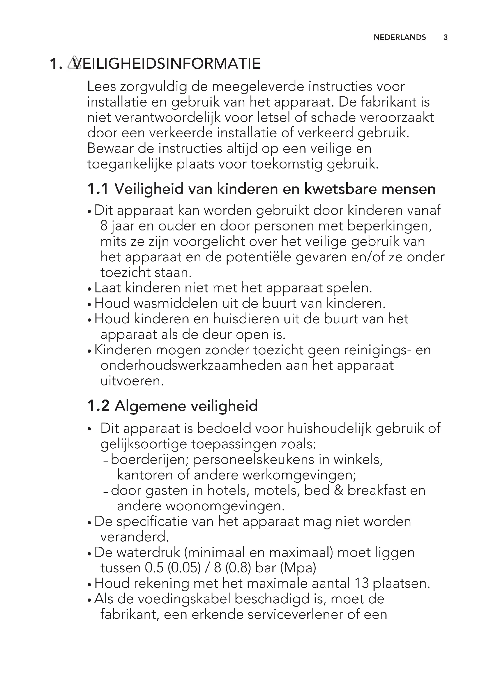 Bedankt dat u voor dit AEG-product heeft gekozen. Dit apparaat is ontworpen om vele jaren uitstekend te presteren, met innovatieve technologieën die het leven gemakkelijker helpen maken met functies die gewone apparaten wellicht niet hebben. Neem een paar minuten de tijd om het door te lezen zodat u er optimaal van kunt profiteren. Ga naar onze website voor: Advies over gebruik, brochures, het oplossen van problemen en onderhoudsinformatie: www.aeg.com/webselfservice Registreer uw product voor een betere service: www.registeraeg.com Koop accessoires, verbruiksartikelen en originele reserveonderdelen voor uw apparaat: www.aeg.com/shop KLANTENSERVICE Gebruik altijd originele onderdelen. Als u contact opneemt met de klantenservice zorg dat u de volgende gegevens bij de hand hebt: model, productnummer, serienummer. Deze informatie wordt vermeld op het typeplaatje. Waarschuwing / Belangrijke veiligheidsinformatie Algemene informatie en tips Milieu-informatie Wijzigingen voorbehouden. www.aeg.com