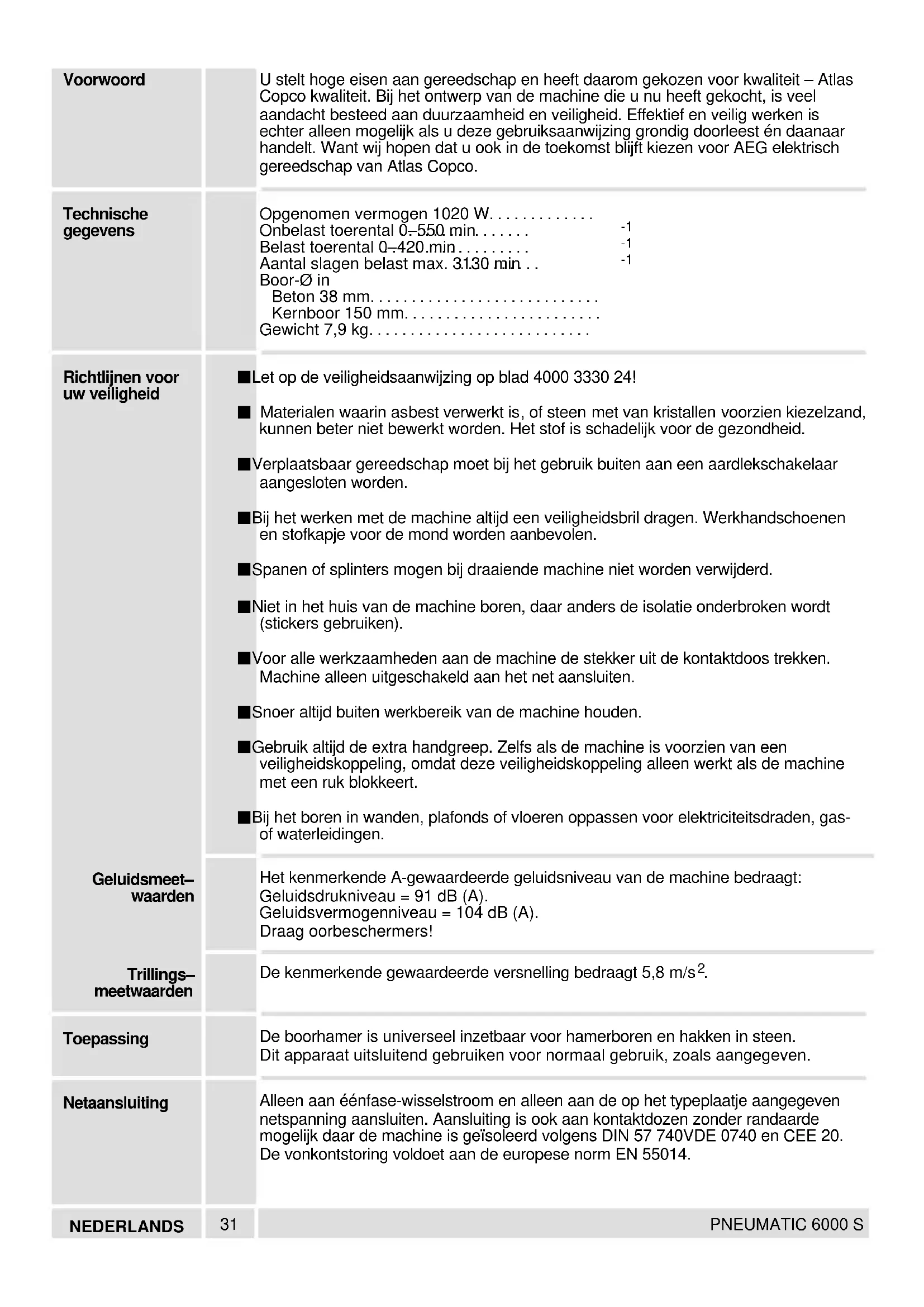 NEDERLANDS PNEUMATIC 6000 S Inschakelen: Aan-/uitschakelaar indrukken Uitschakelen: Aan-/uitschakelaar loslaten Het toerental varieert traploos met de druk die u op de aan–/uitschakelaar uitoefent. Hoe krachtiger de aandruk, des te hoger het vermogen. De schakelaar kan naar keuze aan de rechter- of linkerzijde van de extra handgreep worden bevestigd. Hiertoe de diepte-aanslaghouder in de extra handgreep schuiven tot de vergrendeling vastklikt.Voor het verwijderen van de diepte-aanslag de vergrendeling indrukken en de diepte-aanslaghouder van de handgreep trekken. Wanneer u diverse gaten op dezelfde diepte moet boren, de diepte-aanslag in het gat van de diepte-aanslaghouder schuiven en op de gewenste boordiepte vastzetten. De zij-handgreep kan worden verdraaid; de handgreep losmaken zoals op de tekening aangegeven en in de gewenste positie draaien. Zij-handgreep vervolgens weer vastdraaien. De extra handgreep kan ook aan de zijkant ven de machine worden gemonteerd. Deze positie is vooral geschikt om naar beneden te (b.v. in vloeren) of naar boven (b.v. in plafonds) te boren. Hiervoor de extra handgreep uit de voorste houder schroeven en dan aan de zijkant van het machinehuis weer vastschroeven. In-/uitschakelen Diepte–aanslag Handgreep35 NEDERLANDS PNEUMATIC 6000 S Grotere druk geeft geen beter resultaat Bij normale aanzetdruk funktioneert het Anti-Vibrations-System optimaal; hierbij wordt de harmonika slechts licht samengedrukt. Bij te grote aanzetdruk wordt de harmonika sterk samengedrukt en zijn de trillingen duidelijk merkbaar op de handgreep. Van tijd tot tijd de boor uit het boorgat trekken en het boormeel verwijderen. Bij beton, hard baksteen, hard cement en marmer op slagboren schakelen (aanboren van marmer echter zonder slagboren). Bij tegels, zacht baksteen, cementkalk en pleisterkalk op boren schakelen. Boren met hardmetalen punten gebruiken. Bij het boren van gladde oppervlakten (b.v. tegels) boorplek met plakband afplakken zodat de boor niet wegglijdt. Bij het minder worden van slagvermogen van de machine, deze opsturen naar de service dienst. Altijd de luchtspleten van de machine schoonhouden. Bij versleten koolborstels schakelt de machine af, voordat aan de collector schade kan ontstaan. Bij uitschakelen van de koolborstels of wanneer de slagkapaciteit afneemt graag direkt de officiële servicedienst van AEG raadplegen. Dit verhoogt de levensduur van de machine en garandeert een probleemloze werking. Alleen AEG toebehoren en onderdelen gebruiken. Onderdelen welke niet vermeld worden, kunnen het beste door de AEG servicedienst verwisseld worden (zie Serviceadressen). Onder vermelding van het tiencijferige nummer op het machineplaatje is desgewenst een doorsnedetekening van de machine verkrijgbaar bij: Atlas Copco Tools Nederland, Postbus 200, 3330 AE Zwijndrecht, Nederland 852. Het omvangrijke extra toebehorenassortiment met bestelnummer vindt u in onze katalogi. Werkrichtlijnen Tips Onderhoud Extra toebehoren36 DANSK PNEUMATIC 6000 S De er krævende og køber kvalitet – kvalitet fra Atlas Copco. Vi har konstrueret et solidt elektroværktøj til Dem med så stor en sikkerhed som mulig. Effektivt og yderst ufarligt arbejde er imidlertid kun muligt, såfremt De læser denne brugsanvisning og handler derefter. Vi vil, at De også i fremtiden bestemmer Dem for AEG–elektroværktøj fra Atlas Copco. Nominelt strømforbrug 1020 W. . . . . . . . . . . . . Omdrejningstal, ubelastet 0–550 min