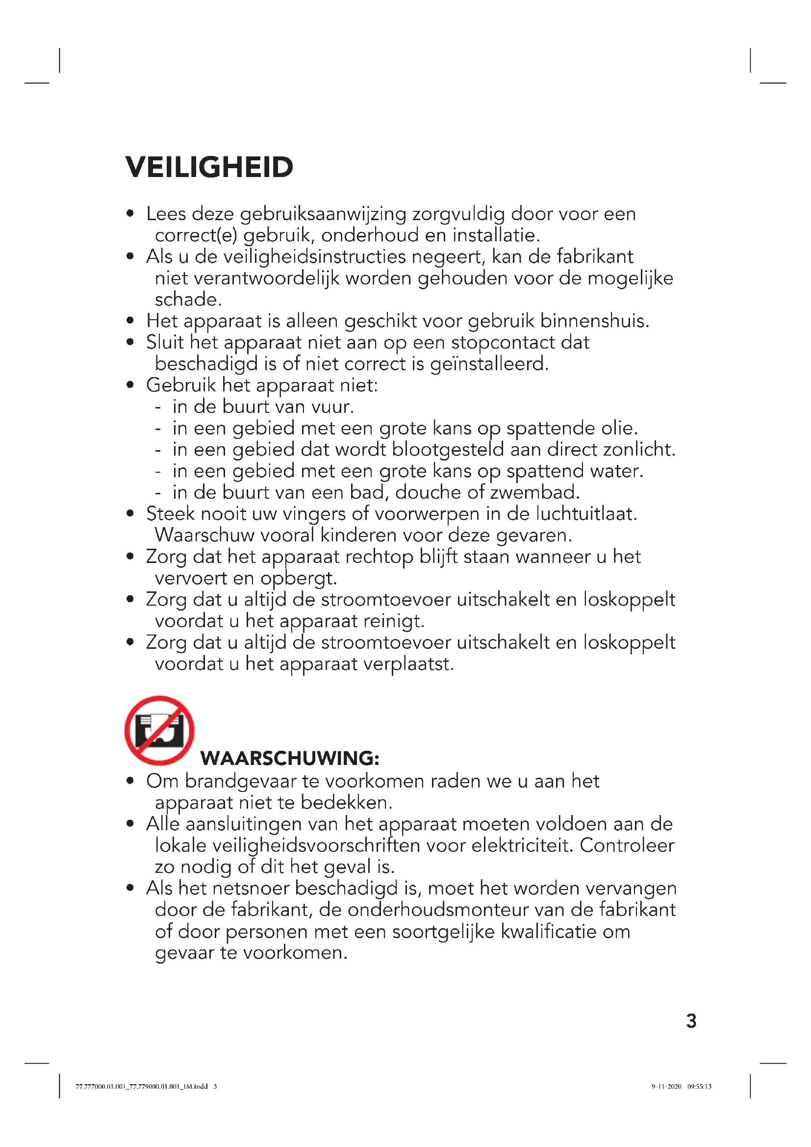 - Vervang de sensor voor de ruimtetemperatuur. Code E2. • Het waterreservoir is vol • Maak het waterreservoir leeg. MILIEU Dit apparaat mag aan het einde van de levensduur niet bij het normale huisafval worden gedeponeerd, maar moet bij een speciaal inzamelpunt voor hergebruik van elektrische en elektronische apparaten worden aangeboden. Het symbool op het apparaat, in de gebruiksaanwijzing en op de verpakking attendeert u hierop. De in het apparaat gebruikte materialen kunnen worden gerecycled. Met het recyclen van gebruikte huishoudelijke apparaten levert u een belangrijke bijdrage aan de bescherming van ons milieu. Informeer bij uw lokale overheid naar het inzamelpunt. 77.777000.01.001_77.779000.01.001_IM.indd 1577.777000.01.001_77.779000.01.001_IM.indd 15 9-11-2020 09:55:169-11-2020 09:55:1616 INDEX Technical data 01. Safety 17. Parts description 21. Function of control panel 22. Remote control 22. Before the rst use 23. Use 23. Installation 24. Cleaning maintenance 26. Troubleshooting 27. Environment 28. 77.777000.01.001_77.779000.01.001_IM.indd 1677.777000.01.001_77.779000.01.001_IM.indd 16 9-11-2020 09:55:169-11-2020 09:55:1617 SAFETY