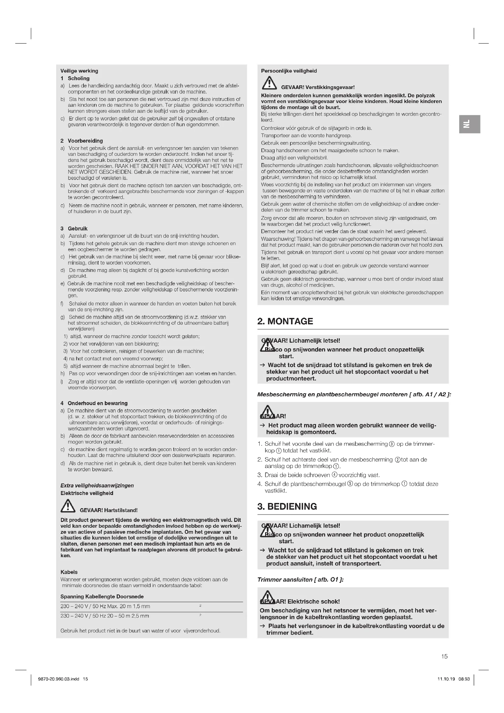 GEVAAR! Lichamelijk letsel! Risico op snijwonden wanneer het product onopzettelijk start. v Wacht tot de snijdraad tot stilstand is gekomen en trek de stekker van het product uit het stopcontact voordat u het product aansluit, instelt of transporteert. Trimmer aansluiten [ afb. O1 ]: GEVAAR! Elektrische schok! Om beschadiging van het netsnoer te vermijden, moet het ver- lengsnoer in de kabeltrekontlasting worden geplaatst. v Plaats het verlengsnoer in de kabeltrekontlasting voordat u de trimmer bedient. 9870-20.960.03.indd 15 11.10.19 08:53NL
