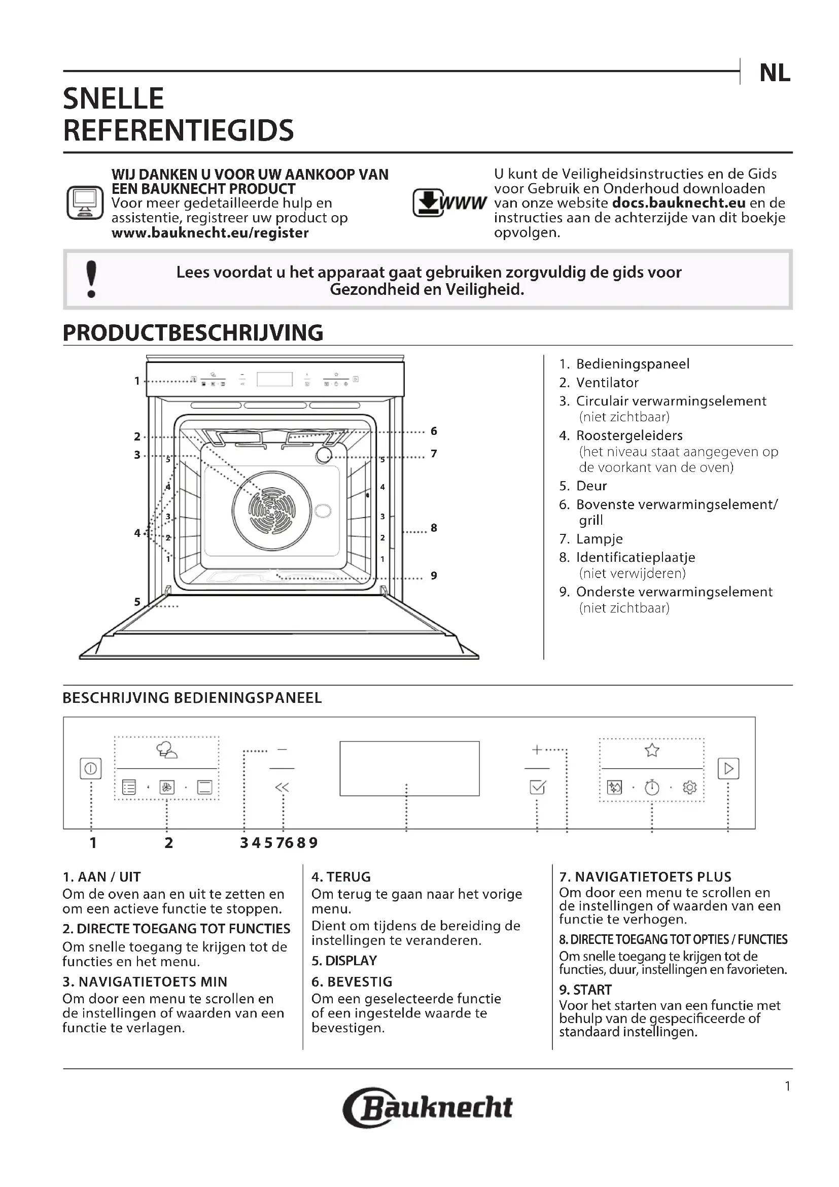 SNELLE REFERENTIEGIDS WIJ DANKEN U VOOR UW AANKOOP VAN EEN BAUKNECHT PRODUCTVoor meer gedetailleerde hulp en assistentie, registreer uw product op www. bauknecht. eu/ register WWW U kunt de Veiligheidsinstructies en de Gids voor Gebruik en Onderhoud downloaden van onze website docs.bauknecht.eu en de instructies aan de achterzijde van dit boekje opvolgen. Lees voordat u het apparaat gaat gebruiken zorgvuldig de gids voor Gezondheid en Veiligheid. PRODUCTBESCHRIJVING 1. Bedieningspaneel2. Ventilator3. Circulair verwarmingselement (niet zichtbaar)4. Roostergeleiders (het niveau staat aangegeven op de voorkant van de oven)5. Deur6. Bovenste verwarmingselement/grill7. Lampje8. Identificatieplaatje (niet verwijderen)9. Onderste verwarmingselement (niet zichtbaar)BESCHRIJVING BEDIENINGSPANEEL