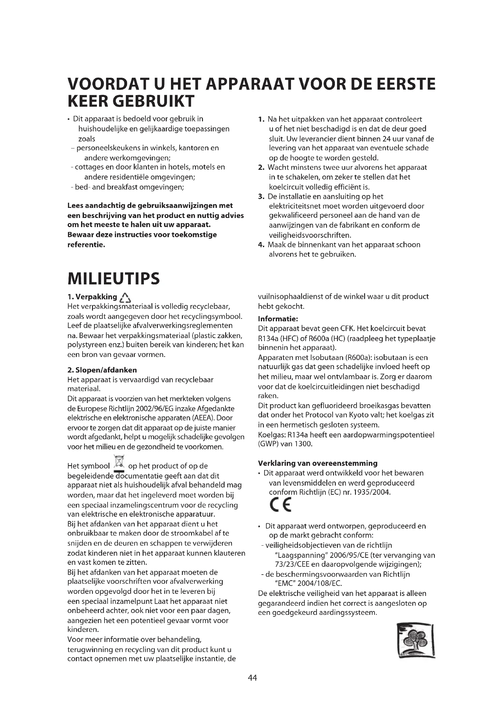 Het apparaat is vervaardigd van recyclebaar materiaal. Dit apparaat is voorzien van het merkteken volgens de Europese Richtlijn 2002/96/EG inzake Afgedankte elektrische en elektronische apparaten (AEEA). Door ervoor te zorgen dat dit apparaat op de juiste manier wordt afgedankt, helpt u mogelijk schadelijke gevolgen voor het milieu en de gezondheid te voorkomen. Het symbool op het product of op de begeleidende documentatie geeft aan dat dit apparaat niet als huishoudelijk afval behandeld mag worden, maar dat het ingeleverd moet worden bij een speciaal inzamelingscentrum voor de recycling van elektrische en elektronische apparatuur. Bij het afdanken van het apparaat dient u het onbruikbaar te maken door de stroomkabel af te snijden en de deuren en schappen te verwijderen zodat kinderen niet in het apparaat kunnen klauteren en vast komen te zitten. Bij het afdanken van het apparaat moeten de plaatselijke voorschriften voor afvalverwerking worden opgevolgd door het in te leveren bij een speciaal inzamelpunt Laat het apparaat niet onbeheerd achter, ook niet voor een paar dagen, aangezien het een potentieel gevaar vormt voor kinderen. Voor meer informatie over behandeling, terugwinning en recycling van dit product kunt u contact opnemen met uw plaatselijke instantie, de vuilnisophaaldienst of de winkel waar u dit product hebt gekocht. Informatie: Dit apparaat bevat geen CFK. Het koelcircuit bevat R134a (HFC) of R600a (HC) (raadpleeg het typeplaatje binnenin het apparaat). Apparaten met Isobutaan (R600a): isobutaan is een natuurlijk gas dat geen schadelijke invloed heeft op het milieu, maar wel ontvlambaar is. Zorg er daarom voor dat de koelcircuitleidingen niet beschadigd raken. Dit product kan gefluorideerd broeikasgas bevatten dat onder het Protocol van Kyoto valt; het koelgas zit in een hermetisch gesloten systeem. Koelgas: R134a heeft een aardopwarmingspotentieel (GWP) van 1300. Verklaring van overeenstemming