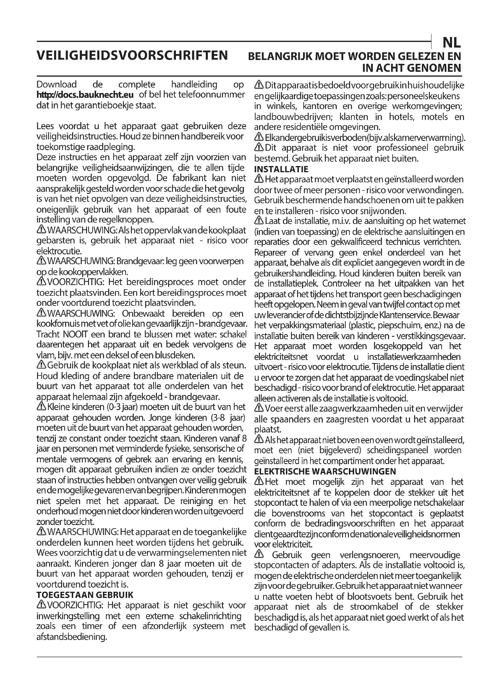 400011699775Download de complete handleiding op http://docs.bauknecht.eu of bel het telefoonnummer dat in het garantieboekje staat. Lees voordat u het apparaat gaat gebruiken deze veiligheidsinstructies. Houd ze binnen handbereik voor toekomstige raadpleging. Deze instructies en het apparaat zelf zijn voorzien van belangrijke veiligheidsaanwijzingen, die te allen tijde moeten worden opgevolgd. De fabrikant kan niet aansprakelijk gesteld worden voor schade die het gevolg is van het niet opvolgen van deze veiligheidsinstructies, oneigenlijk gebruik van het apparaat of een foute instelling van de regelknoppen. WAARSCHUWING: Als het oppervlak van de kookplaat gebarsten is, gebruik het apparaat niet - risico voor elektrocutie. WAARSCHUWING: Brandgevaar: leg geen voorwerpen op de kookoppervlakken. VOORZICHTIG: Het bereidingsproces moet onder toezicht plaatsvinden. Een kort bereidingsproces moet onder voortdurend toezicht plaatsvinden. WAARSCHUWING: Onbewaakt bereiden op een kookfornuis met vet of olie kan gevaarlijk zijn - brandgevaar. Tracht NOOIT een brand te blussen met water: schakel daarentegen het apparaat uit en bedek vervolgens de vlam, bijv. met een deksel of een blusdeken. Gebruik de kookplaat niet als werkblad of als steun. Houd kleding of andere brandbare materialen uit de buurt van het apparaat tot alle onderdelen van het apparaat helemaal zijn afgekoeld - brandgevaar. Kleine kinderen (0-3jaar) moeten uit de buurt van het apparaat gehouden worden. Jonge kinderen (3-8 jaar) moeten uit de buurt van het apparaat gehouden worden, tenzij ze constant onder toezicht staan. Kinderen vanaf 8 jaar en personen met verminderde fysieke, sensorische of mentale vermogens of gebrek aan ervaring en kennis, mogen dit apparaat gebruiken indien ze onder toezicht staan of instructies hebben ontvangen over veilig gebruik en de mogelijke gevaren ervan begrijpen. Kinderen mogen niet spelen met het apparaat. De reiniging en het onderhoud mogen niet door kinderen worden uitgevoerd zonder toezicht. WAARSCHUWING: Het apparaat en de toegankelijke onderdelen kunnen heet worden tijdens het gebruik. Wees voorzichtig dat u de verwarmingselementen niet aanraakt. Kinderen jonger dan 8 jaar moeten uit de buurt van het apparaat worden gehouden, tenzij er voortdurend toezicht is. TOEGESTAAN GEBRUIK VOORZICHTIG: Het apparaat is niet geschikt voor inwerkingstelling met een externe schakelinrichting zoals een timer of een afzonderlijk systeem met afstandsbediening. Dit apparaat is bedoeld voor gebruik in huishoudelijke en gelijkaardige toepassingen zoals: personeelskeukens in winkels, kantoren en overige werkomgevingen; landbouwbedrijven; klanten in hotels, motels en andere residentiële omgevingen. Elk ander gebruik is verboden (bijv. als kamerverwarming). Dit apparaat is niet voor professioneel gebruik bestemd. Gebruik het apparaat niet buiten. INSTALLATIE Het apparaat moet verplaatst en geïnstalleerd worden door twee of meer personen - risico voor verwondingen. Gebruik beschermende handschoenen om uit te pakken en te installeren - risico voor snijwonden. Laat de installatie, m.i.v. de aansluiting op het waternet (indien van toepassing) en de elektrische aansluitingen en reparaties door een gekwalificeerd technicus verrichten. Repareer of vervang geen enkel onderdeel van het apparaat, behalve als dit expliciet aangegeven wordt in de gebruikershandleiding. Houd kinderen buiten bereik van de installatieplek. Controleer na het uitpakken van het apparaat of het tijdens het transport geen beschadigingen heeft opgelopen. Neem in geval van twijfel contact op met uw leverancier of de dichtstbijzijnde Klantenservice. Bewaar het verpakkingsmateriaal (plastic, piepschuim, enz.) na de installatie buiten bereik van kinderen - verstikkingsgevaar. Het apparaat moet worden losgekoppeld van het elektriciteitsnet voordat u installatiewerkzaamheden uitvoert - risico voor elektrocutie. Tijdens de installatie dient u ervoor te zorgen dat het apparaat de voedingskabel niet beschadigd - risico voor brand of elektrocutie. Het apparaat alleen activeren als de installatie is voltooid. Voer eerst alle zaagwerkzaamheden uit en verwijder alle spaanders en zaagresten voordat u het apparaat plaatst. Als het apparaat niet boven een oven wordt geïnstalleerd, moet een (niet bijgeleverd) scheidingspaneel worden geïnstalleerd in het compartiment onder het apparaat. ELEKTRISCHE WAARSCHUWINGEN Het moet mogelijk zijn het apparaat van het elektriciteitsnet af te koppelen door de stekker uit het stopcontact te halen of via een meerpolige netschakelaar die bovenstrooms van het stopcontact is geplaatst conform de bedradingsvoorschriften en het apparaat dient geaard te zijn conform de nationale veiligheidsnormen voor elektriciteit. Gebruik geen verlengsnoeren, meervoudige stopcontacten of adapters. Als de installatie voltooid is, mogen de elektrische onderdelen niet meer toegankelijk zijn voor de gebruiker. Gebruik het apparaat niet wanneer u natte voeten hebt of blootsvoets bent. Gebruik het apparaat niet als de stroomkabel of de stekker beschadigd is, als het apparaat niet goed werkt of als het beschadigd of gevallen is. VEILIGHEIDSVOORSCHRIFTEN