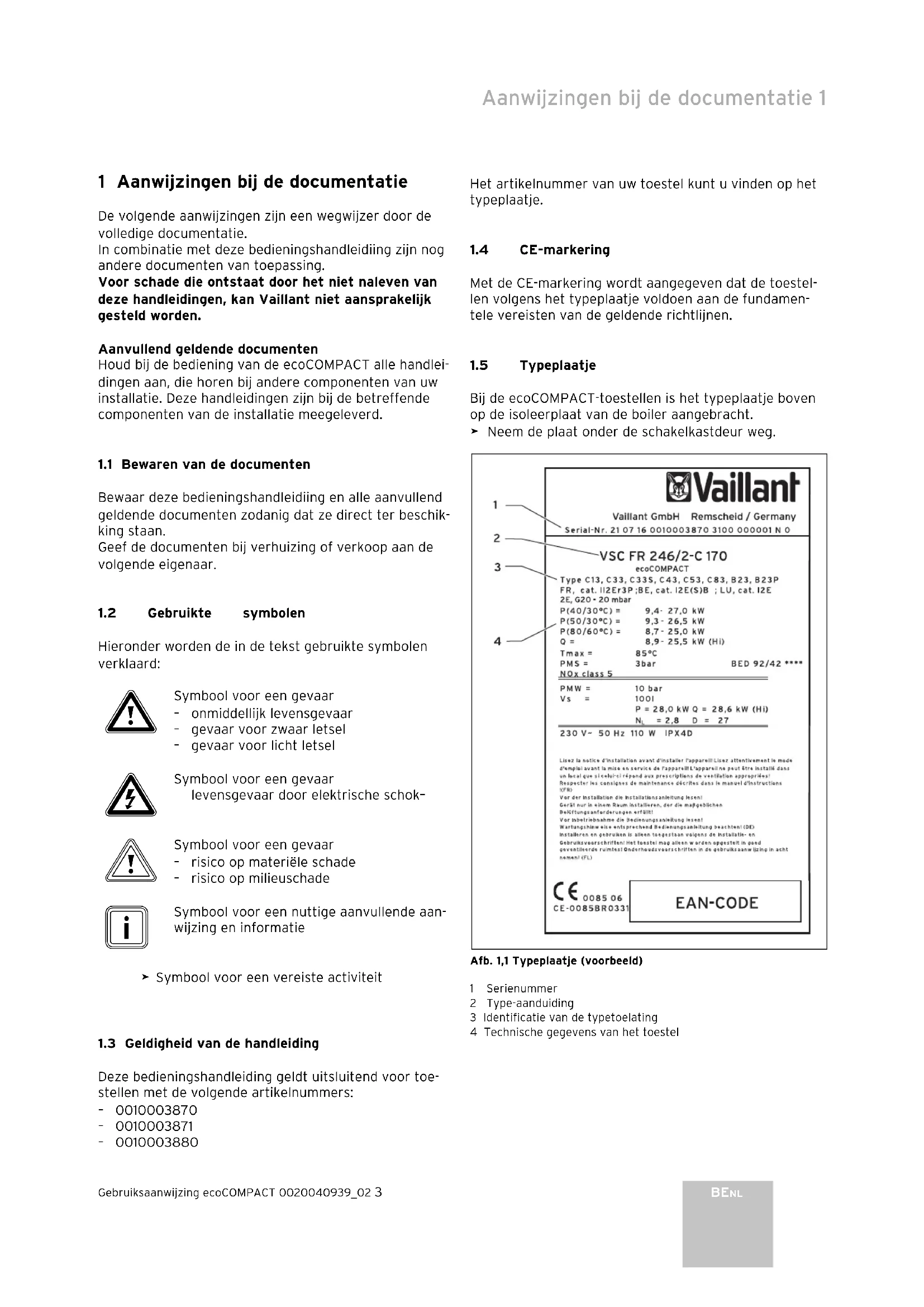 Aanwijzingen bij de documentatie 1 BENL4 Gebruiksaanwijzing ecoCOMPACT 0020040939_02 2 Veiligheid