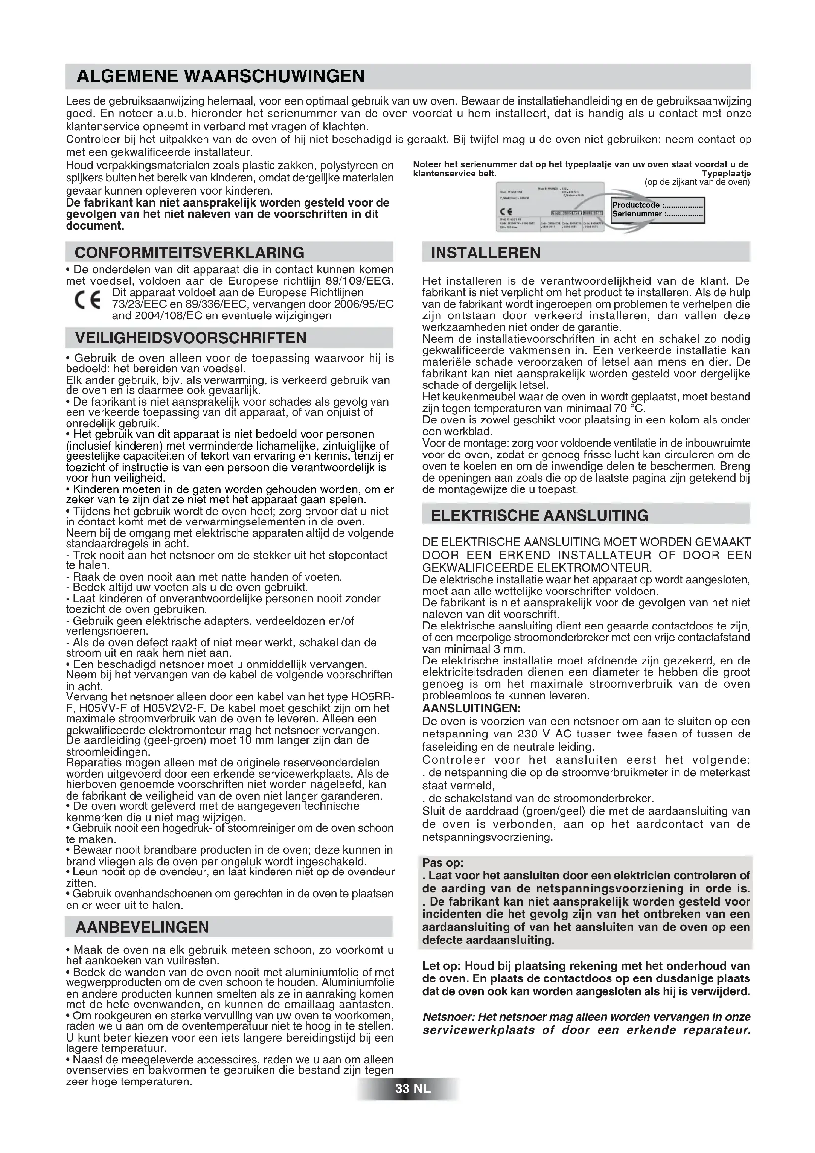 DOOR EEN ERKEND INSTALLATEUR OF DOOR EEN GEKWALIFICEERDE ELEKTROMONTEUR. De elektrische installatie waar het apparaat op wordt aangesloten, moet aan alle wettelijke voorschriften voldoen. De fabrikant is niet aansprakelijk voor de gevolgen van het niet naleven van dit voorschrift. De elektrische aansluiting dient een geaarde contactdoos te zijn, of een meerpolige stroomonderbreker met een vrije contactafstand van minimaal 3 mm. De elektrische installatie moet afdoende zijn gezekerd, en de elektriciteitsdraden dienen een diameter te hebben die groot genoeg is om het maximale stroomverbruik van de oven probleemloos te kunnen leveren. AANSLUITINGEN: De oven is voorzien van een netsnoer om aan te sluiten op een netspanning van 230 V AC tussen twee fasen of tussen de faseleiding en de neutrale leiding. Controleer voor het aansluiten eerst het volgende: . de netspanning die op de stroomverbruikmeter in de meterkast staat vermeld, . de schakelstand van de stroomonderbreker. Sluit de aarddraad (groen/geel) die met de aardaansluiting van de oven is verbonden, aan op het aardcontact van de netspanningsvoorziening. Pas op: . Laat voor het aansluiten door een elektricien controleren of de aarding van de netspanningsvoorziening in orde is. . De fabrikant kan niet aansprakelijk worden gesteld voor incidenten die het gevolg zijn van het ontbreken van een aardaansluiting of van het aansluiten van de oven op een defecte aardaansluiting. Let op: Houd bij plaatsing rekening met het onderhoud van de oven. En plaats de contactdoos op een dusdanige plaats dat de oven ook kan worden aangesloten als hij is verwijderd. Netsnoer: Het netsnoer mag alleen worden vervangen in onze servicewerkplaats of door een erkende reparateur. 33 NL Noteer het serienummer dat op het typeplaatje van uw oven staat voordat u deklantenservice belt. Typeplaatje(op de zijkant van de oven)Productcode :..................Serienummer :.................OVENUITRUSTING Reinig de uitrusting voor het eerste gebruik. Neem ze af met een sponsje. Spoel ze schoon en maak ze droog. De ovenplaat is om bakvormen en ovenservies op te plaatsen. De lekbak vangt de sappen op tijdens het grillen. De lekbak nooit als bakschaal gebruiken,er kan zich rookontwikkeling, vetverspreiding en een snelle vervuilingvan de oven voordoen. Tijdens het gebruik van de oven moet u alle niet-gebruikte ovenaccessoires uit de oven verwijderen. 34 NL