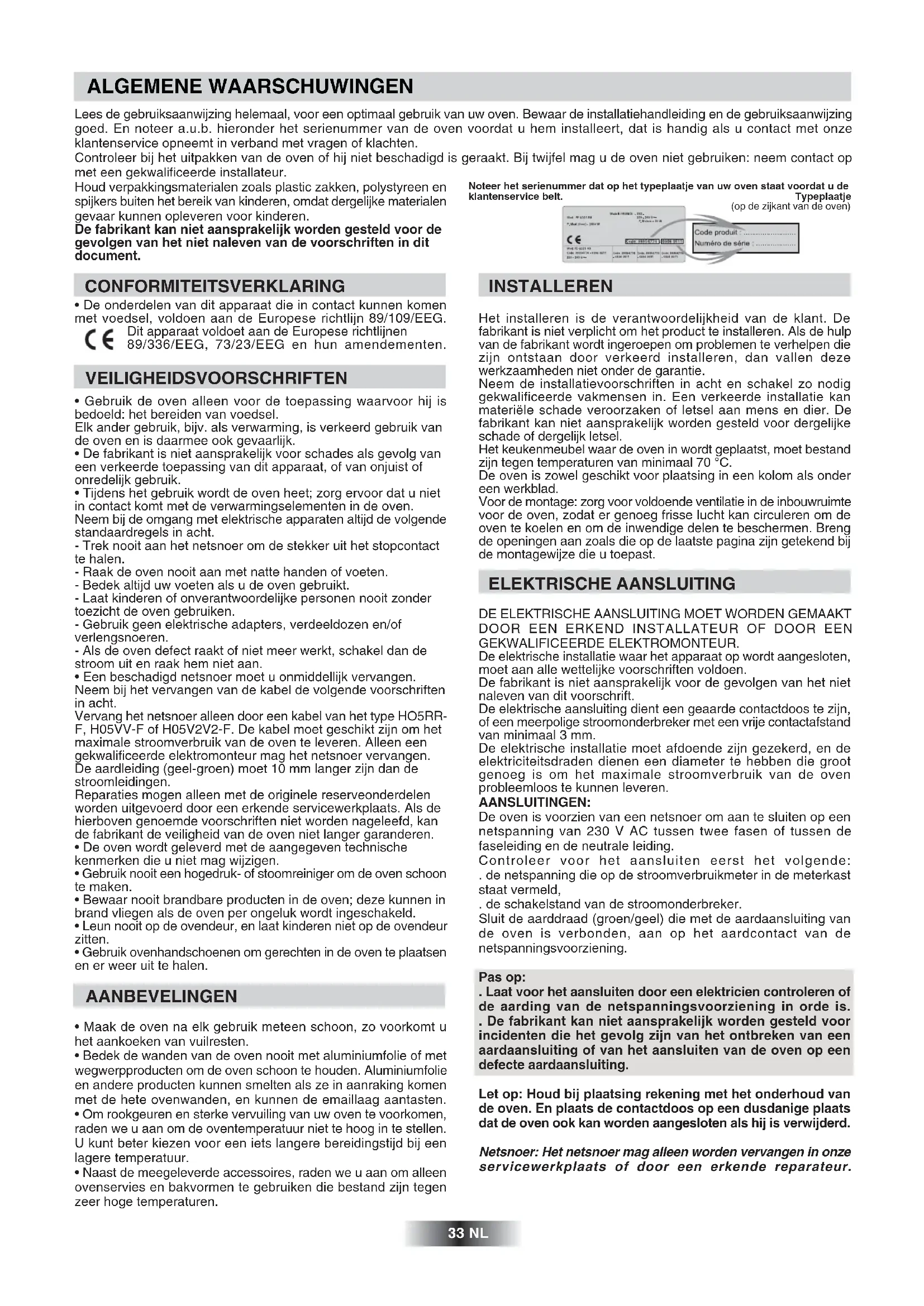 DOOR EEN ERKEND INSTALLATEUR OF DOOR EEN GEKWALIFICEERDE ELEKTROMONTEUR. De elektrische installatie waar het apparaat op wordt aangesloten, moet aan alle wettelijke voorschriften voldoen. De fabrikant is niet aansprakelijk voor de gevolgen van het niet naleven van dit voorschrift. De elektrische aansluiting dient een geaarde contactdoos te zijn, of een meerpolige stroomonderbreker met een vrije contactafstand van minimaal 3 mm. De elektrische installatie moet afdoende zijn gezekerd, en de elektriciteitsdraden dienen een diameter te hebben die groot genoeg is om het maximale stroomverbruik van de oven probleemloos te kunnen leveren. AANSLUITINGEN: De oven is voorzien van een netsnoer om aan te sluiten op een netspanning van 230 V AC tussen twee fasen of tussen de faseleiding en de neutrale leiding. Controleer voor het aansluiten eerst het volgende: . de netspanning die op de stroomverbruikmeter in de meterkast staat vermeld, . de schakelstand van de stroomonderbreker. Sluit de aarddraad (groen/geel) die met de aardaansluiting van de oven is verbonden, aan op het aardcontact van de netspanningsvoorziening. Pas op: . Laat voor het aansluiten door een elektricien controleren of de aarding van de netspanningsvoorziening in orde is. . De fabrikant kan niet aansprakelijk worden gesteld voor incidenten die het gevolg zijn van het ontbreken van een aardaansluiting of van het aansluiten van de oven op een defecte aardaansluiting. Let op: Houd bij plaatsing rekening met het onderhoud van de oven. En plaats de contactdoos op een dusdanige plaats dat de oven ook kan worden aangesloten als hij is verwijderd. Netsnoer: Het netsnoer mag alleen worden vervangen in onze servicewerkplaats of door een erkende reparateur. 33 NL Noteer het serienummer dat op het typeplaatje van uw oven staat voordat u deklantenservice belt. Typeplaatje(op de zijkant van de oven)OVENUITRUSTING (afhankelijk van het model) Reinig de uitrusting voor het eerste gebruik. Neem ze af met een sponsje. Spoel ze schoon en maak ze droog. De ovenplaat is om bakvormen en ovenservies op te plaatsen. De lekbak vangt de sappen op tijdens het grillen. De bakplaat plaatst u óp de ovenplaat. Op deze plaat bakt u klein gebak zoals deegwaren, koekjes, meringhes, enz... Plaats de bakplaat nooit direct op de bodem van de oven, altijd óp de ovenplaat. De grillpan wordt in combinatie met de lekbak gebruikt voor alle soorten grillgerechten. Een handgreep wordt meegeleverd om het geheel uit de oven te kunnen nemen zonder dat u zich brandt. Laat de handgreep nooit in de oven liggen. Tijdens het gebruik van de oven moet u alle niet-gebruikte ovenaccessoires uit de oven verwijderen. TELESCOOPPLAAT MONTAGE-INSTRUCTIES