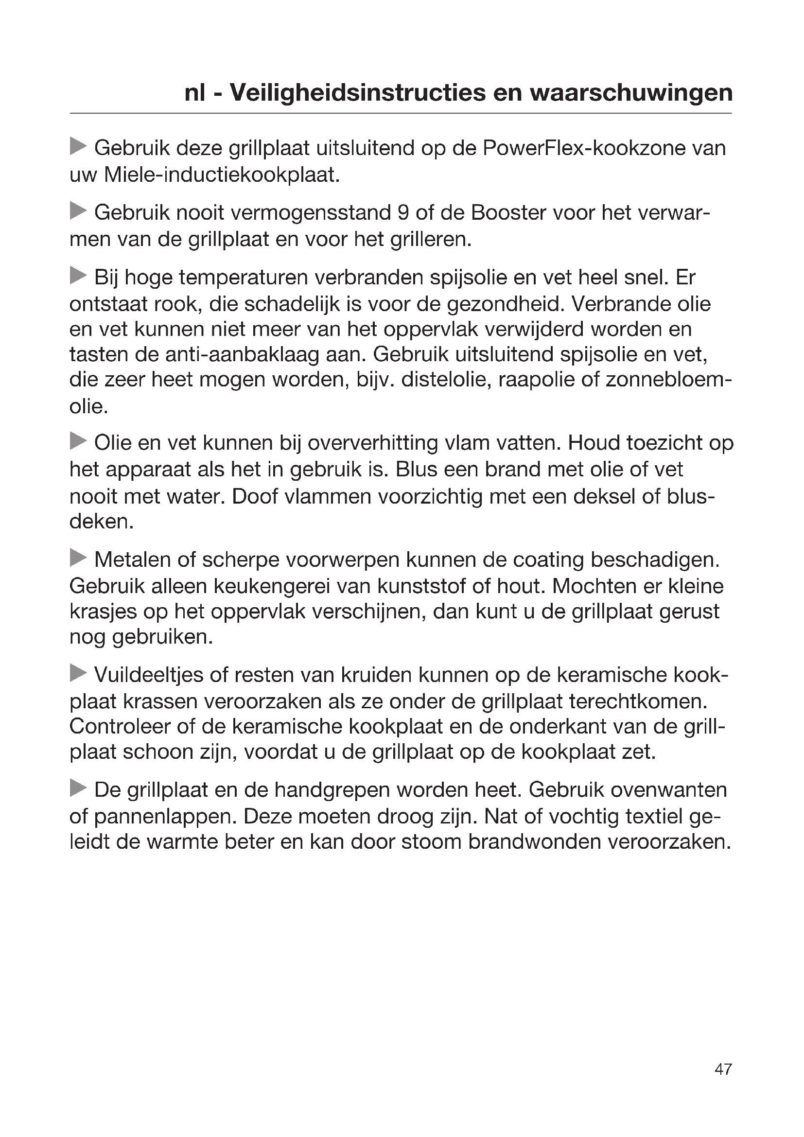 Gebruik deze grillplaat uitsluitend op de PowerFlex-kookzone van uw Miele-inductiekookplaat. Gebruik nooit vermogensstand 9 of de Booster voor het verwar- men van de grillplaat en voor het grilleren. Bij hoge temperaturen verbranden spijsolie en vet heel snel. Er ontstaat rook, die schadelijk is voor de gezondheid. Verbrande olie en vet kunnen niet meer van het oppervlak verwijderd worden en tasten de anti-aanbaklaag aan. Gebruik uitsluitend spijsolie en vet, die zeer heet mogen worden, bijv. distelolie, raapolie of zonnebloem- olie. Olie en vet kunnen bij oververhitting vlam vatten. Houd toezicht op het apparaat als het in gebruik is. Blus een brand met olie of vet nooit met water. Doof vlammen voorzichtig met een deksel of blus- deken. Metalen of scherpe voorwerpen kunnen de coating beschadigen. Gebruik alleen keukengerei van kunststof of hout. Mochten er kleine krasjes op het oppervlak verschijnen, dan kunt u de grillplaat gerust nog gebruiken. Vuildeeltjes of resten van kruiden kunnen op de keramische kook- plaat krassen veroorzaken als ze onder de grillplaat terechtkomen. Controleer of de keramische kookplaat en de onderkant van de grill- plaat schoon zijn, voordat u de grillplaat op de kookplaat zet. De grillplaat en de handgrepen worden heet. Gebruik ovenwanten of pannenlappen. Deze moeten droog zijn. Nat of vochtig textiel ge- leidt de warmte beter en kan door stoom brandwonden veroorzaken.nl - Een bijdrage aan de bescherming van het milieu