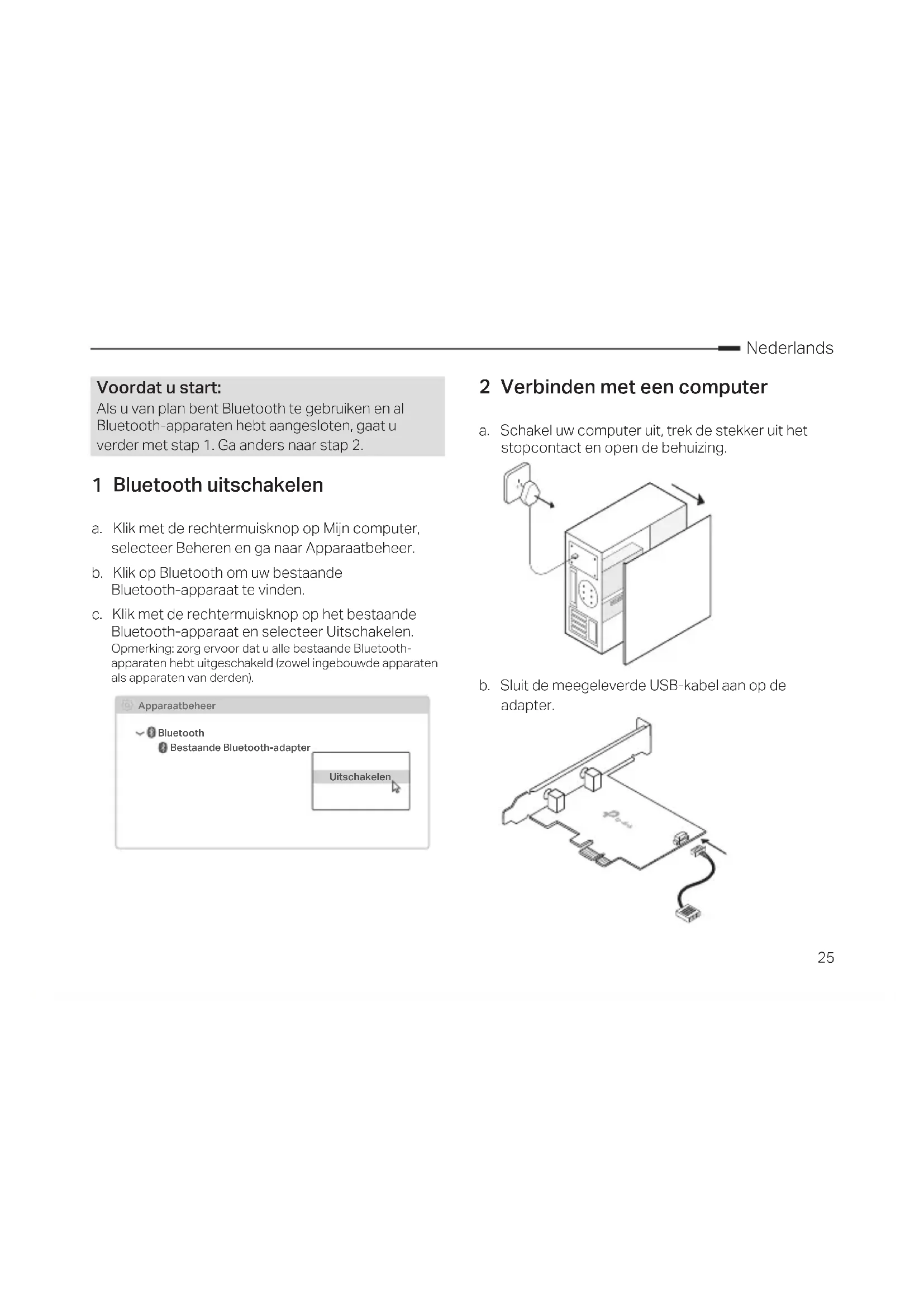 - Bluetooth: Klik op en volg de instructies op het c. Zoek een vrij PCIE X1-slot en sluit de adapter voorzichtig aan. Opmerking: Indien de beugel niet geschikt is voor uw computer, verwijder hem dan van de adapter en vervang hem door een beugel met een laag proel. d. Zoek een vrije F_USB-connector en steek de USB- kabel er voorzichtig in. USB27 Nederlands scherm om de installatie van Bluetooth te voltooien. 4 Verbinding maken met een draadloos netwerk a. Klik op het netwerkpictogram ( of ) op de taakbalk. b. Selecteer uw wi-netwerk, klik op Verbinding maken en voer het wachtwoord in wanneer hier om wordt gevraagd. 5 Koppelen met Bluetooth-apparaten a. Klik met de rechtermuisknop op het (Bluetooth) pictogram op de taakbalk. Indien het pictogram niet wordt weergegeven, moet u eerst Bluetooth inschakelen via Instellingen. b. Selecteer Een Bluetooth-apparaat toevoegen of Een apparaat toevoegen om naar beschikbare apparaten te zoeken. c. Selecteer uw Bluetooth-apparaat uit de lijst en volg de instructies op het scherm om het koppelen te voltooien. Opmerking: Zorg dat Bluetooth is ingeschakeld op uw apparaat en het apparaat zichtbaar is.Svenska