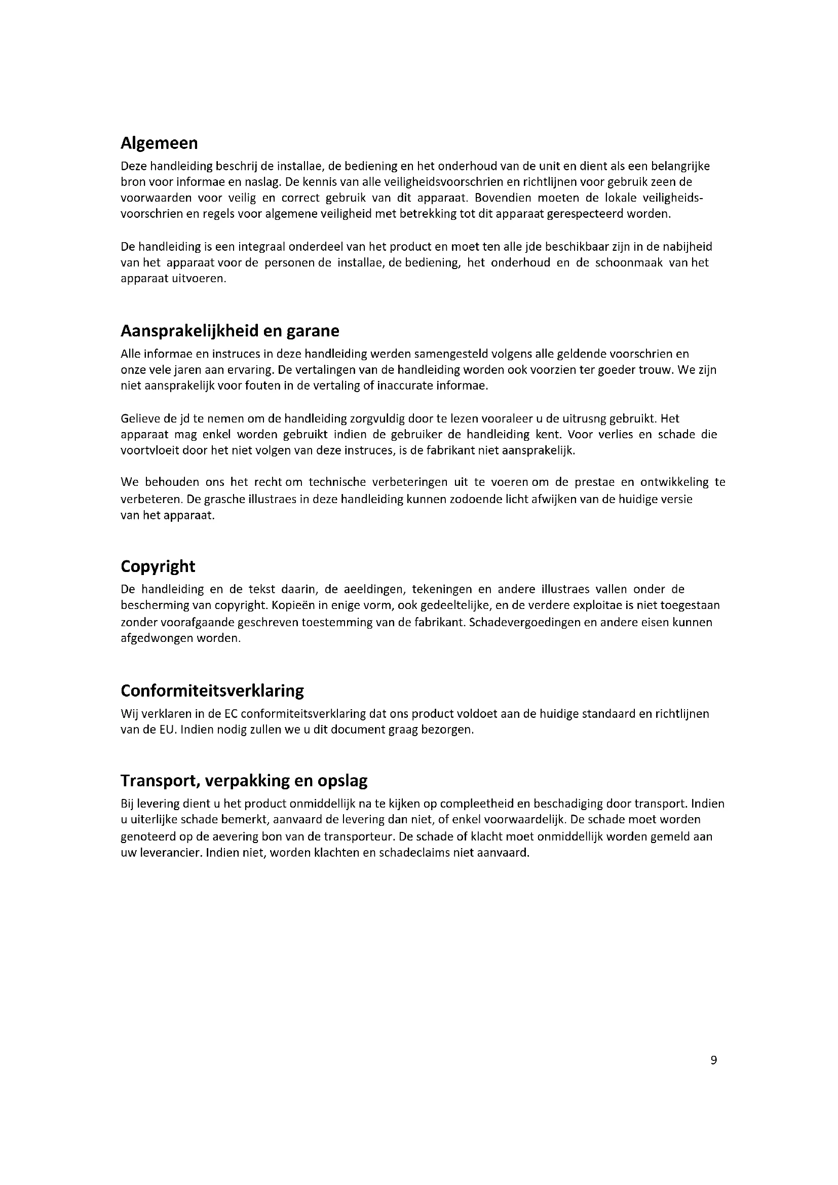 WARNING! Do not clean the device directly with a water jet! So not use a pressure water jet. Allow to cool, before cleaning the device! Cleaning and Maintenance Cleaning instructions: Clean the machine every day. Disconnect the unit from the power supply (pull the plug!) and allow it to cool down before being cleaned. Remove the baking residue after baking while still hot with a paper towel or a damp, soft cloth. Clean it only dry or with a damp cloth. Make sure that no moisture, oil or grease will enter the unit. To clean the body, do not use metallic or sharp objects. Clean the exterior body with a soft cloth and mild detergent every day. Maintenance instructions: From time to time check the power cable for damage. Never use a machine when the cable is damaged. If the cable is damaged, it must be replaced by customer service or a qualified electrician to avoid danger. In case of damage or malfunctions, contact your dealer. Maintenance and repairs must be performed only by qualified personnel using original spare parts and accessories. Never attempt to carry out repairs to the equipment itself. Disposal At the end of its life your old unit is to be disposed of according to national regulations. It is advisable to contact a specialist disposal company. To exclude an abuse and the associated risks, please make sure that your old machine is unusable prior to disposal and poses no danger to others. In case of malfunction, please contact your dealer.9 Algemeen Deze handleiding beschrijft de installatie, de bediening en het onderhoud van de unit en dient als een belangrijke bron voor informatie en naslag. De kennis van alle veiligheidsvoorschriften en richtlijnen voor gebruik zetten de voorwaarden voor veilig en correct gebruik van dit apparaat. Bovendien moeten de lokale veiligheids- voorschriften en regels voor algemene veiligheid met betrekking tot dit apparaat gerespecteerd worden. De handleiding is een integraal onderdeel van het product en moet ten alle tijde beschikbaar zijn in de nabijheid van het apparaat voor de personen de installatie, de bediening, het onderhoud en de schoonmaak van het apparaat uitvoeren. Aansprakelijkheid en garantie Alle informatie en instructies in deze handleiding werden samengesteld volgens alle geldende voorschriften en onze vele jaren aan ervaring. De vertalingen van de handleiding worden ook voorzien ter goeder trouw. We zijn niet aansprakelijk voor fouten in de vertaling of inaccurate informatie. Gelieve de tijd te nemen om de handleiding zorgvuldig door te lezen vooraleer u de uitrusting gebruikt. Het apparaat mag enkel worden gebruikt indien de gebruiker de handleiding kent. Voor verlies en schade die voortvloeit door het niet volgen van deze instructies, is de fabrikant niet aansprakelijk. We behouden ons het recht om technische verbeteringen uit te voeren om de prestatie en ontwikkeling te verbeteren. De grafische illustraties in deze handleiding kunnen zodoende licht afwijken van de huidige versie van het apparaat. Copyright De handleiding en de tekst daarin, de afbeeldingen, tekeningen en andere illustraties vallen onder de bescherming van copyright. Kopieën in enige vorm, ook gedeeltelijke, en de verdere exploitatie is niet toegestaan zonder voorafgaande geschreven toestemming van de fabrikant. Schadevergoedingen en andere eisen kunnen afgedwongen worden. Conformiteitsverklaring Wij verklaren in de EC conformiteitsverklaring dat ons product voldoet aan de huidige standaard en richtlijnen van de EU. Indien nodig zullen we u dit document graag bezorgen. Transport, verpakking en opslag Bij levering dient u het product onmiddellijk na te kijken op compleetheid en beschadiging door transport. Indien u uiterlijke schade bemerkt, aanvaard de levering dan niet, of enkel voorwaardelijk. De schade moet worden genoteerd op de aflevering bon van de transporteur. De schade of klacht moet onmiddellijk worden gemeld aan uw leverancier. Indien niet, worden klachten en schadeclaims niet aanvaard.10 Veiligheid- en gebruiksinstructies De unit werd gebouwd volgens de huidige regels van kunst. Gevaarlijke situaties kunnen ontstaan door dit apparaat indien het incorrect of niet volgens de aangegeven specificaties wordt gebruikt. De kennis van de inhoud van deze handleiding is een van de vereisten om u tegen gevaar te beschermen, om foutief gebruik te vermijden en om het toestel veilig en vlot te kunnen gebruiken. Om gevaarlijke situaties te vermijden en om optimale prestatie te verzekeren, mogen geen aanpassingen of wijzigingen aan het apparaat gebeuren anders dan die specifiek erkend door de fabrikant. Het apparaat kan worden gebruikt in een technisch foutloze en betrouwbare toestand. De informatie over arbeidsveiligheid is gerelateerd aan de huidige richtlijnen van de Europese Unie, geldend op het moment van de fabricage van het apparaat. De gebruiker is verplicht om de conformiteit van de ontworpen veiligheidsmaatregelen te toetsen aan de huidig geldende regelgeving en nieuwe regels te volgen gedurende de volledige levensduur van het apparaat. Buiten de Europese Unie moeten de lokale veiligheidsvoorschriften en - wetten gerespecteerd worden. In aanvulling op de veiligheidsinstructies in deze handleiding, dient u algemeen geldende veiligheids- voorschriften en preventiemaatregelen toe te passen in de gebruiksomgeving van het apparaat, en de toepasselijke milieuvoorschriften te volgen. Instructies voor gebruik Deze unit werd ontworpen voor commercieel gebruik. Ontworpen, gebouwd en bediend enkel door gekwalificeerd personeel in professionele keukens. De betrouwbaarheid van het apparaat is enkel gegarandeerd indien het wordt gebruikt zoals specifiek aangegeven in de handleiding. Alle technische procedures, inclusief de opstelling en het onderhoud, zullen exclusief gebeuren door gekwalificeerde onderhoudstechnici. De crêpe makers zijn enkel bedoeld voor het maken van crêpes en gelijkaardige producten. Dit apparaat is niet ontworpen om te worden te gebruikt door indiv