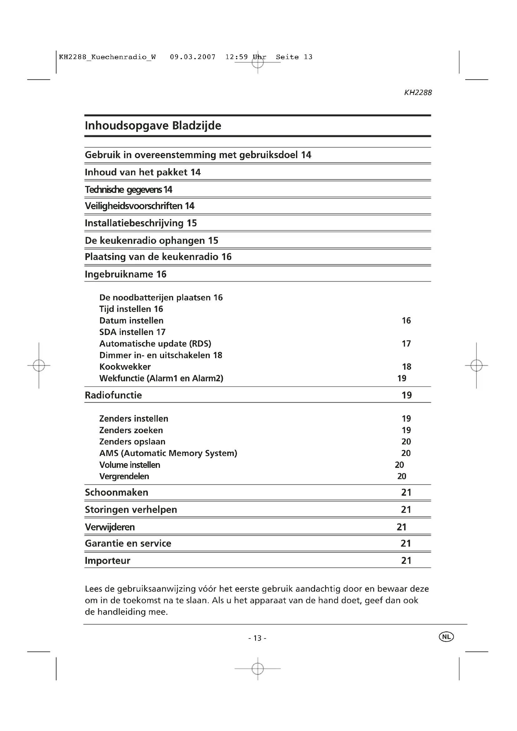 KH2288 Inhoudsopgave Bladzijde Gebruik in overeenstemming met gebruiksdoel 14 Inhoud van het pakket 14 Technische gegevens 14 Veiligheidsvoorschriften 14 Installatiebeschrijving 15 De keukenradio ophangen 15 Plaatsing van de keukenradio 16 Ingebruikname 16 De noodbatterijen plaatsen 16 Tijd instellen 16 Datum instellen 16 SDA instellen 17 Automatische update (RDS) 17 Dimmer in- en uitschakelen 18 Kookwekker 18 Wekfunctie (Alarm1 en Alarm2) 19 Radiofunctie 19 Zenders instellen 19 Zenders zoeken 19 Zenders opslaan 20 AMS (Automatic Memory System) 20 Volume instellen 20 Vergrendelen 20 Schoonmaken 21 Storingen verhelpen 21 Verwijderen 21 Garantie en service 21 Importeur 21 Lees de gebruiksaanwijzing vóór het eerste gebruik aandachtig door en bewaar deze om in de toekomst na te slaan. Als u het apparaat van de hand doet, geef dan ook de handleiding mee. KH2288_Kuechenradio_W 09.03.2007 12:59 Uhr Seite 13- 14 -