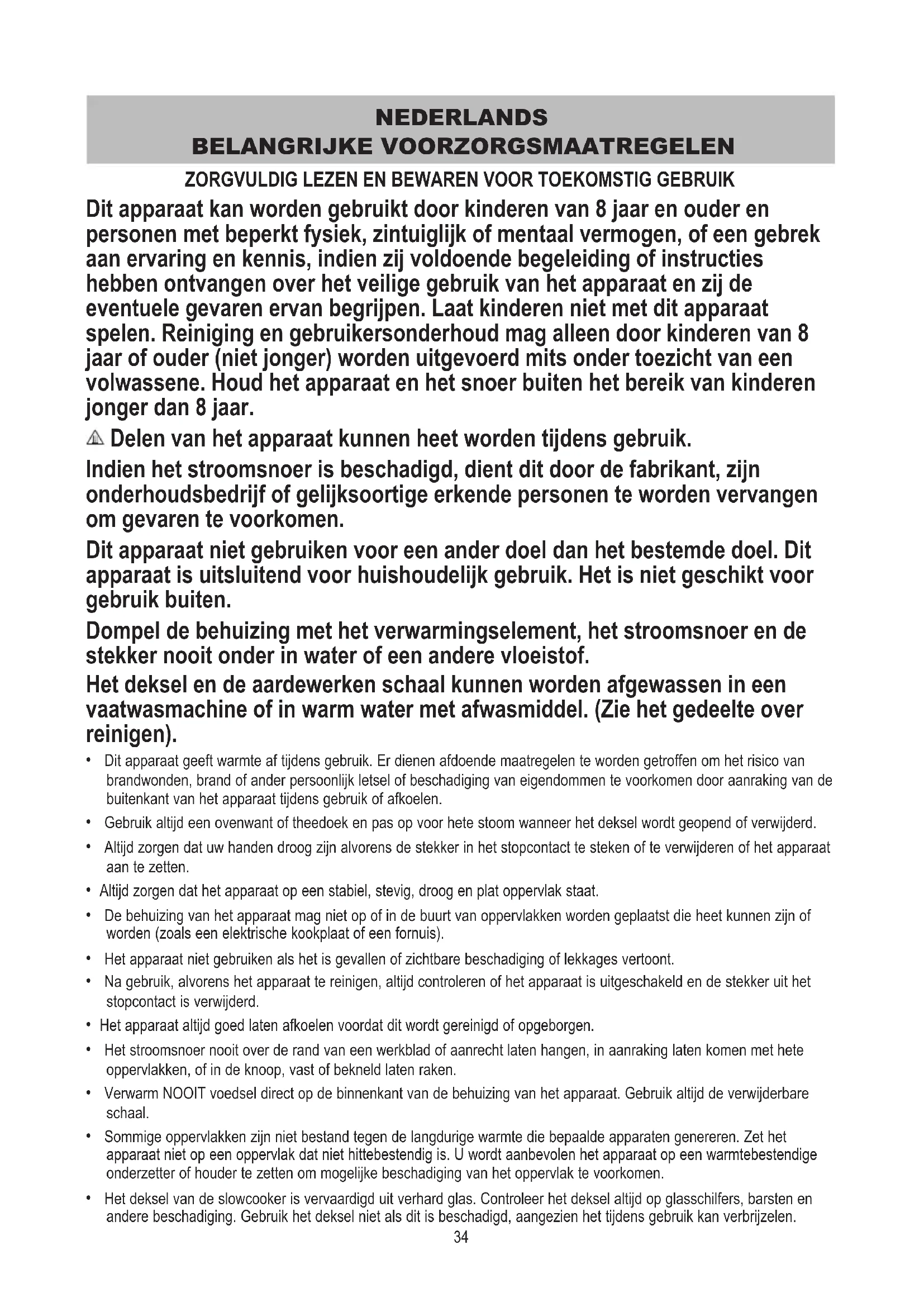 - l’apparecchiatura non sia stata modificata in alcun modo né soggetta a danni, uso improprio o abuso, a riparazione o alterazione per opera di un tecnico non autorizzato da JCS (Europe). I guasti intervenuti durante l’uso normale, per uso improprio, danno, abuso, tensione incorretta, cause naturali, eventi non determinati da JCS (Europe), riparazione o alterazione per opera di un tecnico non autorizzato da JCS (Europe) o la mancata ottemperanza alle istruzioni d’uso sono esclusi dalla presente garanzia. Inoltre, l’uso normale compreso, a titolo di esempio, una lieve alterazione del colore (sbiadimento) e i graffi, non sono coperti dalla presente garanzia. I diritti spettante all’utente ai sensi della presente garanzia si applicano unicamente all’acquirente originale e non si estendono all’uso commerciale o comunitario. Se l’apparecchiatura è fornita con un accordo specifico per il paese o una cartolina di garanzia, consultare le condizioni di tale accordo, che prevalgono su quelle esposte in questa sede oppure rivolgersi a un rivenditore autorizzato per ulteriori informazioni. Gli apparecchi elettrici non devono essere smaltiti insieme ai rifiuti domestici. Riciclare laddove esistano appositi impianti. Inviare una e-mail a enquiriesEurope@jardencs.com per ulteriori informazioni sul riciclo e sulla direttiva RAEE. Jarden Consumer Solutions (Europe) Limited 5400 Lakeside Cheadle Royal Business Park Cheadle SK8 3GQ United Kingdom34 NEDERLANDS BELANGRIJKE VOORZORGSMAATREGELEN ZORGVULDIG LEZEN EN BEWAREN VOOR TOEKOMSTIG GEBRUIK Dit apparaat kan worden gebruikt door kinderen van 8 jaar en ouder en personen met beperkt fysiek, zintuiglijk of mentaal vermogen, of een gebrek aan ervaring en kennis, indien zij voldoende begeleiding of instructies hebben ontvangen over het veilige gebruik van het apparaat en zij de eventuele gevaren ervan begrijpen. Laat kinderen niet met dit apparaat spelen. Reiniging en gebruikersonderhoud mag alleen door kinderen van 8 jaar of ouder (niet jonger) worden uitgevoerd mits onder toezicht van een volwassene. Houd het apparaat en het snoer buiten het bereik van kinderen jonger dan 8 jaar. Delen van het apparaat kunnen heet worden tijdens gebruik. Indien het stroomsnoer is beschadigd, dient dit door de fabrikant, zijn onderhoudsbedrijf of gelijksoortige erkende personen te worden vervangen om gevaren te voorkomen. Dit apparaat niet gebruiken voor een ander doel dan het bestemde doel. Dit apparaat is uitsluitend voor huishoudelijk gebruik. Het is niet geschikt voor gebruik buiten. Dompel de behuizing met het verwarmingselement, het stroomsnoer en de stekker nooit onder in water of een andere vloeistof. Het deksel en de aardewerken schaal kunnen worden afgewassen in een vaatwasmachine of in warm water met afwasmiddel. (Zie het gedeelte over reinigen).