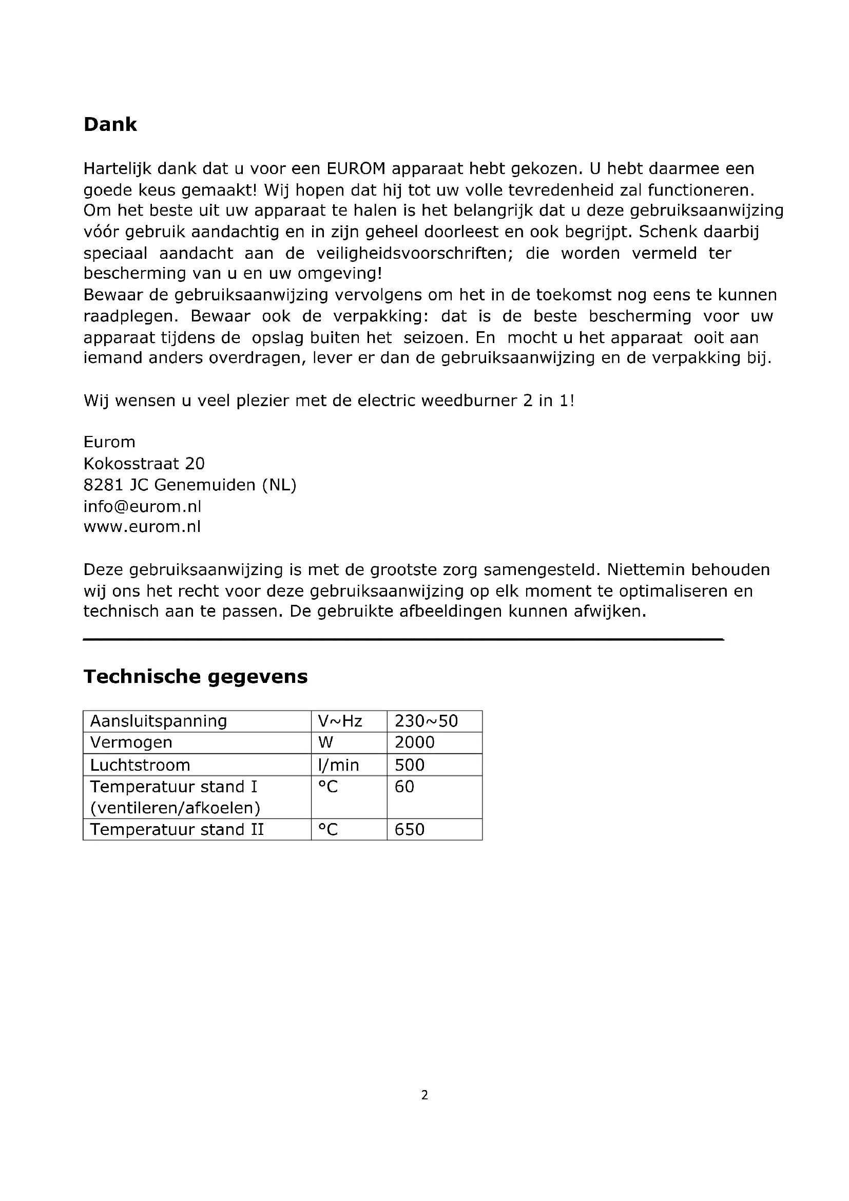 Dank Hartelijk dank dat u voor een EUROM apparaat hebt gekozen. U hebt daarmee een goede keus gemaakt! Wij hopen dat hij tot uw volle tevredenheid zal functioneren. Om het beste uit uw apparaat te halen is het belangrijk dat u deze gebruiksaanwijzing vóór gebruik aandachtig en in zijn geheel doorleest en ook begrijpt. Schenk daarbij speciaal aandacht aan de veiligheidsvoorschriften; die worden vermeld ter bescherming van u en uw omgeving! Bewaar de gebruiksaanwijzing vervolgens om het in de toekomst nog eens te kunnen raadplegen. Bewaar ook de verpakking: dat is de beste bescherming voor uw apparaat tijdens de opslag buiten het seizoen. En mocht u het apparaat ooit aan iemand anders overdragen, lever er dan de gebruiksaanwijzing en de verpakking bij. Wij wensen u veel plezier met de electric weedburner 2 in 1! Eurom Kokosstraat 20 8281 JC Genemuiden (NL) info@eurom.nl www.eurom.nl Deze gebruiksaanwijzing is met de grootste zorg samengesteld. Niettemin behouden wij ons het recht voor deze gebruiksaanwijzing op elk moment te optimaliseren en technisch aan te passen. De gebruikte afbeeldingen kunnen afwijken.