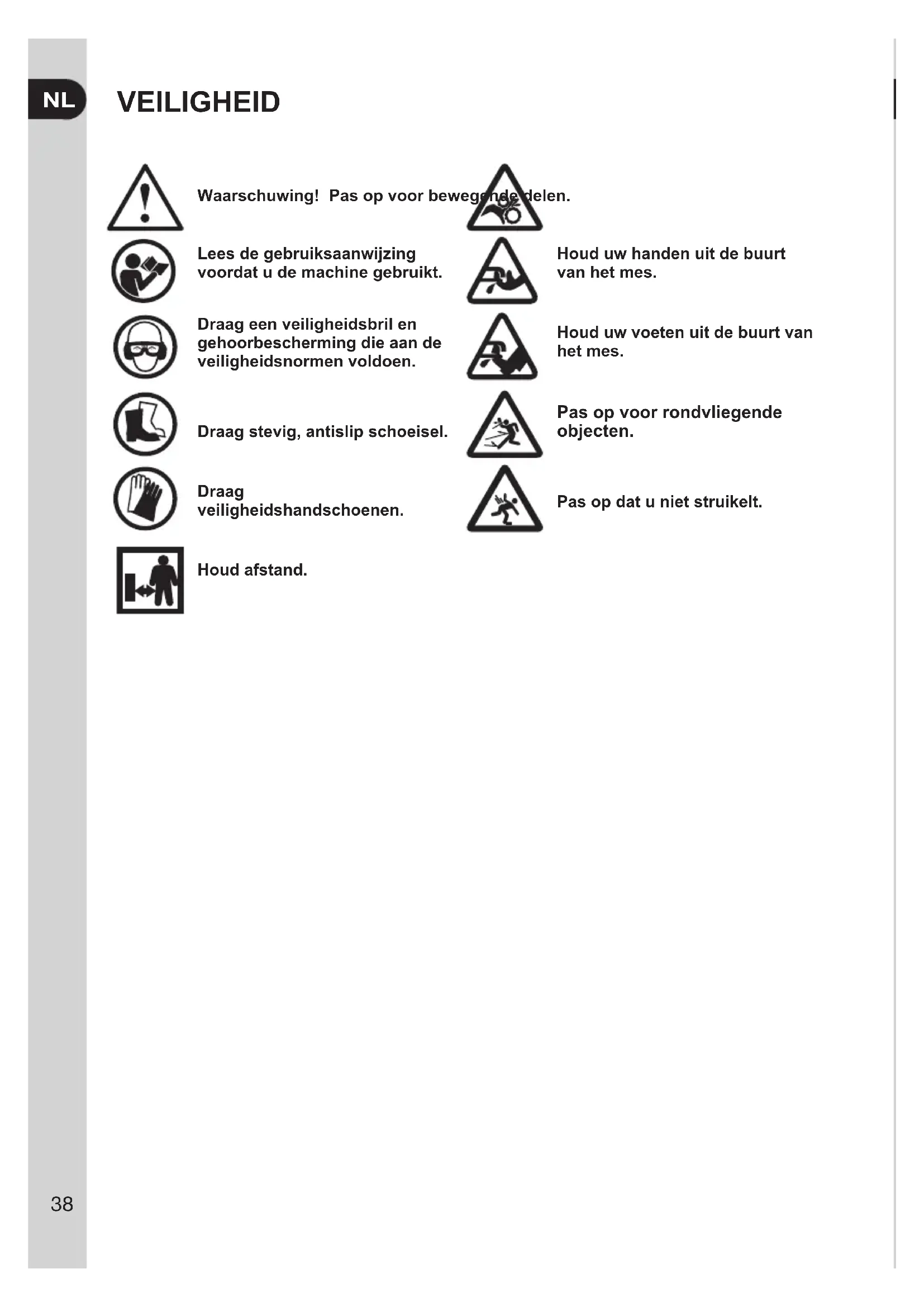 Veiligheid 38 Montage 39 Bediening 40 Onderhoud 40VEILIGHEID Waarschuwing! Pasopvoorbewegendedelen. Leesdegebruiksaanwijzing voordatudemachinegebruikt. Houduwhandenuitdebuurt vanhetmes. Draageenveiligheidsbrilen gehoorbeschermingdieaande veiligheidsnormenvoldoen. Houduwvoetenuitdebuurtvan hetmes. Draagstevig,antislipschoeisel. Pasopvoorrondvliegende objecten. Draag veiligheidshandschoenen. Pasopdatunietstruikelt. Houdafstand.