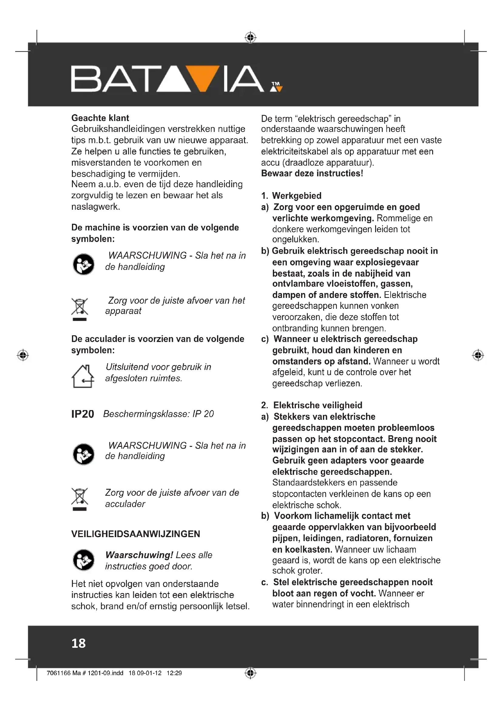 Do not dispose of electric power tools with domestic refuse. The tool is shipped in packaging to reduce transport damage. This packaging is a raw material and as such can either be reused or can be fed back into the raw material cycle. The tool and its accessories are made from various materials such as metals and plastics. Take defective components to a special refuse collection point. Ask about these at your specialist shop or local council. The product and the user manual may be subject to changes. Technical data may be changed without prior notice. 7061166 Ma # 1201-09.indd 17 09-01-12 12:29Geachte klant Gebruikshandleidingen verstrekken nuttige tips m.b.t. gebruik van uw nieuwe apparaat. Ze helpen u alle functies te gebruiken, misverstanden te voorkomen en beschadiging te vermijden. Neem a.u.b. even de tijd deze handleiding zorgvuldig te lezen en bewaar het als naslagwerk. De machine is voorzien van de volgende symbolen: WAARSCHUWING - Sla het na in de handleiding Zorg voor de juiste afvoer van het apparaat De acculader is voorzien van de volgende symbolen: Uitsluitend voor gebruik in afgesloten ruimtes. IP20