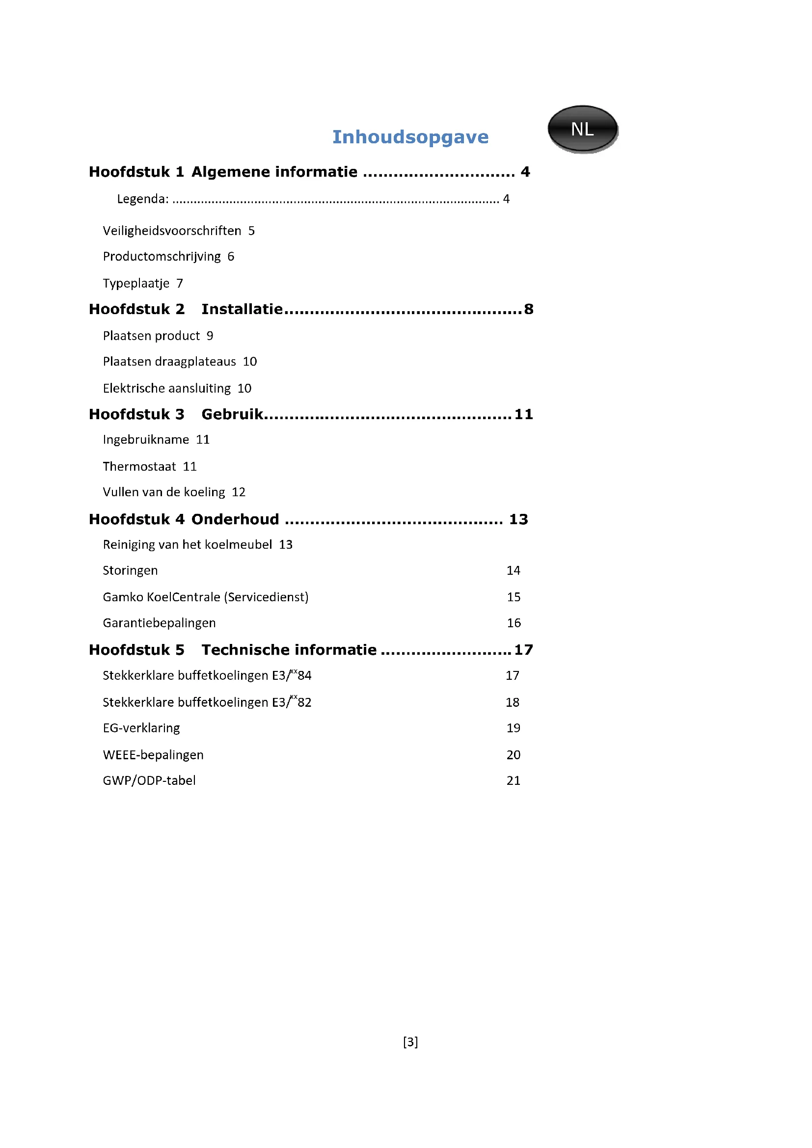 - Reiniging van het koelmeubel 13 Storingen 14 Gamko KoelCentrale (Servicedienst) 15 Garantiebepalingen 16 Hoofdstuk 5 Technische informatie Stekkerklare buffetkoelingen E3/ p. 17