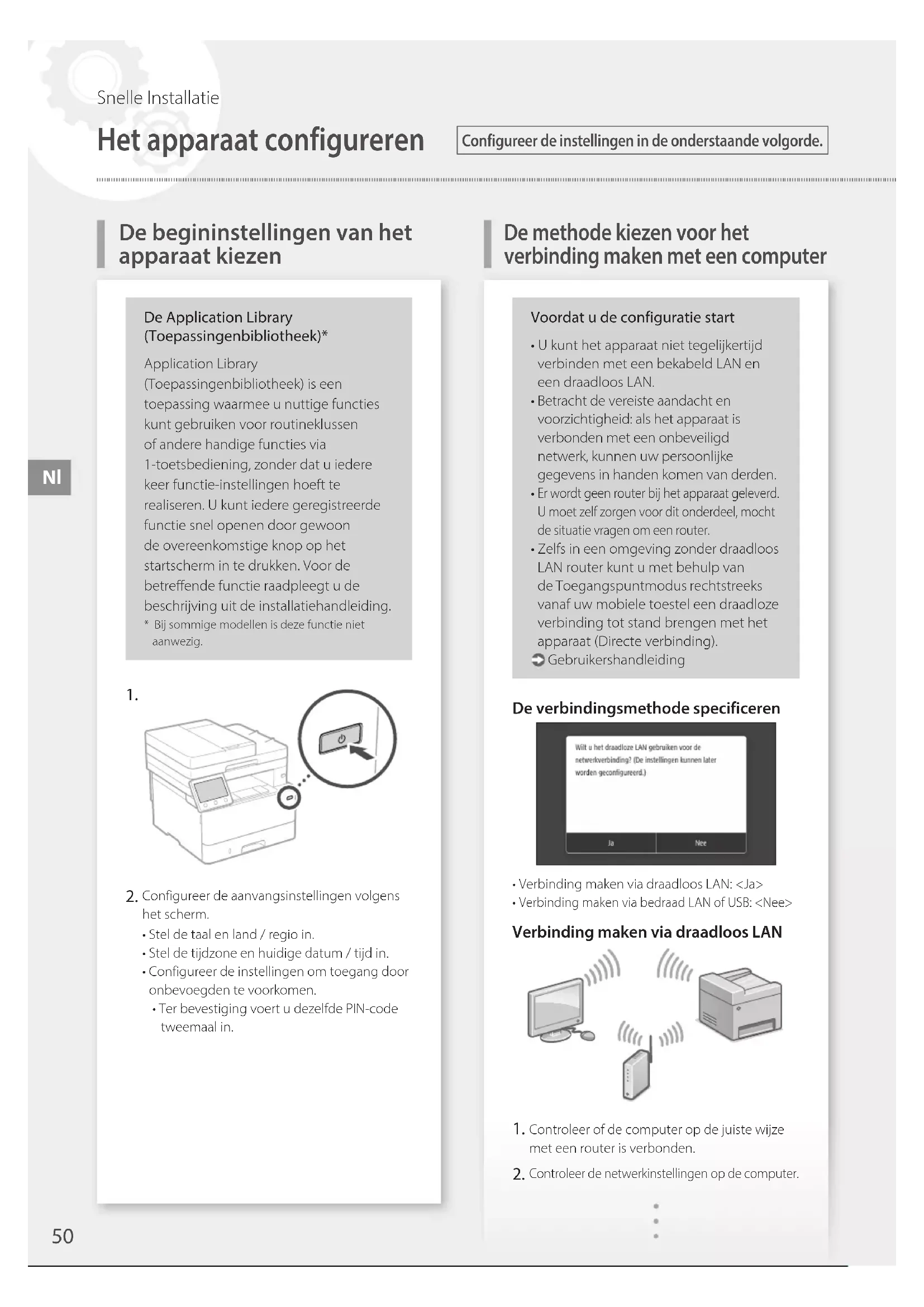 Configureer de aanvangsinstellingen volgens het scherm.• Stel de taal en land / regio in.• Stel de tijdzone en huidige datum / tijd in.• Configureer de instellingen om toegang door onbevoegden te voorkomen.• Ter bevestiging voert u dezelfde PIN-code tweemaal in.Voordat u de configuratie start• U kunt het apparaat niet tegelijkertijd verbinden met een bekabeld LAN en een draadloos LAN.• Betracht de vereiste aandacht en voorzichtigheid: als het apparaat is verbonden met een onbeveiligd netwerk, kunnen uw persoonlijke gegevens in handen komen van derden. Er wordt geen router bij het apparaat geleverd. U moet zelf zorgen voor dit onderdeel, mocht de situatie vragen om een router.• Zelfs in een omgeving zonder draadloos LAN router kunt u met behulp van de Toegangspuntmodus rechtstreeks vanaf uw mobiele toestel een draadloze verbinding tot stand brengen met het apparaat (Directe verbinding). GebruikershandleidingDe verbindingsmethode specificeren• Verbinding maken via draadloos LAN: <Ja> Verbinding maken via bedraad LAN of USB: <Nee>Verbinding maken via draadloos LAN Controleer of de computer op de juiste wijze met een router is verbonden. Controleer de netwerkinstellingen op de computer.
