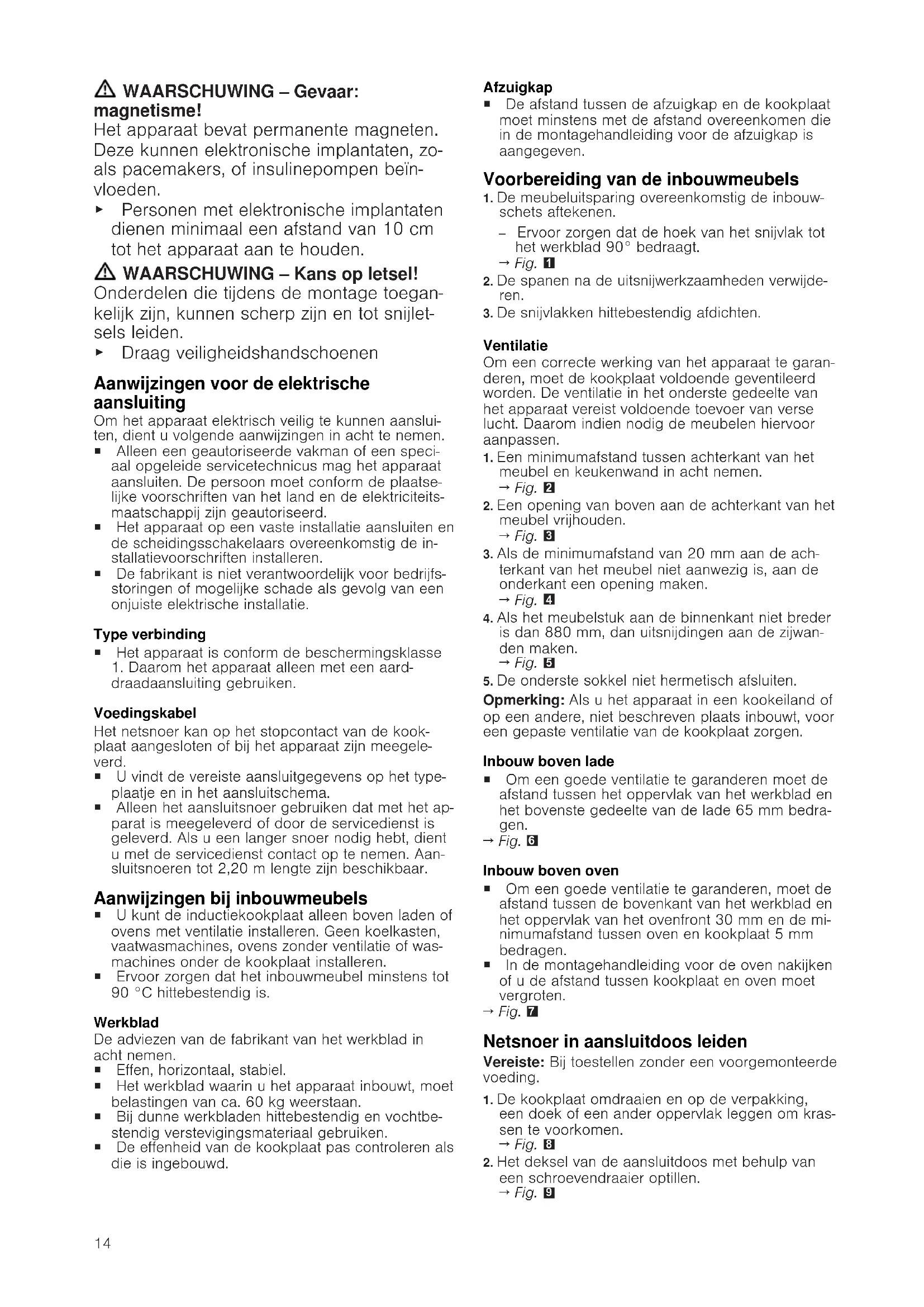 Algemene aanwijzingen ¡ Lees deze gebruiksaanwijzing zorgvuldig door. ¡ Alleen een geautoriseerde vakman mag het apparaat aansluiten. ¡ Een ondeskundige installatie, opening van het apparaat, verbinding of montage leidt tot het verlies van de geldigheid van de productgarantie. ¡ Sluit voor aanvang van alle werkzaamhe- den altijd de stroomtoevoer af. ¡ Na de installatie garanderen dat de ge- bruiker geen toegang tot de elektrische componenten heeft. ¡ Dit apparaat nooit in boten of voertuigen gebruiken. Veilige montage Neem bij het monteren van het apparaat de veiligheidsaanwijzingen in acht. Alleen bij een deskundige inbouw overeen- komstig de montagehandleiding is de veilig- heid bij het gebruik gegarandeerd. De in- stallateur is voor het perfect functioneren op de plaats van opstelling verantwoordelijk.14 WAARSCHUWING‒Gevaar: magnetisme! Het apparaat bevat permanente magneten. Deze kunnen elektronische implantaten, zo- als pacemakers, of insulinepompen beïn- vloeden. ▶ Personen met elektronische implantaten dienen minimaal een afstand van 10 cm tot het apparaat aan te houden. WAARSCHUWING‒Kans op letsel! Onderdelen die tijdens de montage toegan- kelijk zijn, kunnen scherp zijn en tot snijlet- sels leiden. ▶ Draag veiligheidshandschoenen Aanwijzingen voor de elektrische aansluiting Om het apparaat elektrisch veilig te kunnen aanslui- ten, dient u volgende aanwijzingen in acht te nemen. ¡ Alleen een geautoriseerde vakman of een speci- aal opgeleide servicetechnicus mag het apparaat aansluiten. De persoon moet conform de plaatse- lijke voorschriften van het land en de elektriciteits- maatschappij zijn geautoriseerd. ¡ Het apparaat op een vaste installatie aansluiten en de scheidingsschakelaars overeenkomstig de in- stallatievoorschriften installeren. ¡ De fabrikant is niet verantwoordelijk voor bedrijfs- storingen of mogelijke schade als gevolg van een onjuiste elektrische installatie. Type verbinding ¡ Het apparaat is conform de beschermingsklasse