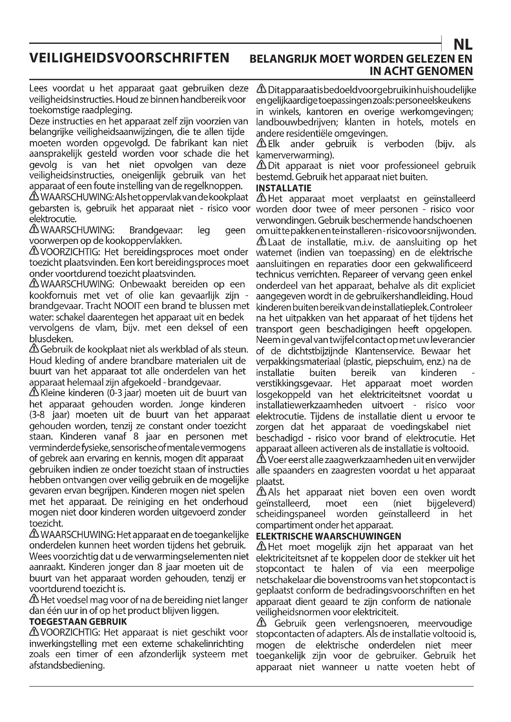 Lees voordat u het apparaat gaat gebruiken deze veiligheidsinstructies. Houd ze binnen handbereik voor toekomstige raadpleging. Deze instructies en het apparaat zelf zijn voorzien van belangrijke veiligheidsaanwijzingen, die te allen tijde moeten worden opgevolgd. De fabrikant kan niet aansprakelijk gesteld worden voor schade die het gevolg is van het niet opvolgen van deze veiligheidsinstructies, oneigenlijk gebruik van het apparaat of een foute instelling van de regelknoppen. WAARSCHUWING: Als het oppervlak van de kookplaat gebarsten is, gebruik het apparaat niet - risico voor elektrocutie. WAARSCHUWING: Brandgevaar: leg geen voorwerpen op de kookoppervlakken. VOORZICHTIG: Het bereidingsproces moet onder toezicht plaatsvinden. Een kort bereidingsproces moet onder voortdurend toezicht plaatsvinden. WAARSCHUWING: Onbewaakt bereiden op een kookfornuis met vet of olie kan gevaarlijk zijn - brandgevaar. Tracht NOOIT een brand te blussen met water: schakel daarentegen het apparaat uit en bedek vervolgens de vlam, bijv. met een deksel of een blusdeken. Gebruik de kookplaat niet als werkblad of als steun. Houd kleding of andere brandbare materialen uit de buurt van het apparaat tot alle onderdelen van het apparaat helemaal zijn afgekoeld - brandgevaar. Kleine kinderen (0-3jaar) moeten uit de buurt van het apparaat gehouden worden. Jonge kinderen (3-8 jaar) moeten uit de buurt van het apparaat gehouden worden, tenzij ze constant onder toezicht staan. Kinderen vanaf 8 jaar en personen met verminderde fysieke, sensorische of mentale vermogens of gebrek aan ervaring en kennis, mogen dit apparaat gebruiken indien ze onder toezicht staan of instructies hebben ontvangen over veilig gebruik en de mogelijke gevaren ervan begrijpen. Kinderen mogen niet spelen met het apparaat. De reiniging en het onderhoud mogen niet door kinderen worden uitgevoerd zonder toezicht. WAARSCHUWING: Het apparaat en de toegankelijke onderdelen kunnen heet worden tijdens het gebruik. Wees voorzichtig dat u de verwarmingselementen niet aanraakt. Kinderen jonger dan 8 jaar moeten uit de buurt van het apparaat worden gehouden, tenzij er voortdurend toezicht is. Het voedsel mag voor of na de bereiding niet langer dan één uur in of op het product blijven liggen. TOEGESTAAN GEBRUIK VOORZICHTIG: Het apparaat is niet geschikt voor inwerkingstelling met een externe schakelinrichting zoals een timer of een afzonderlijk systeem met afstandsbediening. Dit apparaat is bedoeld voor gebruik in huishoudelijke en gelijkaardige toepassingen zoals: personeelskeukens in winkels, kantoren en overige werkomgevingen; landbouwbedrijven; klanten in hotels, motels en andere residentiële omgevingen. Elk ander gebruik is verboden (bijv. als kamerverwarming). Dit apparaat is niet voor professioneel gebruik bestemd. Gebruik het apparaat niet buiten. INSTALLATIE Het apparaat moet verplaatst en geïnstalleerd worden door twee of meer personen - risico voor verwondingen. Gebruik beschermende handschoenen om uit te pakken en te installeren - risico voor snijwonden. Laat de installatie, m.i.v. de aansluiting op het waternet (indien van toepassing) en de elektrische aansluitingen en reparaties door een gekwaliceerd technicus verrichten. Repareer of vervang geen enkel onderdeel van het apparaat, behalve als dit expliciet aangegeven wordt in de gebruikershandleiding. Houd kinderen buiten bereik van de installatieplek. Controleer na het uitpakken van het apparaat of het tijdens het transport geen beschadigingen heeft opgelopen. Neem in geval van twijfel contact op met uw leverancier of de dichtstbijzijnde Klantenservice. Bewaar het verpakkingsmateriaal (plastic, piepschuim, enz.) na de installatie buiten bereik van kinderen - verstikkingsgevaar. Het apparaat moet worden losgekoppeld van het elektriciteitsnet voordat u installatiewerkzaamheden uitvoert - risico voor elektrocutie. Tijdens de installatie dient u ervoor te zorgen dat het apparaat de voedingskabel niet beschadigd - risico voor brand of elektrocutie. Het apparaat alleen activeren als de installatie is voltooid. Voer eerst alle zaagwerkzaamheden uit en verwijder alle spaanders en zaagresten voordat u het apparaat plaatst. Als het apparaat niet boven een oven wordt geïnstalleerd, moet een (niet bijgeleverd) scheidingspaneel worden geïnstalleerd in het compartiment onder het apparaat. ELEKTRISCHE WAARSCHUWINGEN Het moet mogelijk zijn het apparaat van het elektriciteitsnet af te koppelen door de stekker uit het stopcontact te halen of via een meerpolige netschakelaar die bovenstrooms van het stopcontact is geplaatst conform de bedradingsvoorschriften en het apparaat dient geaard te zijn conform de nationale veiligheidsnormen voor elektriciteit. Gebruik geen verlengsnoeren, meervoudige stopcontacten of adapters. Als de installatie voltooid is, mogen de elektrische onderdelen niet meer toegankelijk zijn voor de gebruiker. Gebruik het apparaat niet wanneer u natte voeten hebt ofblootsvoets bent. Gebruik het apparaat niet als de stroomkabel of de stekker beschadigd is, als het apparaat niet goed werkt of als het beschadigd of gevallen is. Installatie met behulp van een netsnoerstekker is niet toegestaan, tenzij het product reeds is uitgerust met de door de fabrikant geleverde stekker. Als het netsnoer beschadigd is, moet het vervangen worden door de fabrikant, een ser vicevertegenwoordiger of gekwaliceerd personeel om risico’s te voorkomen - risico voor elektrocutie.