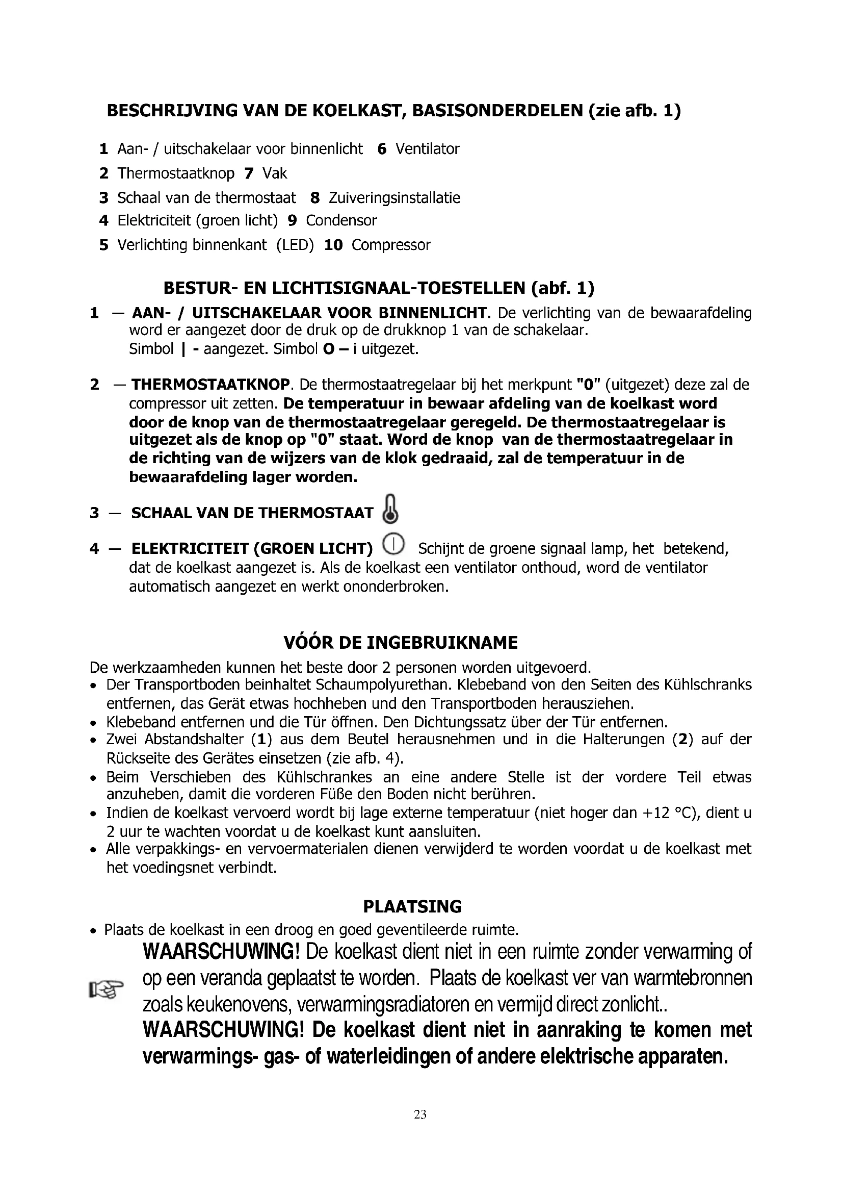 BESCHRIJVING VAN DE KOELKAST, BASISONDERDELEN (zie afb. 1) 1 Aan- / uitschakelaar voor binnenlicht 6 Ventilator 2 Thermostaatknop 7 Vak 3 Schaal van de thermostaat 8 Zuiveringsinstallatie 4 Elektriciteit (groen licht) 9 Condensor 5 Verlichting binnenkant (LED) 10 Compressor BESTUR- EN LICHTISIGNAAL-TOESTELLEN (abf. 1) 1 ― AAN- / UITSCHAKELAAR VOOR BINNENLICHT. De verlichting van de bewaarafdeling word er aangezet door de druk op de drukknop 1 van de schakelaar. Simbol | - aangezet. Simbol O – i uitgezet. 2 ― THERMOSTAATKNOP. De thermostaatregelaar bij het merkpunt "0" (uitgezet) deze zal de compressor uit zetten. De temperatuur in bewaar afdeling van de koelkast word door de knop van de thermostaatregelaar geregeld. De thermostaatregelaar is uitgezet als de knop op "0" staat. Word de knop van de thermostaatregelaar in de richting van de wijzers van de klok gedraaid, zal de temperatuur in de bewaarafdeling lager worden.