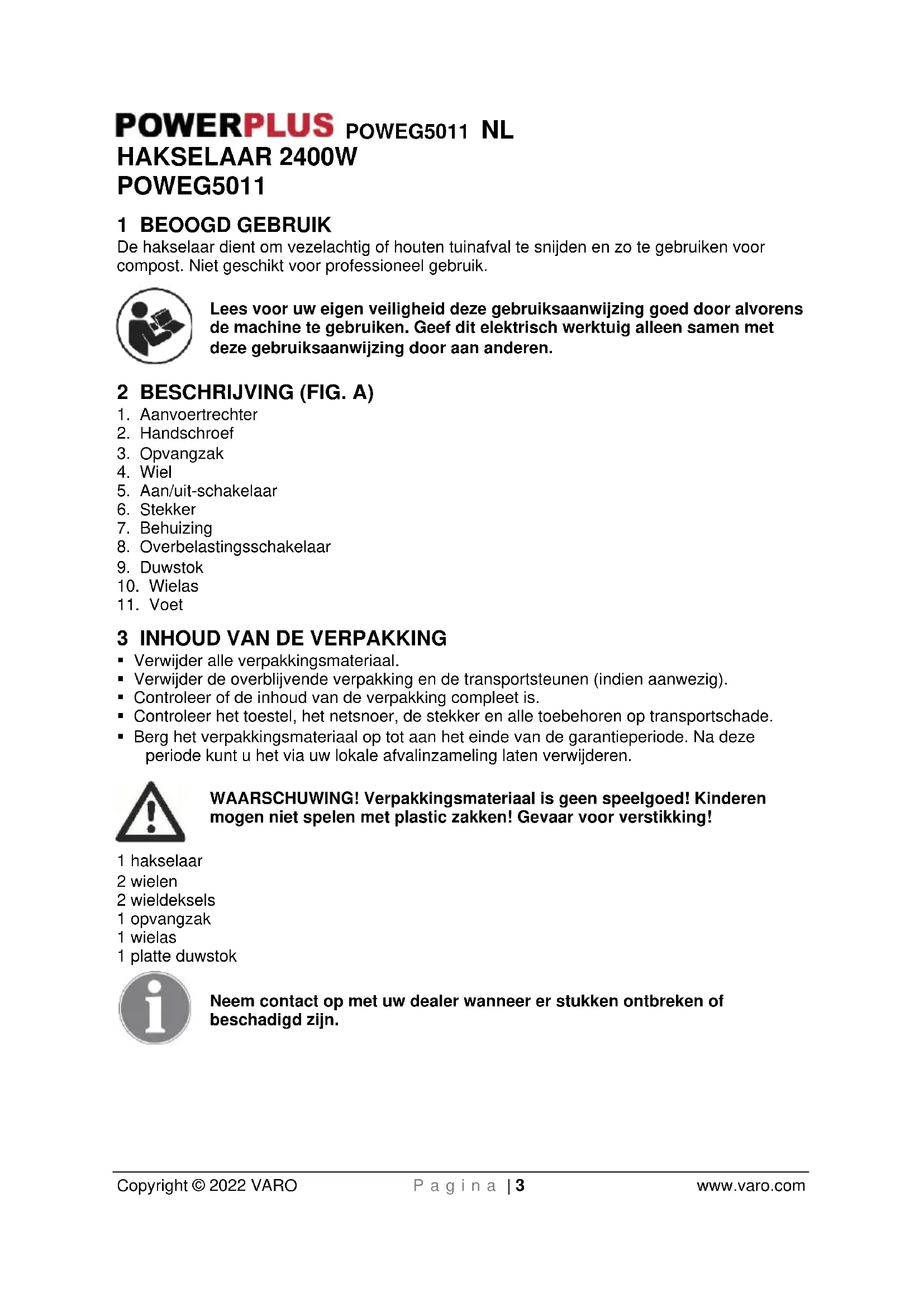 - Berg het verpakkingsmateriaal op tot aan het einde van de garantieperiode. Na deze periode kunt u het via uw lokale afvalinzameling laten verwijderen. WAARSCHUWING! Verpakkingsmateriaal is geen speelgoed! Kinderen mogen niet spelen met plastic zakken! Gevaar voor verstikking! 1 hakselaar 2 wielen 2 wieldeksels 1 opvangzak 1 wielas 1 platte duwstok Neem contact op met uw dealer wanneer er stukken ontbreken of beschadigd zijn.POWEG5011 NL Copyright © 2022 VARO P a g i n a | 4 www.varo.com