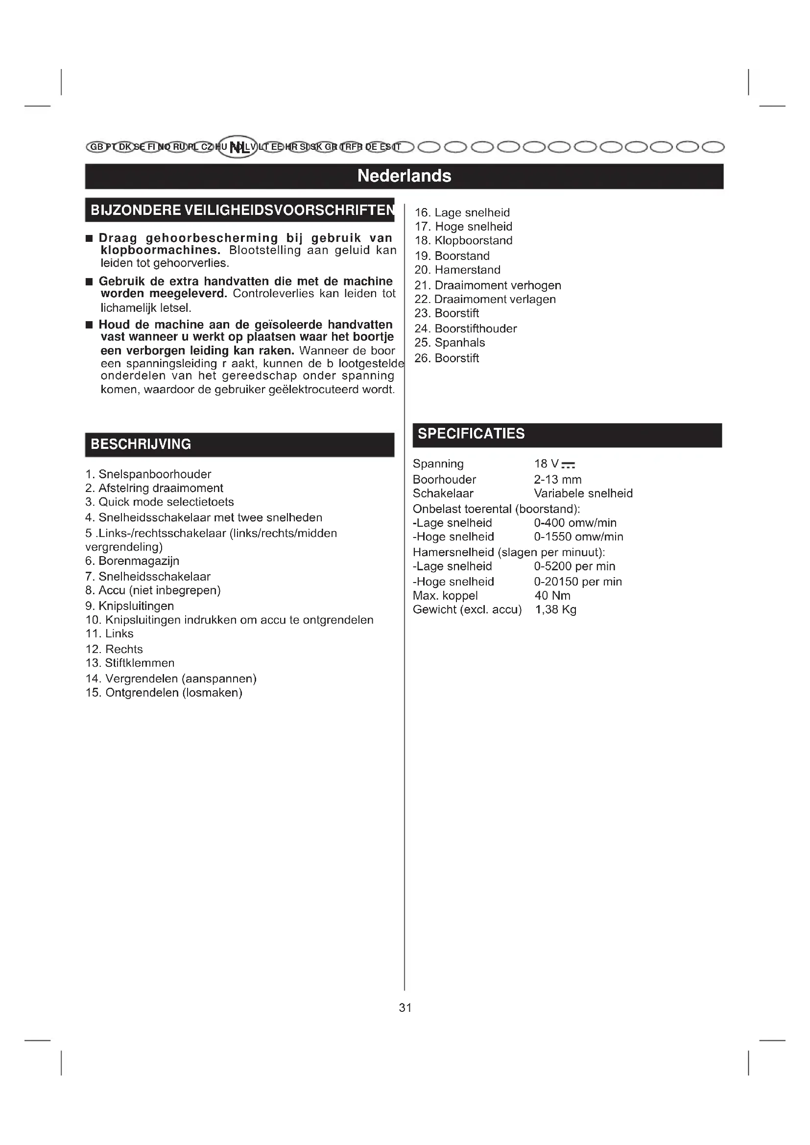 SPECIFICATIES Spanning 18 V Boorhouder 2-13 mm Schakelaar ariabele snelheid Onbelast toerental (boorstand): -Lage snelheid 0-400 omw/min -Hoge snelheid 0-1550 omw/min Hamersnelheid (slagen per minuut): -Lage snelheid 0-5200 per min -Hoge snelheid 0-20150 per min Max. koppel 40 Nm Gewicht (excl. accu) 1,38 Kg V32 Nederlands