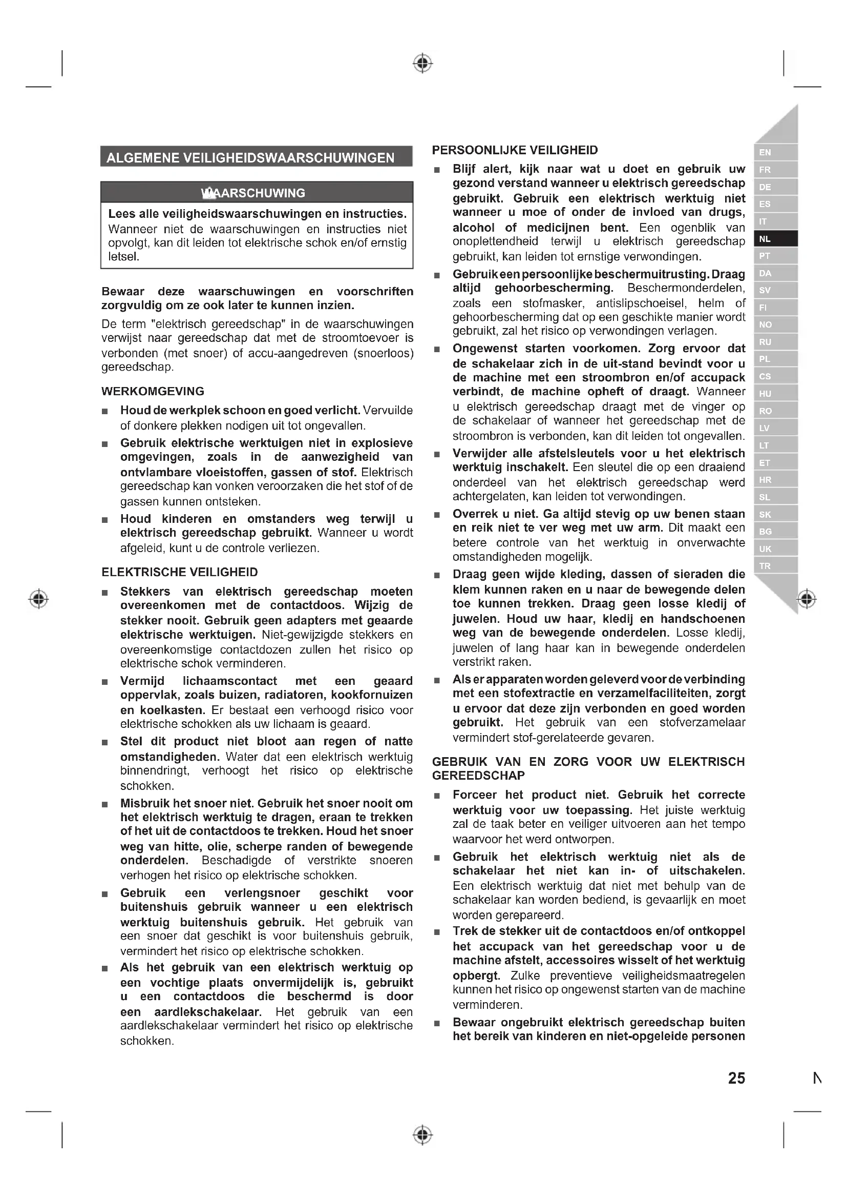 ALGEMENE VEILIGHEIDSWAARSCHUWINGEN WAARSCHUWING Lees alle veiligheidswaarschuwingen en instructies. Wanneer niet de waarschuwingen en instructies niet opvolgt, kan dit leiden tot elektrische schok en/of ernstig letsel. Bewaar deze waarschuwingen en voorschriften zorgvuldig om ze ook later te kunnen inzien. De term "elektrisch gereedschap" in de waarschuwingen verwijst naar gereedschap dat met de stroomtoevoer is verbonden (met snoer) of accu-aangedreven (snoerloos) gereedschap. WERKOMGEVING ■ Houd de werkplek schoon en goed verlicht. Vervuilde of donkere plekken nodigen uit tot ongevallen. ■ Gebruik elektrische werktuigen niet in explosieve omgevingen, zoals in de aanwezigheid van ontvlambare vloeistoffen, gassen of stof. Elektrisch gereedschap kan vonken veroorzaken die het stof of de gassen kunnen ontsteken. ■ Houd kinderen en omstanders weg terwijl u elektrisch gereedschap gebruikt. Wanneer u wordt afgeleid, kunt u de controle verliezen. ELEKTRISCHE VEILIGHEID ■ Stekkers van elektrisch gereedschap moeten overeenkomen met de contactdoos. Wijzig de stekker nooit. Gebruik geen adapters met geaarde elektrische werktuigen. Niet-gewijzigde stekkers en overeenkomstige contactdozen zullen het risico op elektrische schok verminderen. ■ Vermijd lichaamscontact met een geaard oppervlak, zoals buizen, radiatoren, kookfornuizen en koelkasten. Er bestaat een verhoogd risico voor elektrische schokken als uw lichaam is geaard. ■ Stel dit product niet bloot aan regen of natte omstandigheden. Water dat een elektrisch werktuig binnendringt, verhoogt het risico op elektrische schokken. ■ Misbruik het snoer niet. Gebruik het snoer nooit om het elektrisch werktuig te dragen, eraan te trekken of het uit de contactdoos te trekken. Houd het snoer weg van hitte, olie, scherpe randen of bewegende onderdelen. Beschadigde of verstrikte snoeren verhogen het risico op elektrische schokken. ■ Gebruik een verlengsnoer geschikt voor buitenshuis gebruik wanneer u een elektrisch werktuig buitenshuis gebruik. Het gebruik van een snoer dat geschikt is voor buitenshuis gebruik, vermindert het risico op elektrische schokken. ■ Als het gebruik van een elektrisch werktuig op een vochtige plaats onvermijdelijk is, gebruikt u een contactdoos die beschermd is door een aardlekschakelaar. Het gebruik van een aardlekschakelaar vermindert het risico op elektrische schokken. PERSOONLIJKE VEILIGHEID ■ Blijf alert, kijk naar wat u doet en gebruik uw gezond verstand wanneer u elektrisch gereedschap gebruikt. Gebruik een elektrisch werktuig niet wanneer u moe of onder de invloed van drugs, alcohol of medicijnen bent. Een ogenblik van onoplettendheid terwijl u elektrisch gereedschap gebruikt, kan leiden tot ernstige verwondingen. ■ Gebruik een persoonlijke beschermuitrusting. Draag altijd gehoorbescherming. Beschermonderdelen, zoals een stofmasker, antislipschoeisel, helm of gehoorbescherming dat op een geschikte manier wordt gebruikt, zal het risico op verwondingen verlagen. ■ Ongewenst starten voorkomen. Zorg ervoor dat de schakelaar zich in de uit-stand bevindt voor u de machine met een stroombron en/of accupack verbindt, de machine opheft of draagt. Wanneer u elektrisch gereedschap draagt met de vinger op de schakelaar of wanneer het gereedschap met de stroombron is verbonden, kan dit leiden tot ongevallen. ■ Verwijder alle afstelsleutels voor u het elektrisch werktuig inschakelt. Een sleutel die op een draaiend onderdeel van het elektrisch gereedschap werd achtergelaten, kan leiden tot verwondingen. ■ Overrek u niet. Ga altijd stevig op uw benen staan en reik niet te ver weg met uw arm. Dit maakt een betere controle van het werktuig in onverwachte omstandigheden mogelijk. ■ Draag geen wijde kleding, dassen of sieraden die klem kunnen raken en u naar de bewegende delen toe kunnen trekken. Draag geen losse kledij of juwelen. Houd uw haar, kledij en handschoenen weg van de bewegende onderdelen. Losse kledij, juwelen of lang haar kan in bewegende onderdelen verstrikt raken. ■ Als er apparaten worden geleverd voor de verbinding met een stofextractie en verzamelfaciliteiten, zorgt u ervoor dat deze zijn verbonden en goed worden gebruikt. Het gebruik van een stofverzamelaar vermindert stof-gerelateerde gevaren. GEBRUIK VAN EN ZORG VOOR UW ELEKTRISCH GEREEDSCHAP ■ Forceer het product niet. Gebruik het correcte werktuig voor uw toepassing. Het juiste werktuig zal de taak beter en veiliger uitvoeren aan het tempo waarvoor het werd ontworpen. ■ Gebruik het elektrisch werktuig niet als de schakelaar het niet kan in- of uitschakelen. Een elektrisch werktuig dat niet met behulp van de schakelaar kan worden bediend, is gevaarlijk en moet worden gerepareerd. ■ Trek de stekker uit de contactdoos en/of ontkoppel het accupack van het gereedschap voor u de machine afstelt, accessoires wisselt of het werktuig opbergt. Zulke preventieve veiligheidsmaatregelen kunnen het risico op ongewenst starten van de machine verminderen. ■ Bewaar ongebruikt elektrisch gereedschap buiten het bereik van kinderen en niet-opgeleide personen26 | Nederlands die het gereedschap of deze gebruiksaanwijzingen niet kennen. Elektrisch gereedschap is gevaarlijk in de handen van niet-opgeleide gebruikers. ■ Onderhoud elektrisch gereedschap. Controleer op verkeerde aflijning of verstrikt raken van bewegende delen, defecten van onderdelen en alle andere situaties die de werking van het werktuig kunnen beïnvloeden. Indien beschadigd, laat u het elektrisch gereedschap repareren voor gebruik. Veel ongevallen worden veroorzaakt door slecht onderhouden elektrische werktuigen. ■ Houd de zaagwerktuigen scherp en schoon. Correct onderhouden zaagwerktuigen met scherpe randen zijn minder geneigd om verstrikt te raken en kunnen makkelijker worden bestuurd. ■ Gebruik het werktuig, de accessoires en werktuigonderdelen, etc. in overeenstemming met deze instructies en houd rekening met de bedrijfsomstandigheden en het uit te voeren werk. Het gebruik va