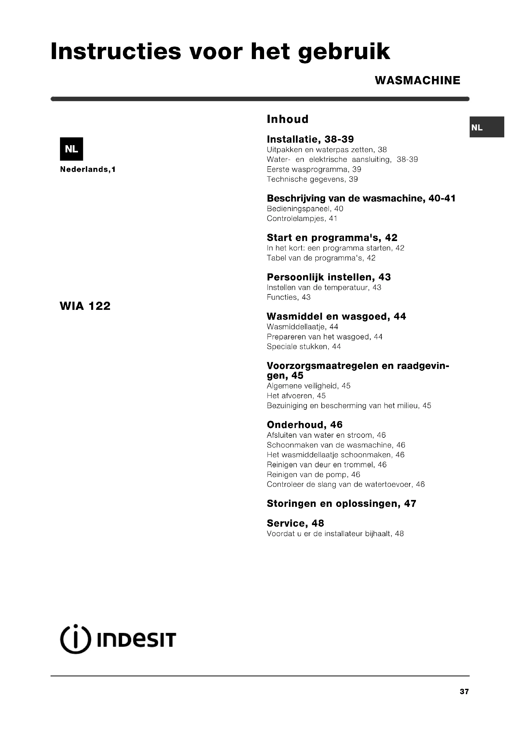 WASMACHINE WIA 122 Instructies voor het gebruik38