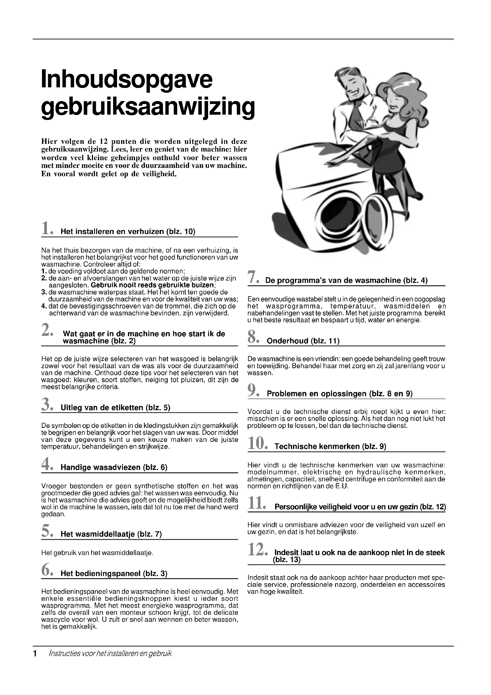 GBI nstructies voor het installeren en gebruik Hier volgen de 12 punten die worden uitgelegd in deze gebruiksaanwijzing. Lees, leer en geniet van de machine: hier worden veel kleine geheimpjes onthuld voor beter wassen met minder moeite en voor de duurzaamheid van uw machine. En vooral wordt gelet op de veiligheid